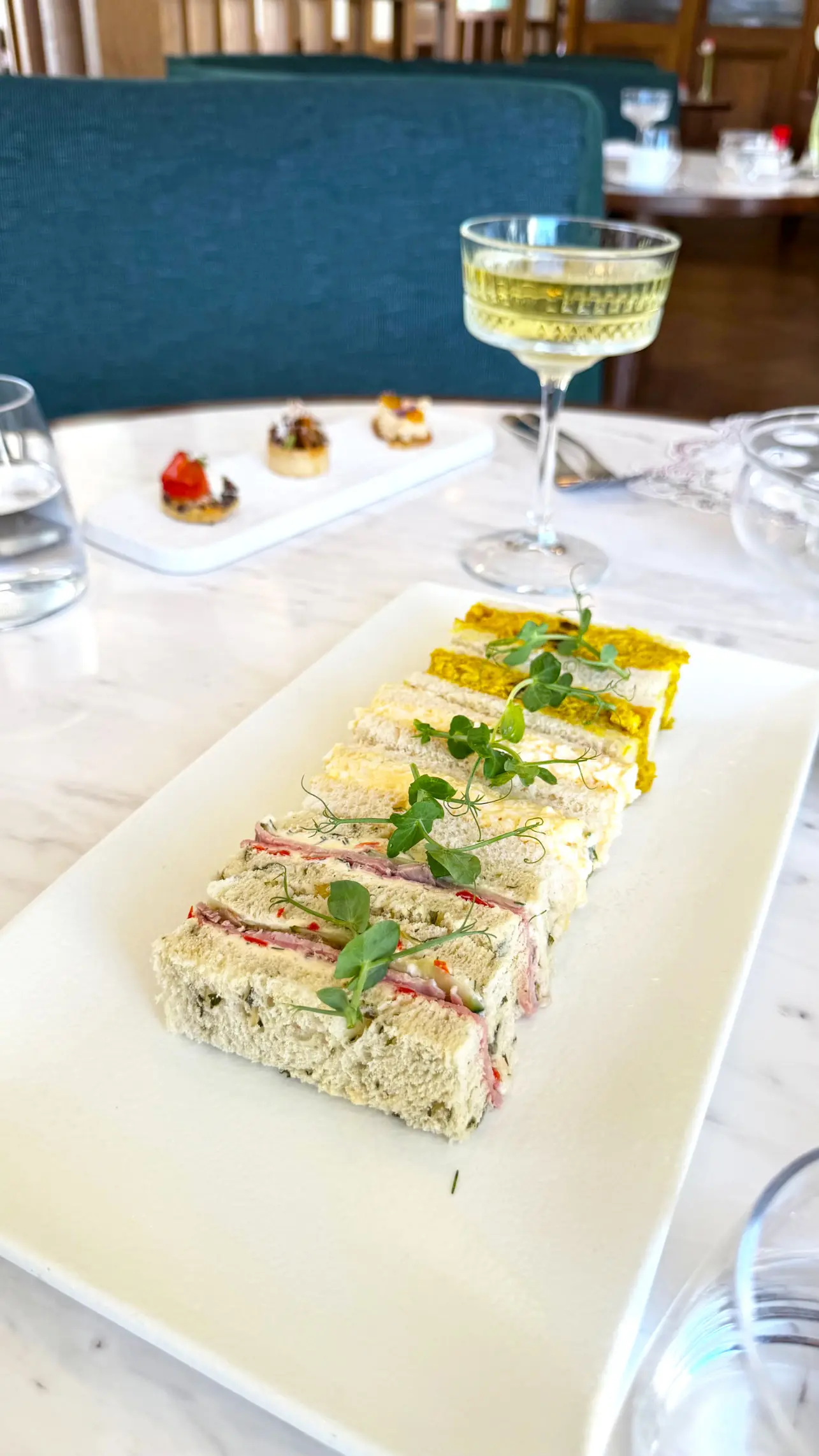 Os finger sandwiches são preparados em pães macios e frescos, cortados com precisão, trazendo recheios equilibrados: combinações cremosas contrastando com elementos crocantes, ervas frescas que realçam o sabor e temperos sutis que não sobrecarregam o paladar. Há também pequenas tortinhas e canapés que acrescentam textura e profundidade, criando uma abertura leve, e cheia de personalidade.