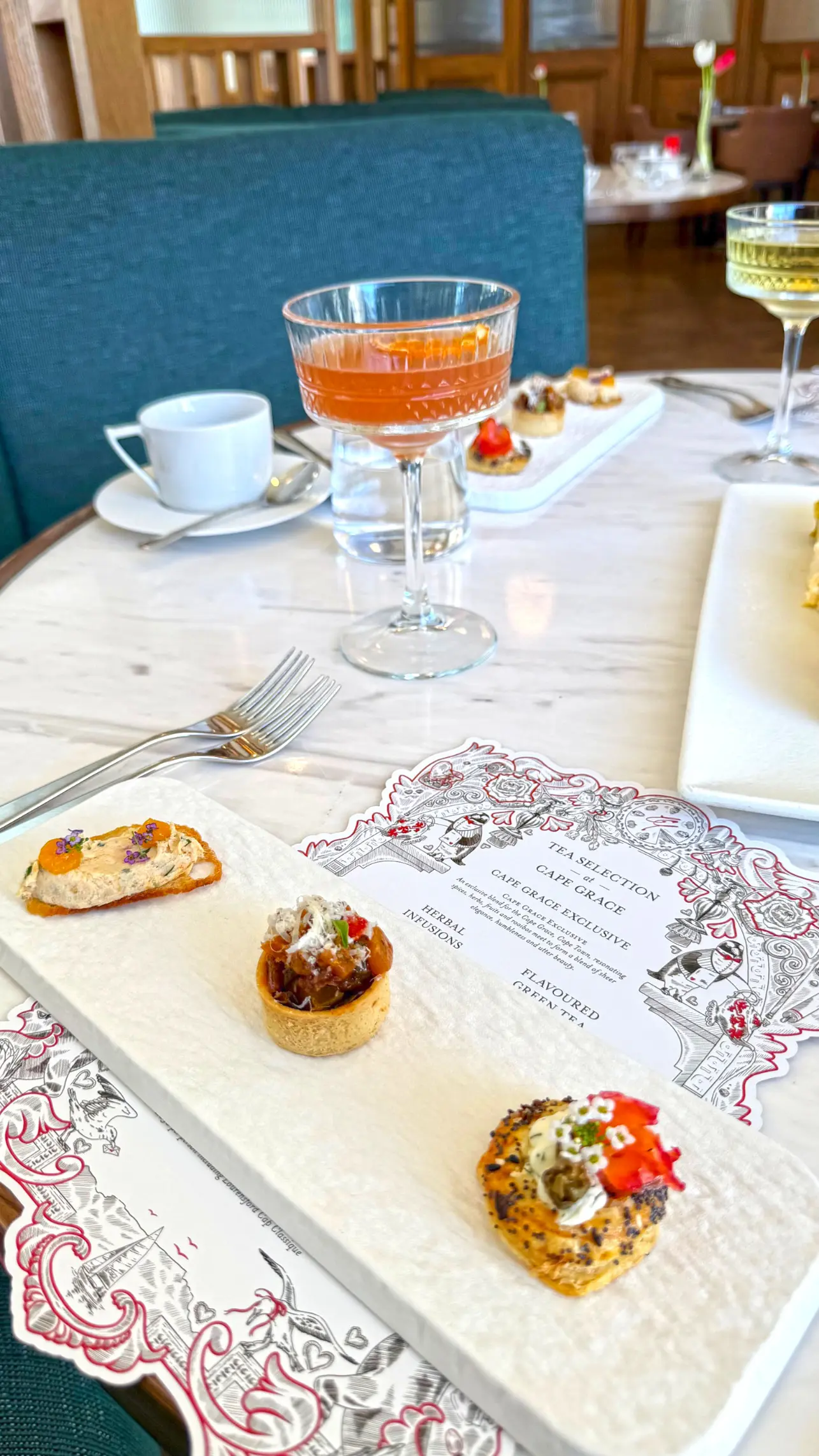 O Afternoon Tea no Cape Grace traduz perfeitamente a elegância clássica do ritual britânico, mas com identidade própria da Cidade do Cabo. A experiência é servida no restaurante Heirloom, com calma e precisão, convidando o visitante a apreciar o momento. O cenário, com vista para a marina e a Table Mountain ao fundo, complementa a proposta: não é apenas um chá, é uma pausa sofisticada em meio a uma das paisagens mais bonitas do mundo.