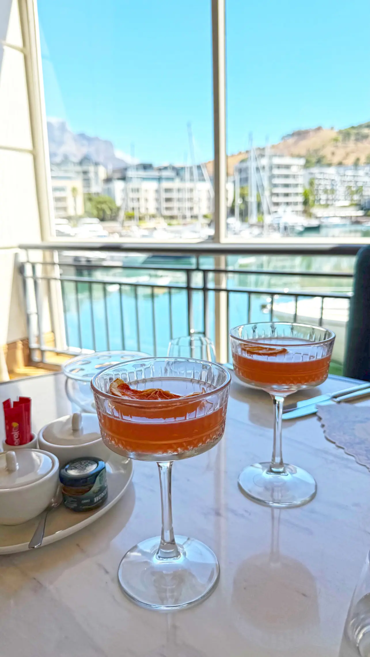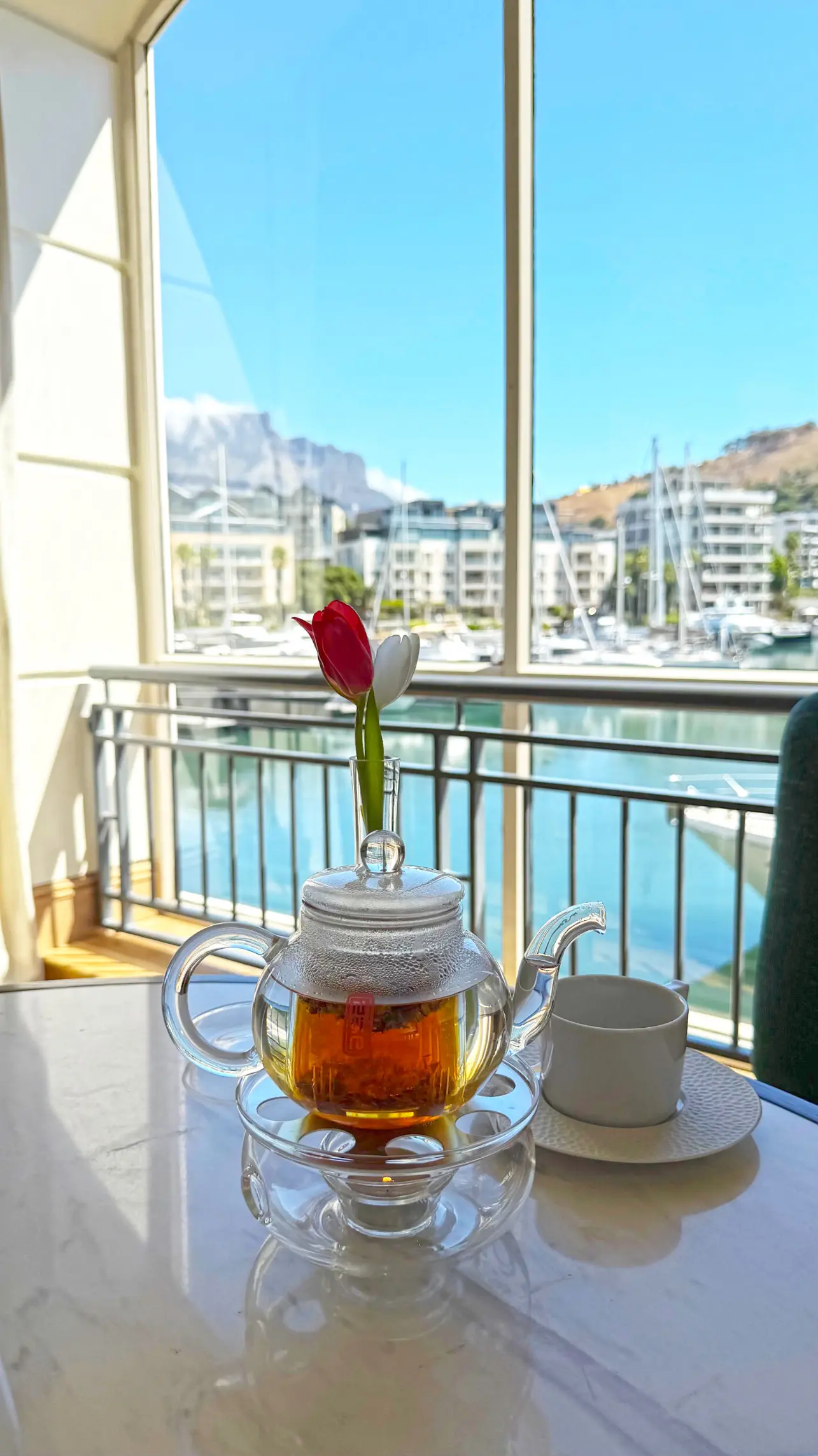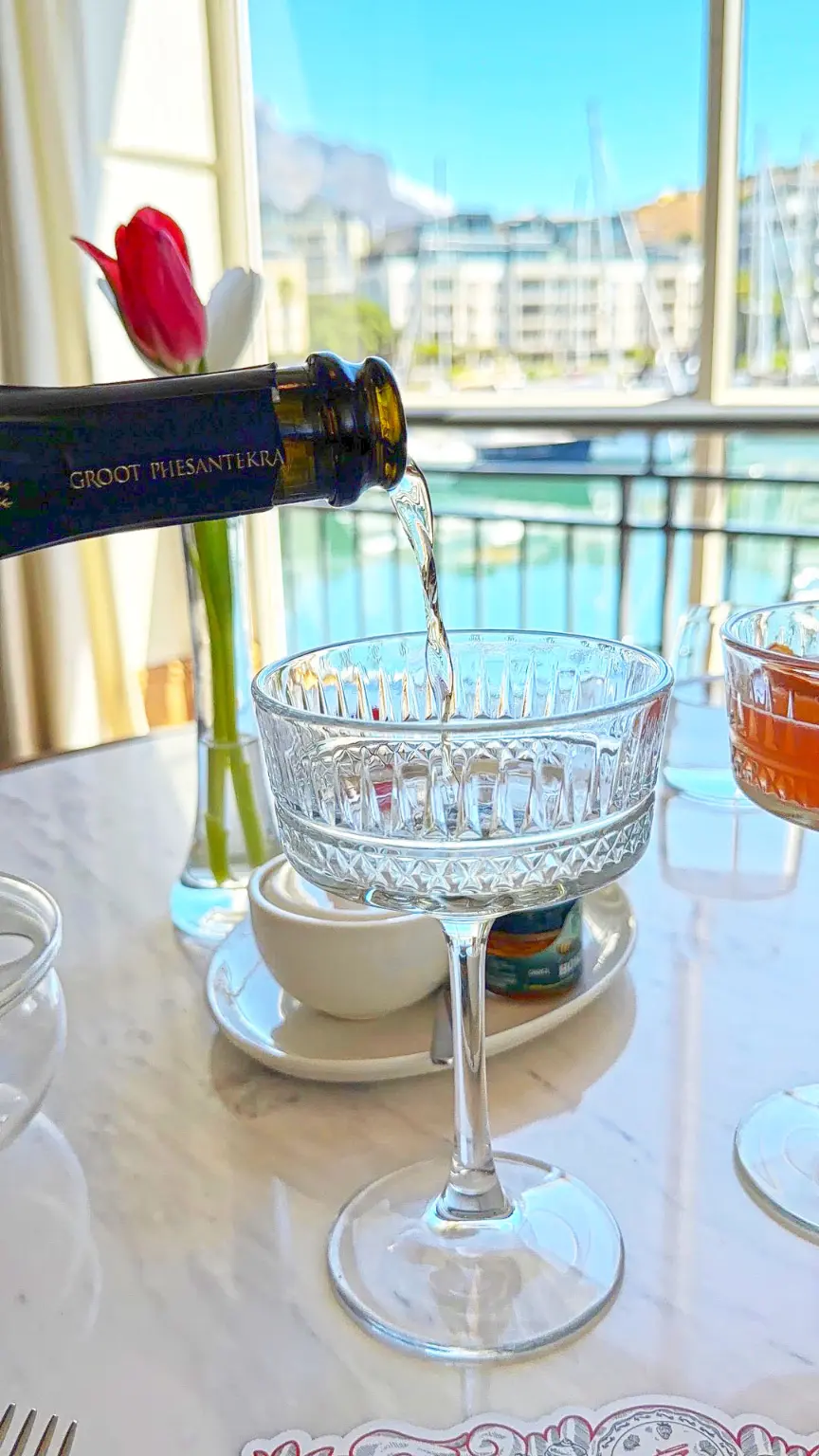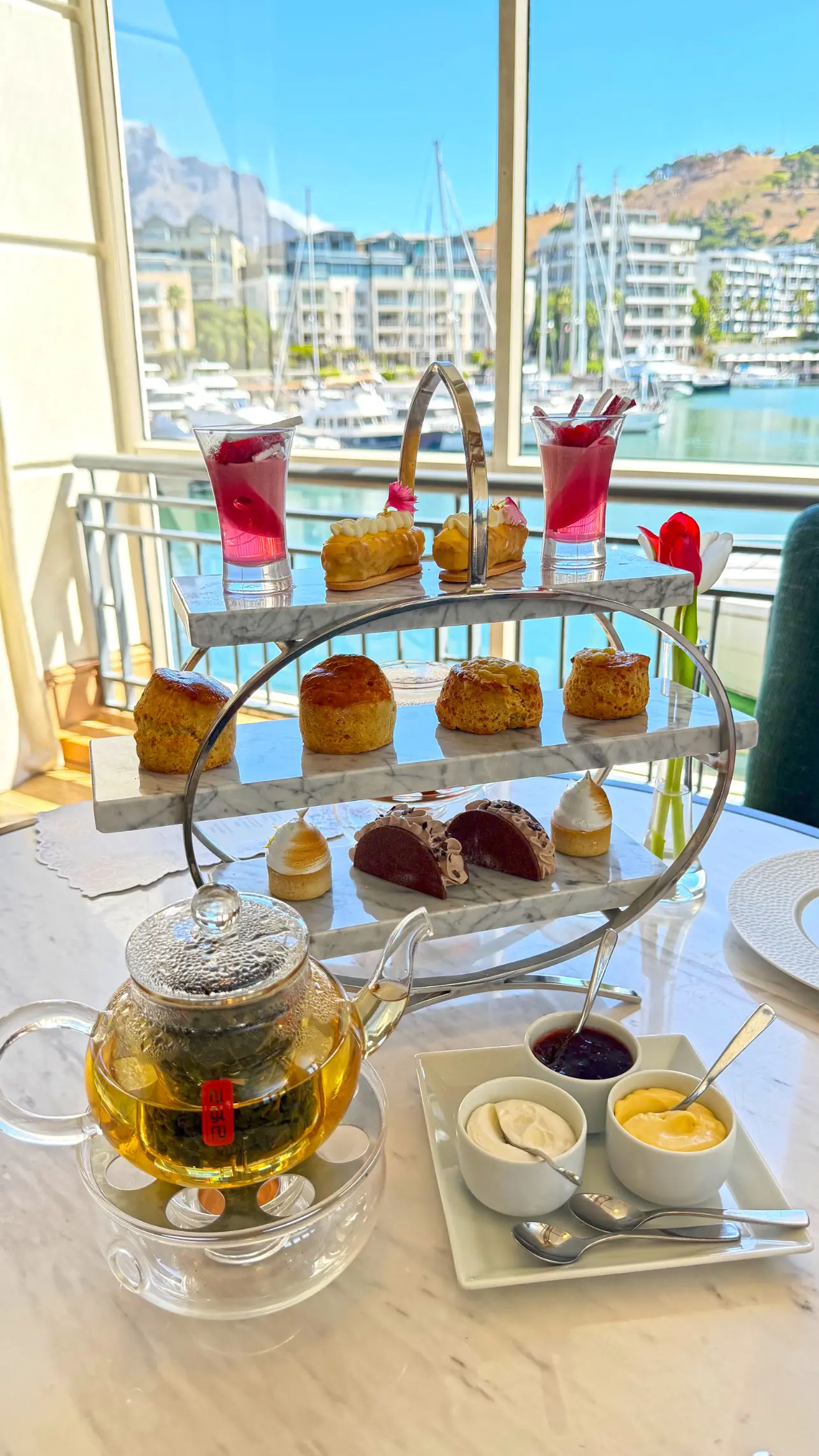 Uma pausa sofisticada à beira da marina da Cidade do Cabo, com scones, rooibos e vista para a Table Mountain