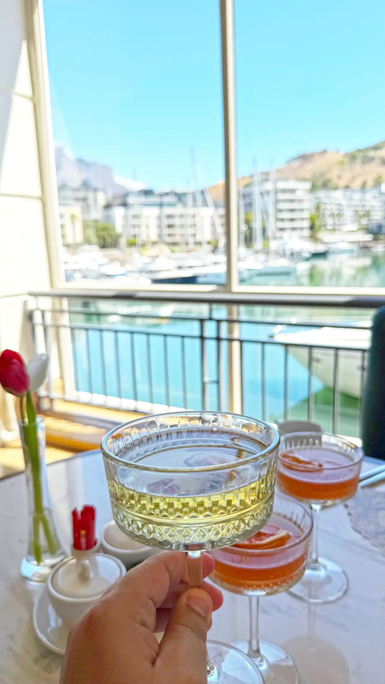O serviço foi atencioso e elegante, no ritmo certo para que pudéssemos relaxar e aproveitar cada detalhe. A equipe foi extremamente simpática e cordial, sempre presente na medida certa, explicando cada etapa do menu com gentileza e demonstrando verdadeiro orgulho da experiência que estavam oferecendo. O ambiente é simplesmente lindo, com vista privilegiada para a marina e a Table Mountain, criando um cenário que por si só já tornaria a tarde especial.
