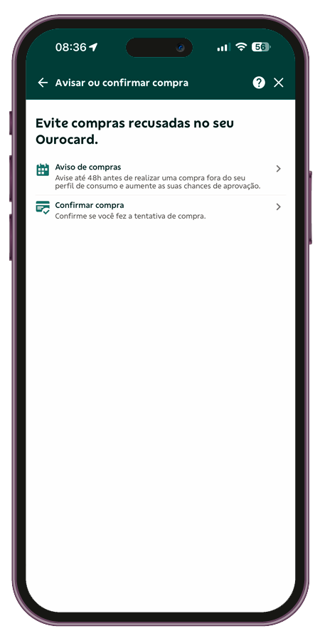 - Aviso de compra: insira o valor aproximado da transação e selecione o cartão que será utilizado.