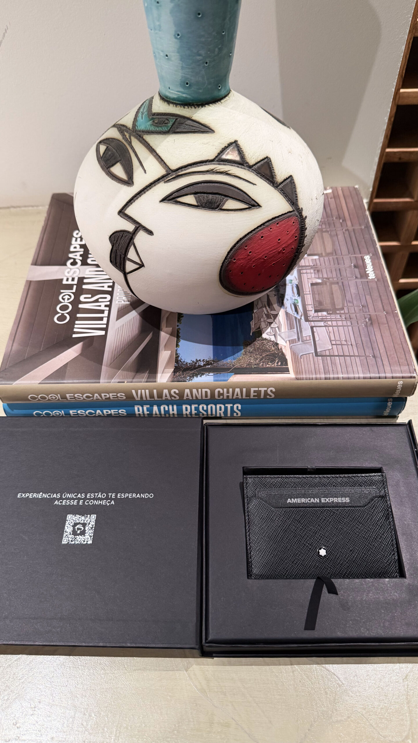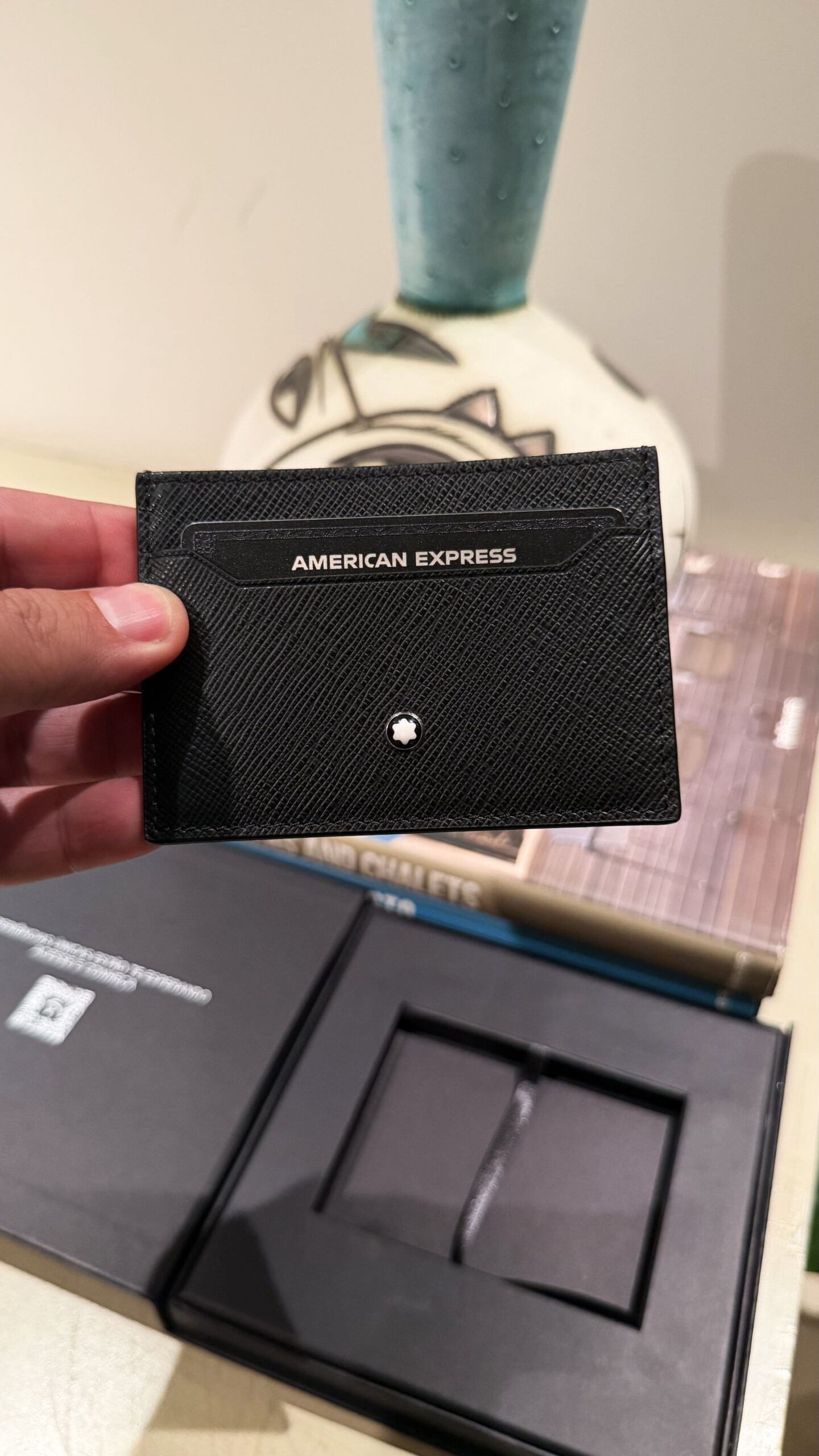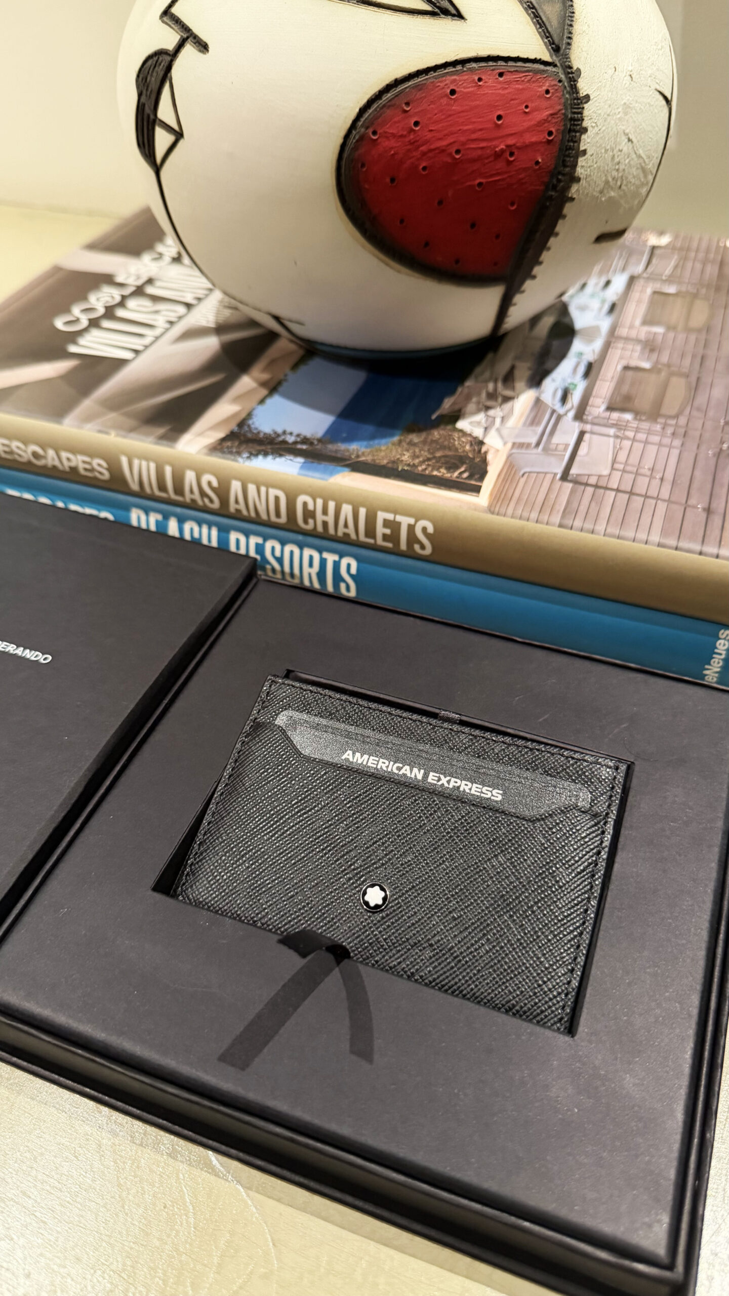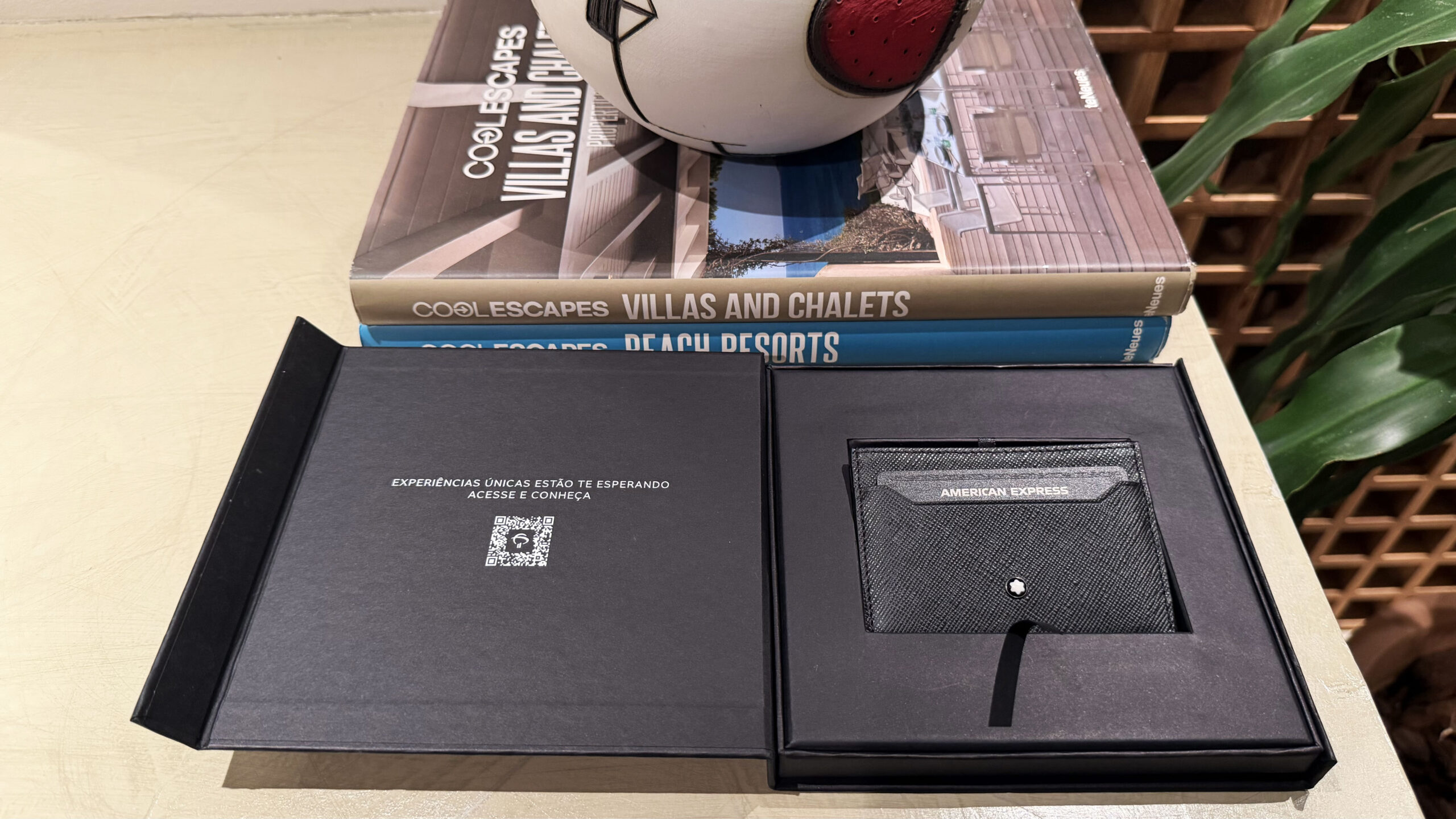 O kit de boas-vindas é entregue em uma caixa pequena e elegante. Ao abrir, o cartão vem acomodado em um porta cartões da Montblanc, reforçando desde o primeiro contato o posicionamento do produto.