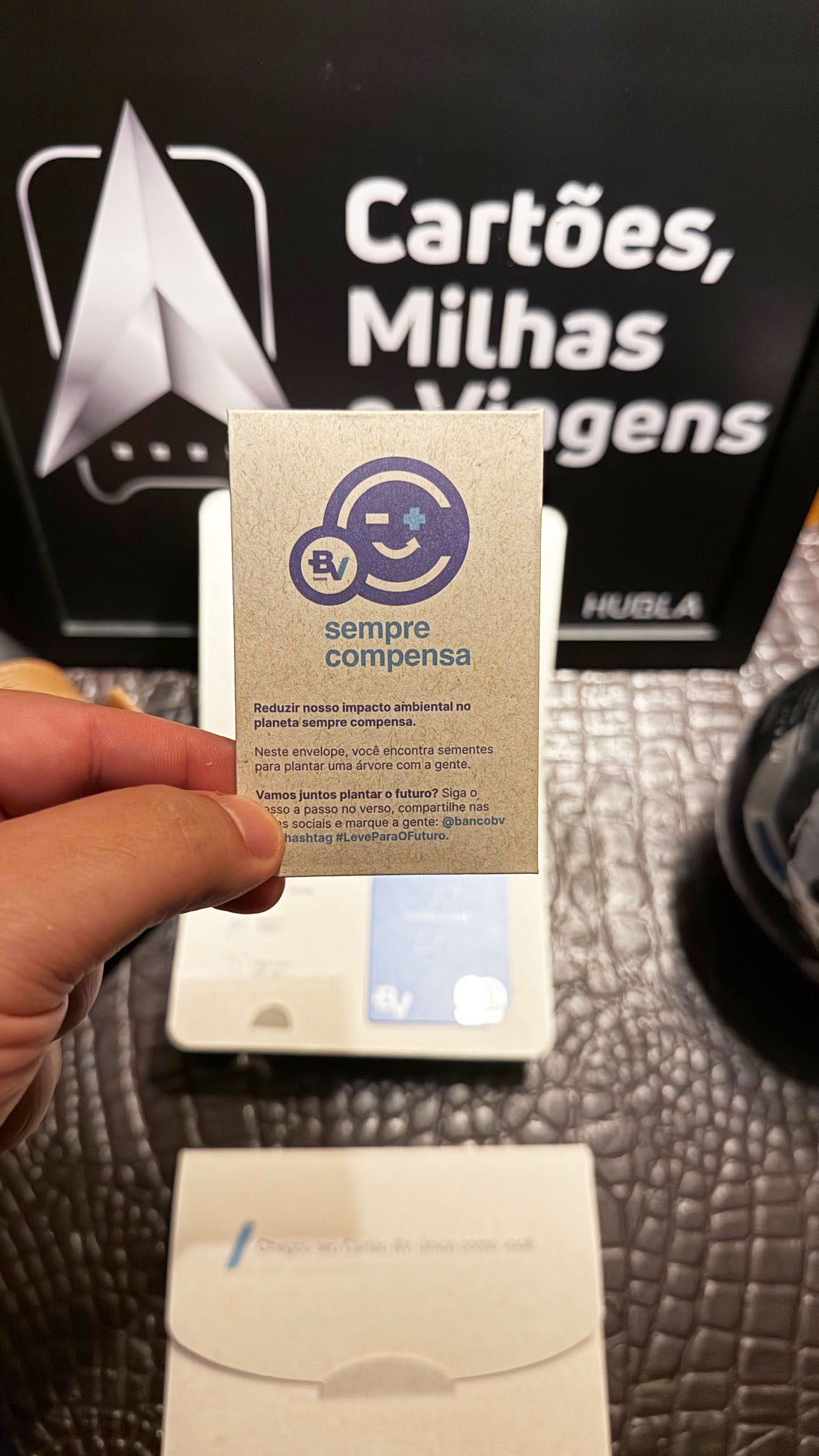 Recebi o kit de boas-vindas e, ao contrário da maioria, ele me surpreendeu de forma positiva. A proposta é sustentável, com embalagem em papel reciclado, e ainda traz um detalhe criativo: um pacotinho de sementes acompanhado do incentivo para plantar uma árvore. Uma ideia simples, mas que transmite cuidado e propósito, algo raro no mercado de cartões de crédito.