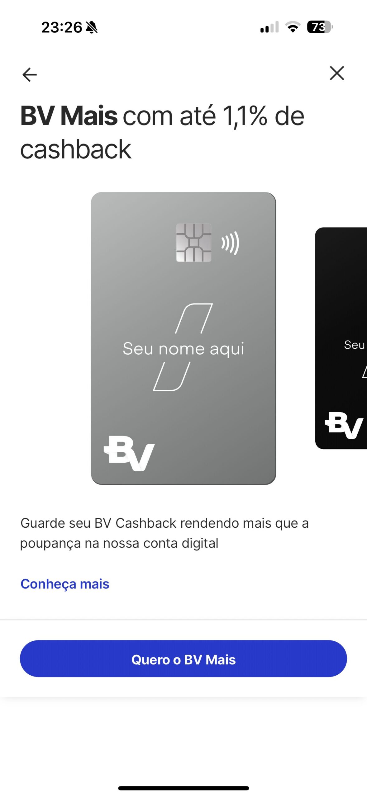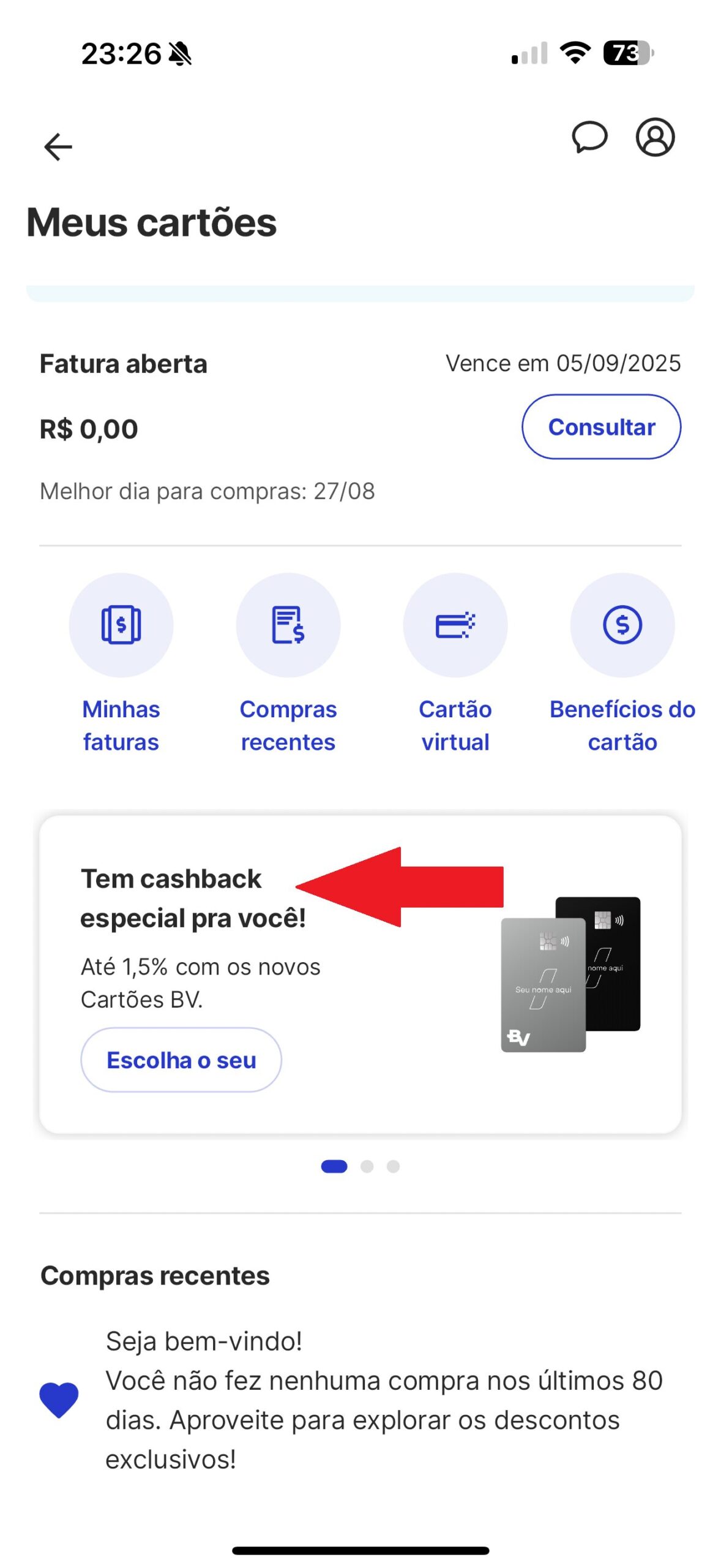 Para tentar o upgrade você precisa ter um cartão de crédito. Não pode ser a versão de débito, chamado BV Débito. Na tela inicial do cartão você vai descer a tela e clicar no banner dizendo que tem cashback para você.