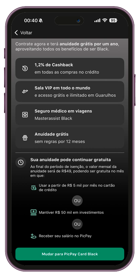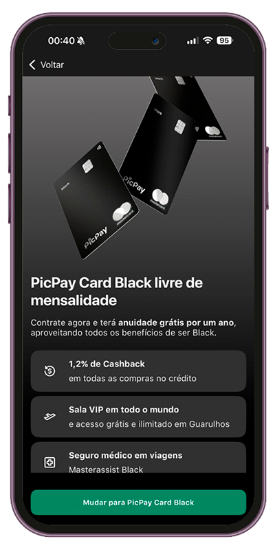 O PicPay está com uma campanha de isenção da anuidade do seu PicPay Card Mastercard Black, válida por um ano.