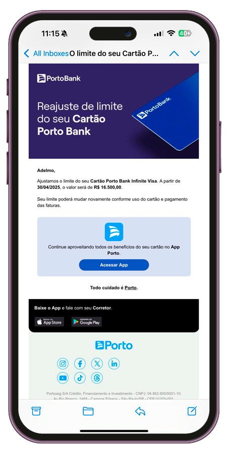 O Porto Bank sempre foi elogiado por mim por ser excelente para limites de crédito no cartão. Eu, por exemplo, comecei com R$ 30 mil em cada cartão e hoje tenho R$ 260 mil no Porto Bank Visa Infinite e mais R$ 260 mil no Porto Bank Mastercard Black.