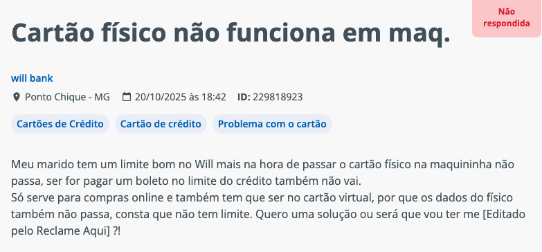 O will bank é uma fintech que oferece cartão de crédito sem anuidade. Apesar de não possuir grandes benefícios, pode ser uma alternativa para quem está começando no mundo dos cartões de crédito. No entanto, mesmo sendo um produto simples, é esperado que funcione corretamente. O problema é que isso não aconteceu. Diversas falhas em momentos diferentes causaram constrangimento ao cliente, mesmo com limite de crédito disponível para uso.