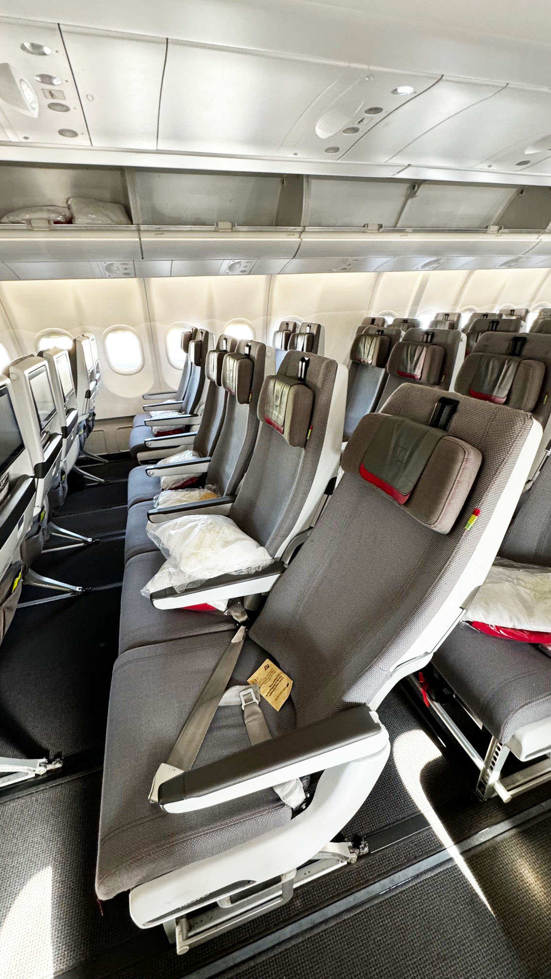 Assentos funcionais, cada um com tela individual, entrada USB e tomadas. Boa opção para quem quer economizar sem abrir mão do básico em um voo transatlântico.