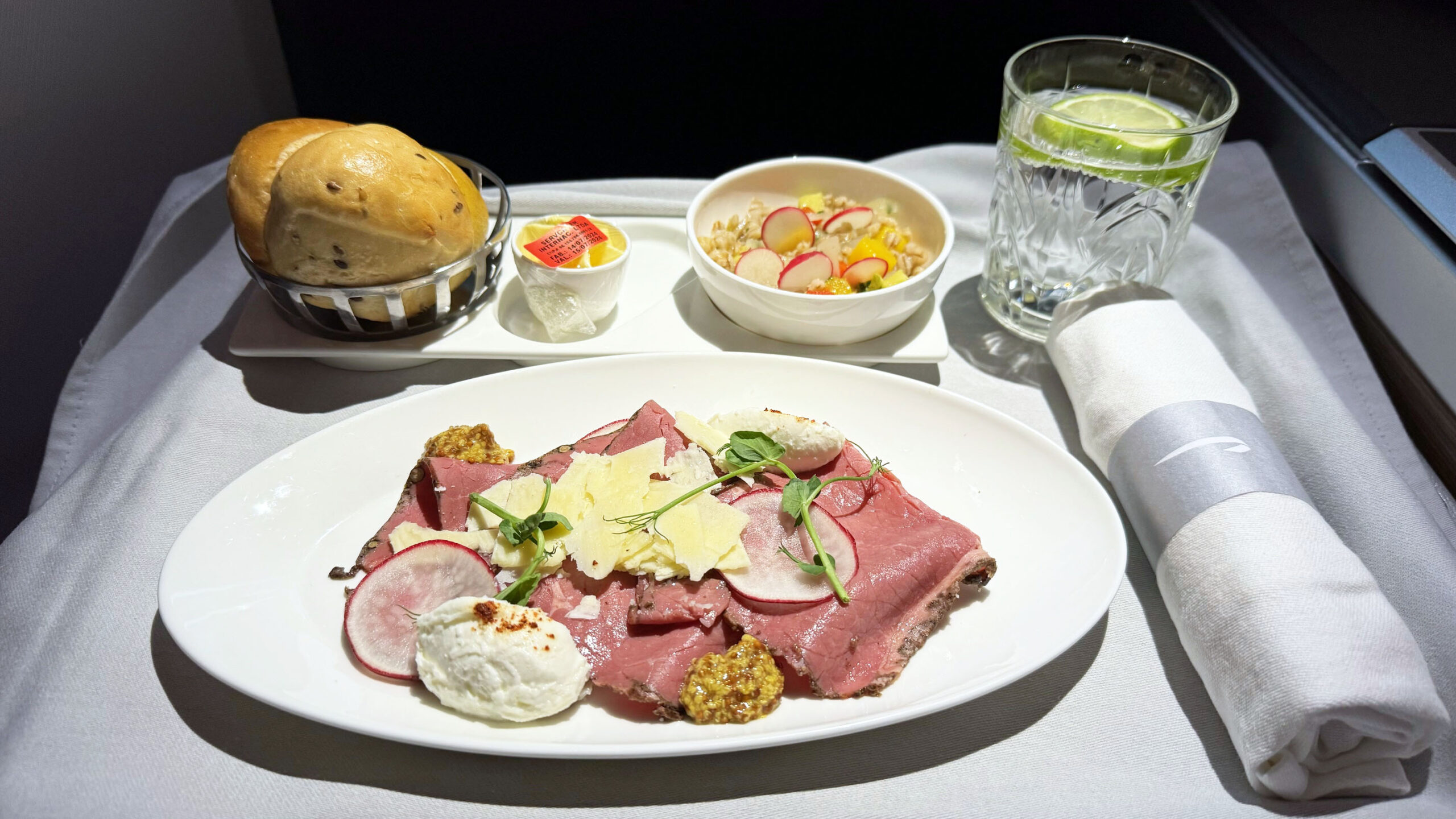 Durante o voo, fiquei surpreso com a qualidade do serviço de bordo da British Airways. A refeição começou com uma entrada de rosbife fatiado com lascas de parmesão, rabanete e creme fresco, acompanhada de salada de grãos e pães ainda quentes. A apresentação lembrava muito a de um restaurante, com louça branca elegante e copo de cristal.