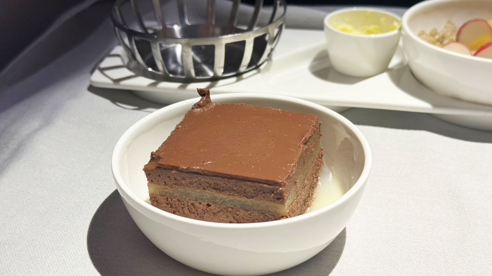 No prato principal, escolhi o filé ao molho com batatas rústicas, tomates assados e legumes, que estava bem servido e saboroso. Para encerrar, a sobremesa de chocolate tinha textura cremosa e fechou a refeição de forma marcante. No geral, achei a experiência gastronômica consistente, equilibrando sofisticação e conforto em pleno voo.