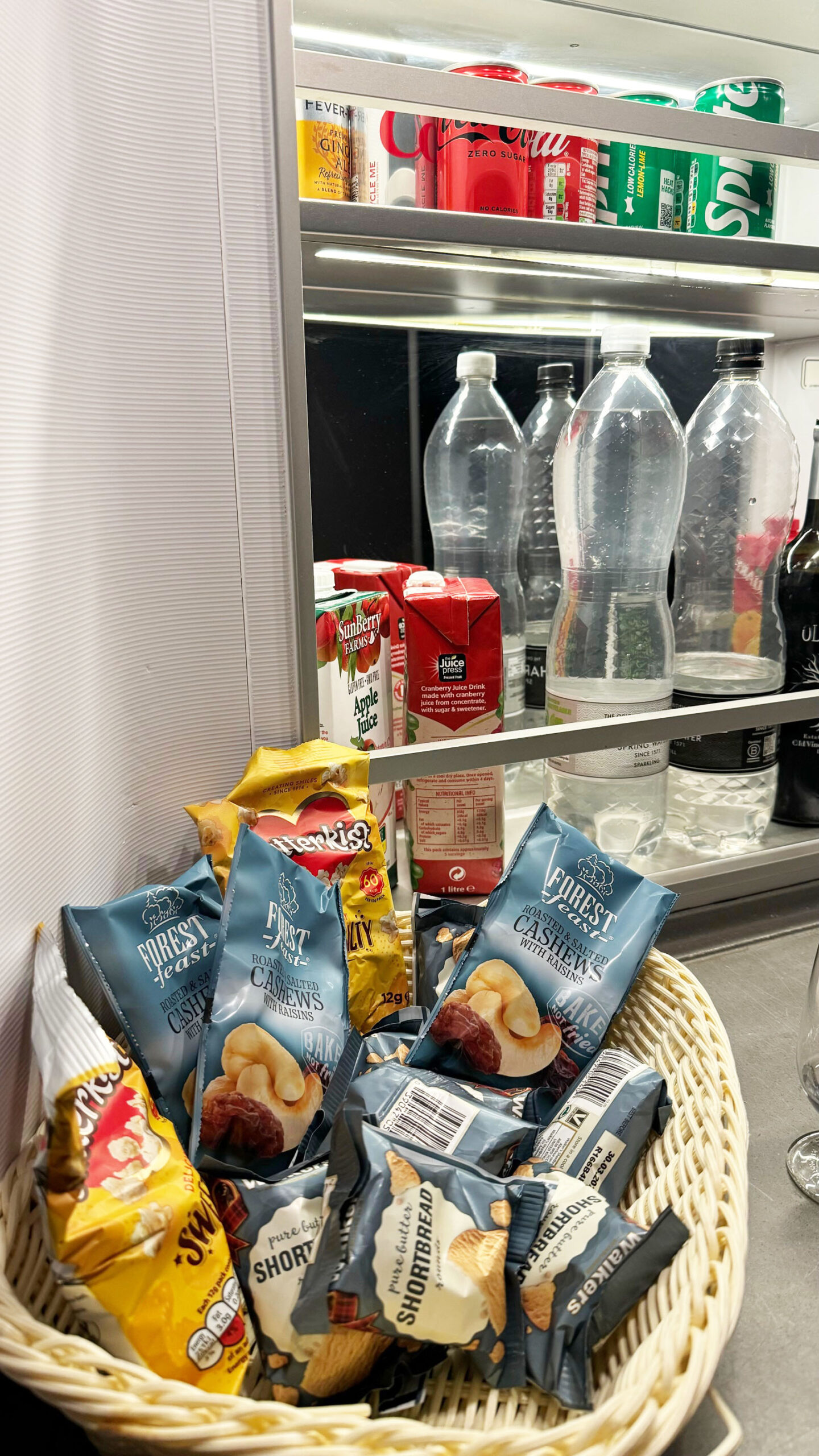 Se você sentir fome durante o voo pode ir até o bar, onde há snacks e bebidas à vontade.