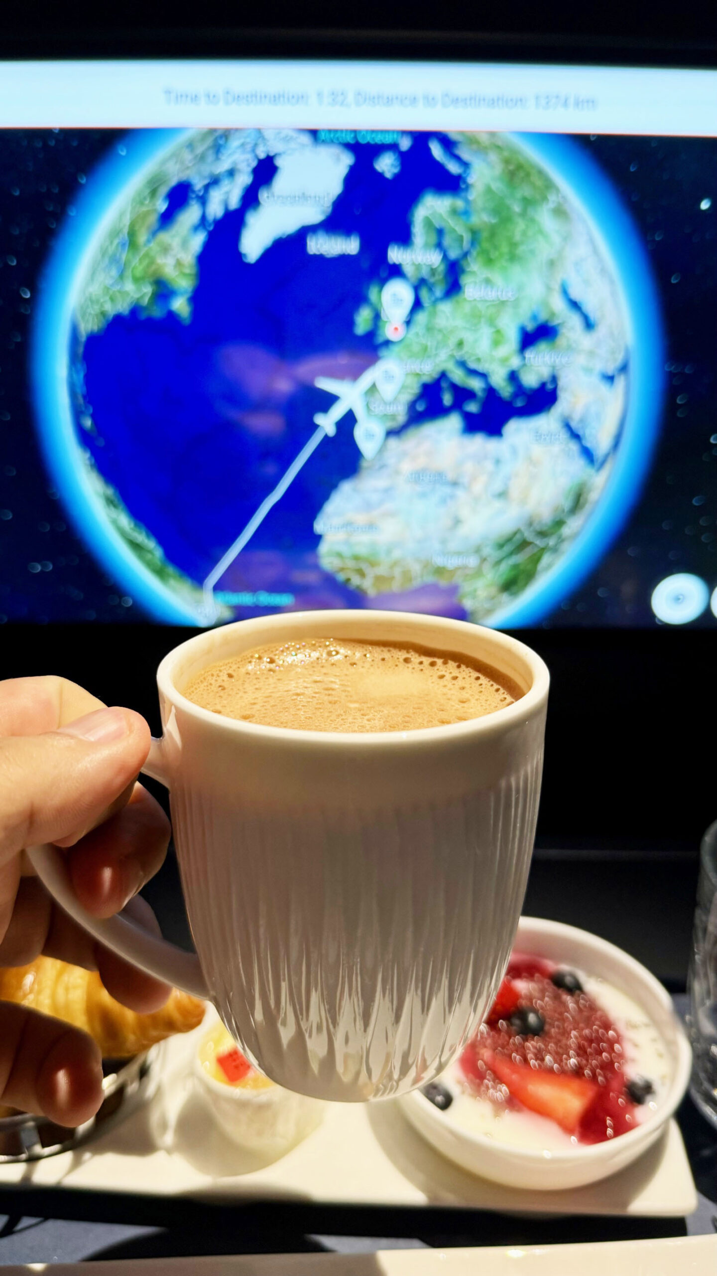 Em seguida, foi oferecida uma opção quente com omelete, aspargos, tomate grelhado e batatas assadas. Acompanhado de um café cremoso servido em louça de porcelana, o conjunto reforçou a experiência premium. O cardápio, embora simples, foi bem executado, garantindo energia e conforto para os passageiros iniciarem a chegada ao destino de forma agradável.