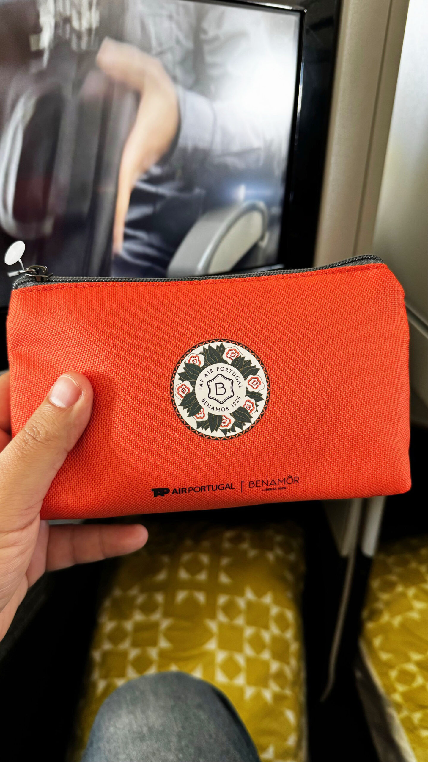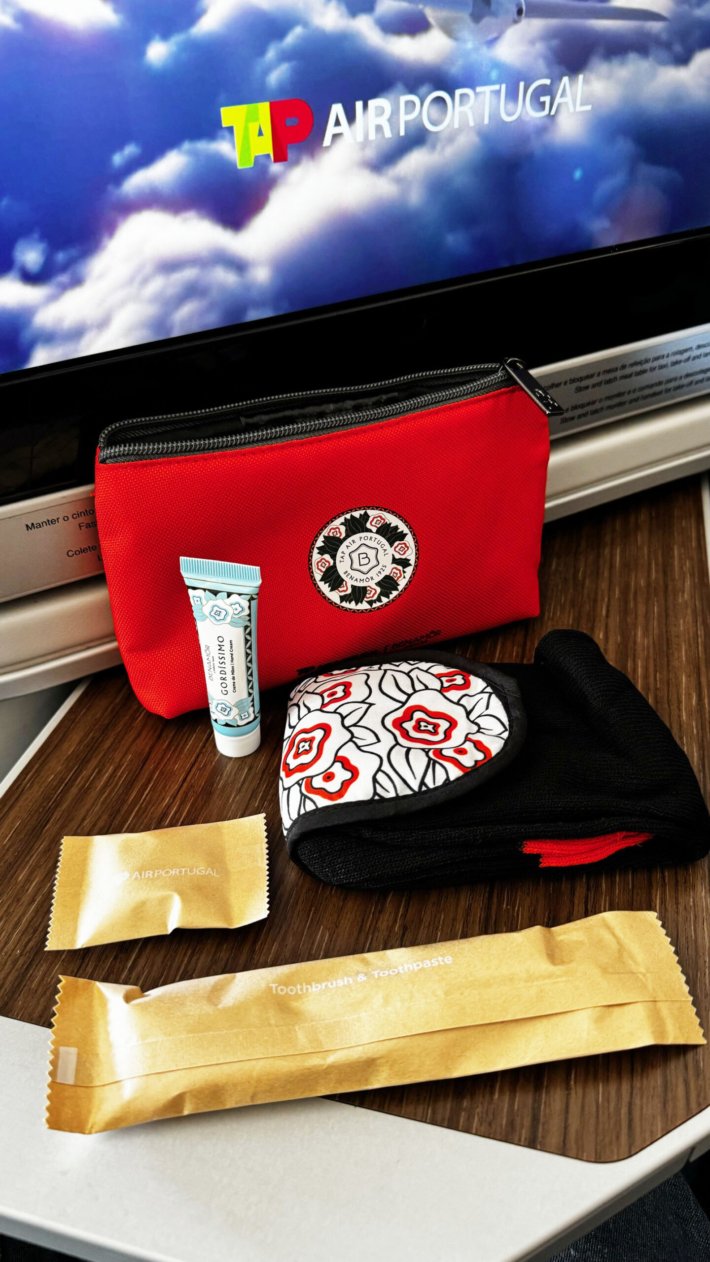 O amenity kit da TAP, em parceria com a Benamôr 1925, vem em uma nécessaire vermelha simples e funcional. Dentro, inclui itens básicos como meias, máscara de dormir, escova e pasta de dentes, além de um pequeno creme da marca. Cumpre o essencial, mas sem grandes diferenciais em relação a outras companhias.
