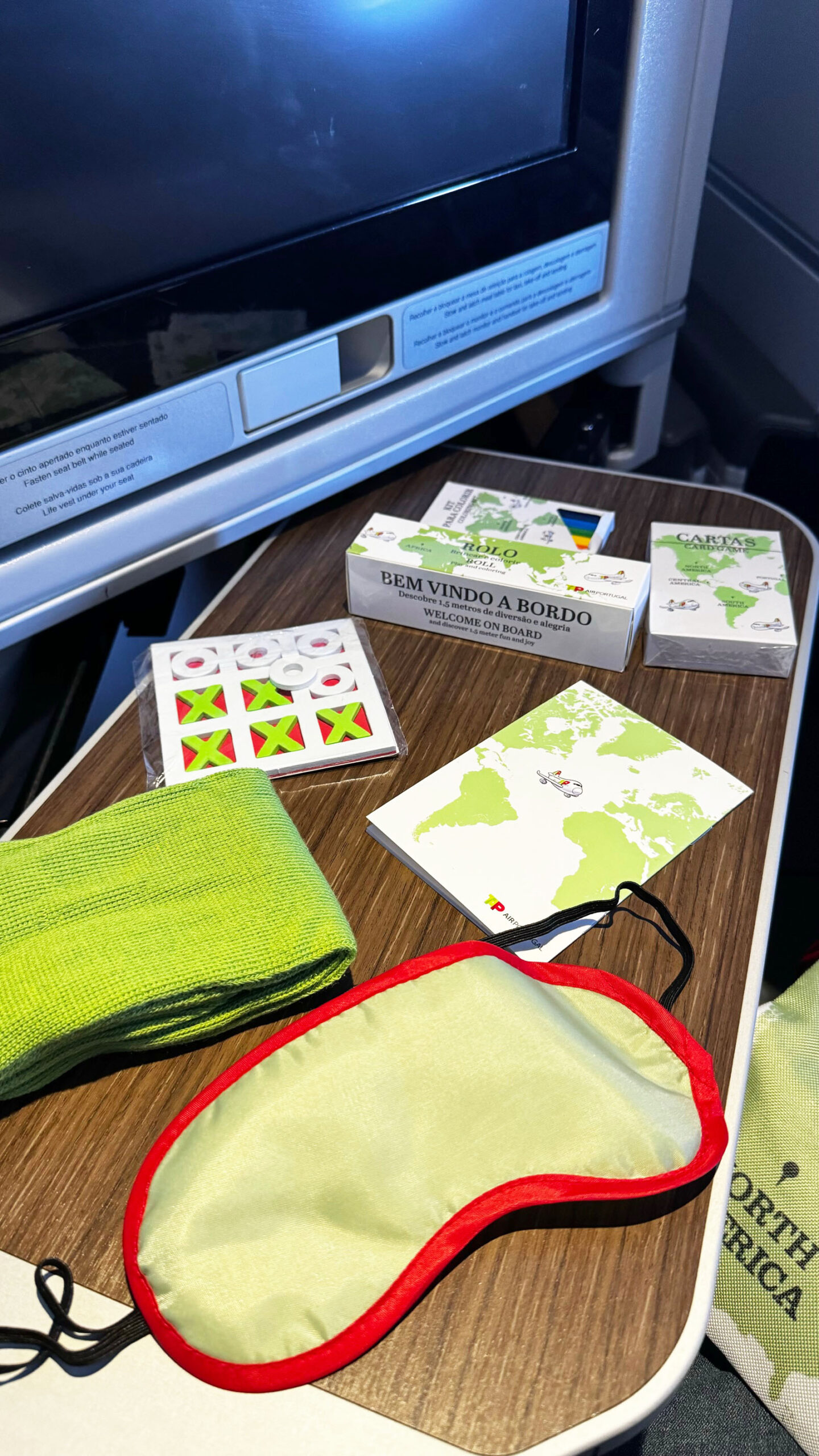 A versão infantil do amenity kit da TAP é simples, mas divertida. A nécessaire vem com estampa de mapa-múndi e aviões da companhia, o que já chama a atenção das crianças. Dentro, além da máscara de dormir e das meias coloridas, há joguinhos como cartas, jogo da velha e atividades impressas, pensados para entreter durante o voo. É um kit básico, mas cumpre bem a função de distrair os pequenos e deixar a viagem mais agradável.