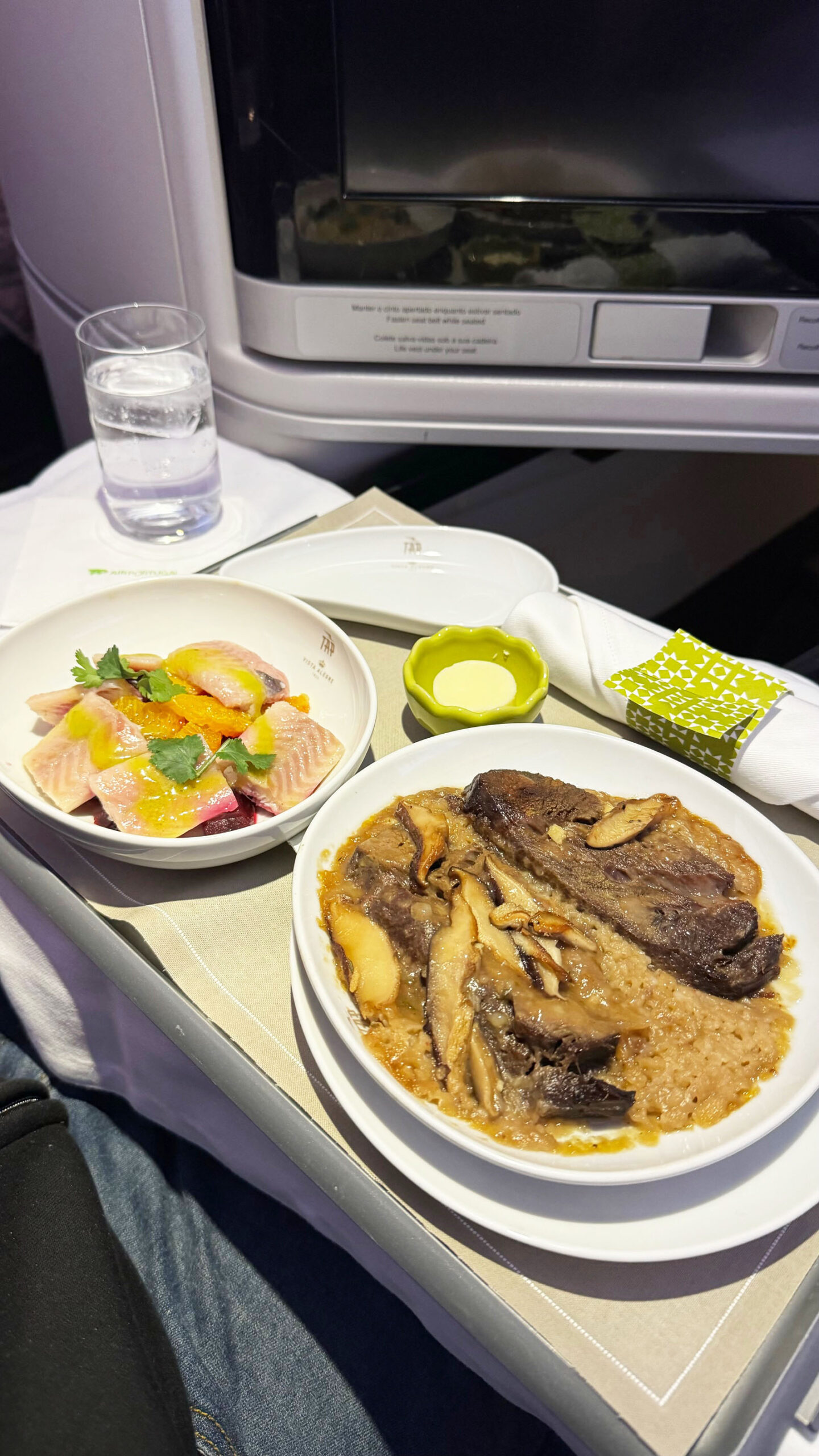 Como entrada, um prato leve de peixe marinado com citrinos e beterraba, trazendo frescor e acidez equilibrada. Já como prato principal, a escolha foi carne cozida lentamente, acompanhada de cogumelos e um arroz cremoso que lembra bastante um risoto. A combinação oferece contraste interessante: de um lado, um prato frio e refrescante; do outro, uma opção quente e mais robusta, pensada para agradar diferentes paladares durante o voo.
