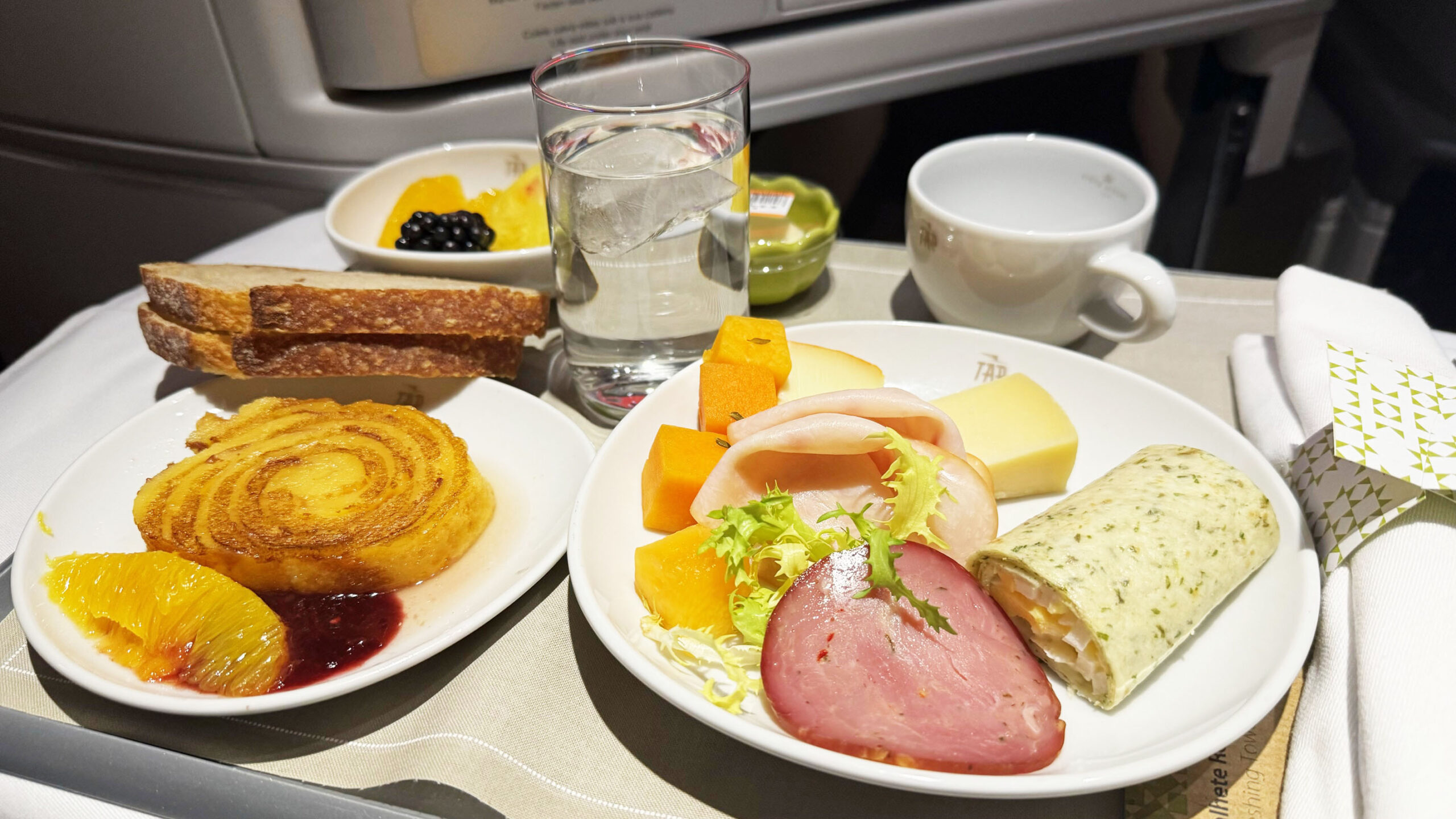 Antes da chegada foi servida mais uma refeição, que traz uma combinação simples, mas variada. O prato principal inclui frios (como peito de peru e presunto), queijos, frutas frescas e um wrap frio recheado de queijo e vegetais. Para acompanhar, pão, bolo em fatia com compota e gomos de laranja. A refeição é finalizada com frutas adicionais e bebida à escolha.