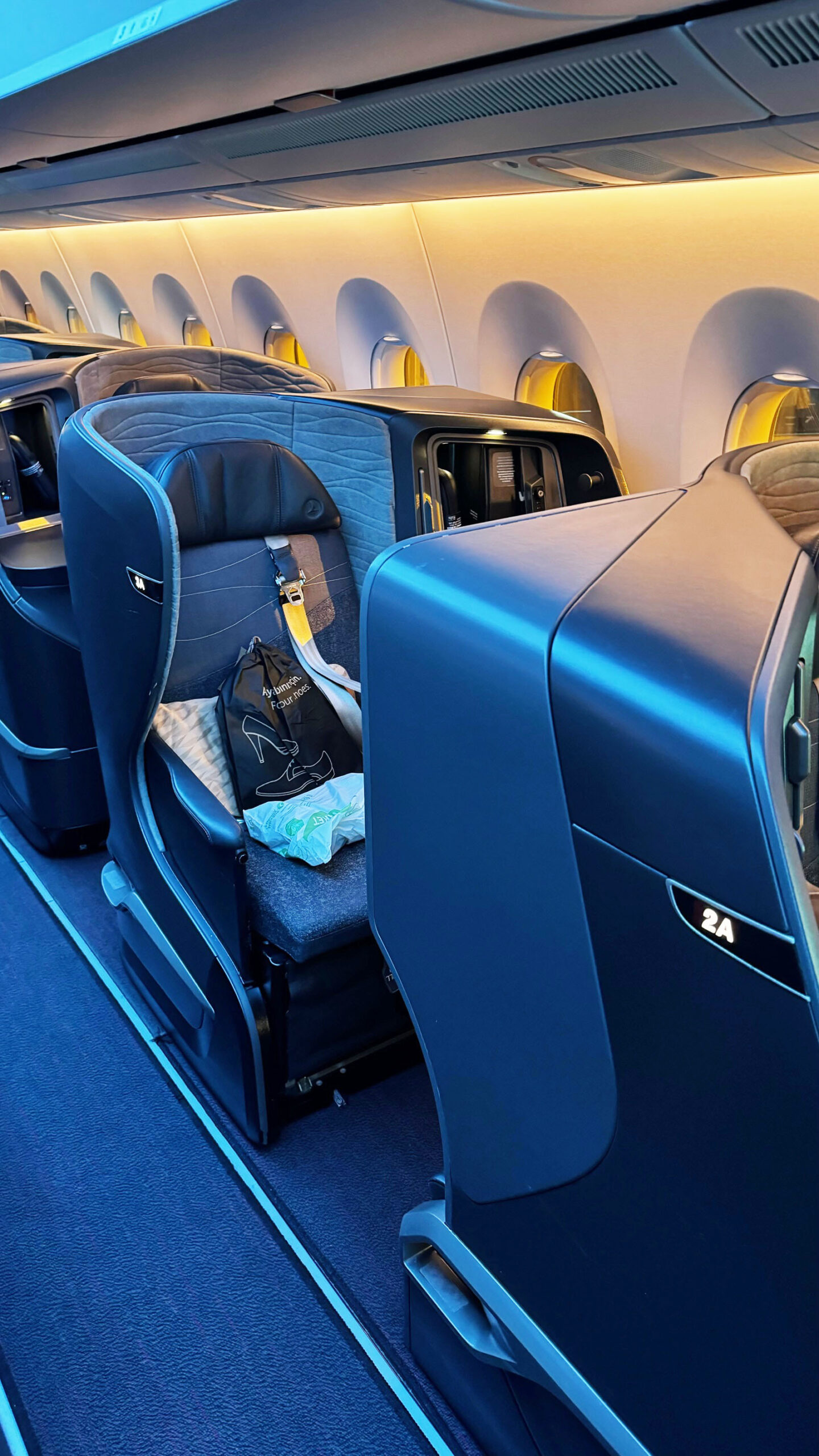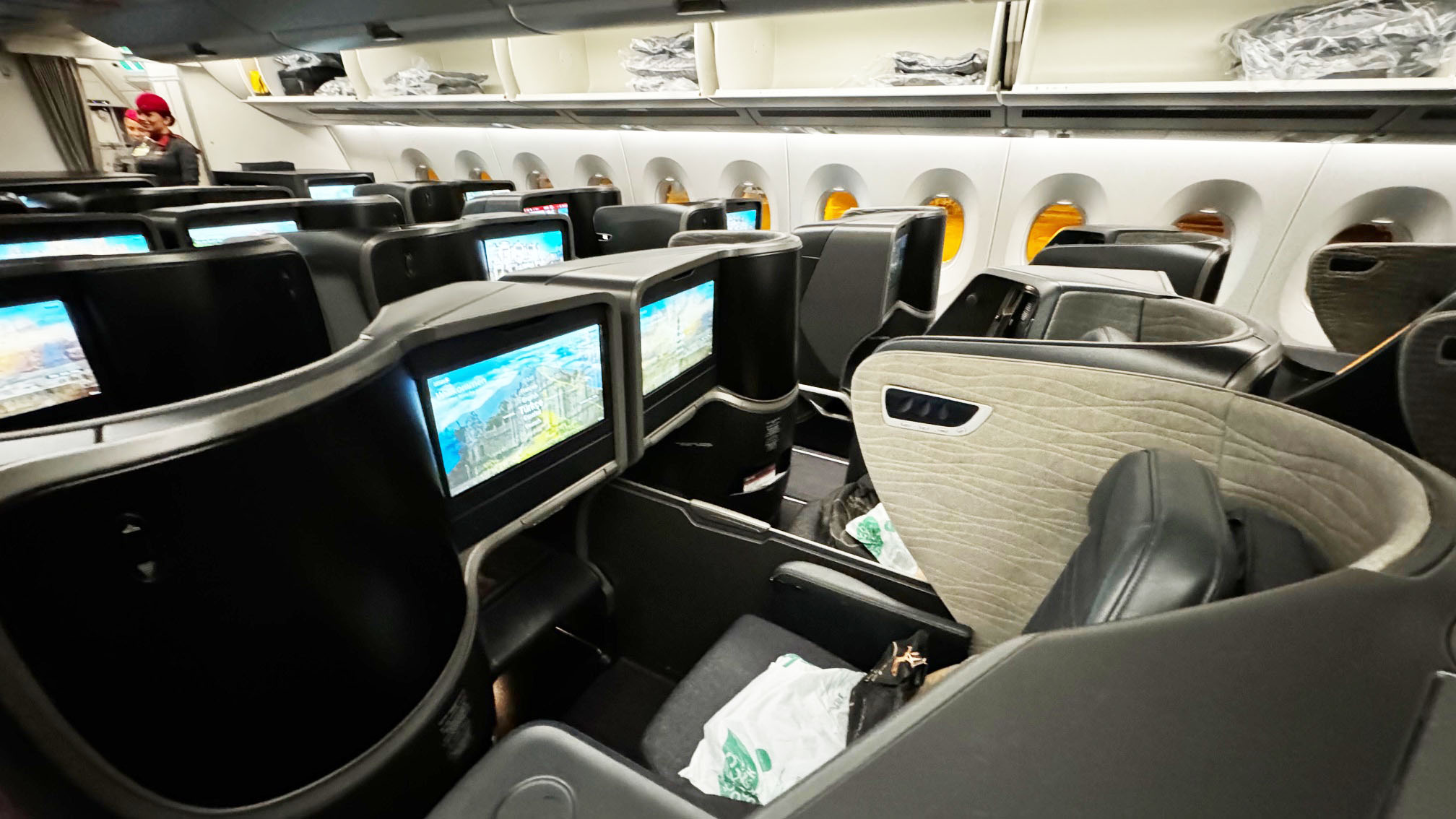 As poltronas da Business Class se transformam em camas totalmente reclináveis. Com um layout 1-2-1 que garante acesso direto ao corredor para todos os passageiros. O design é elegante, com tons escuros, e quando você sempre na cabine sente um clima de exclusividade.