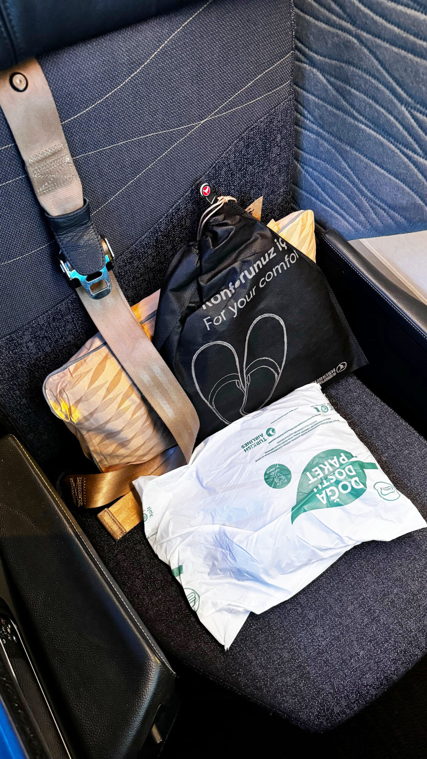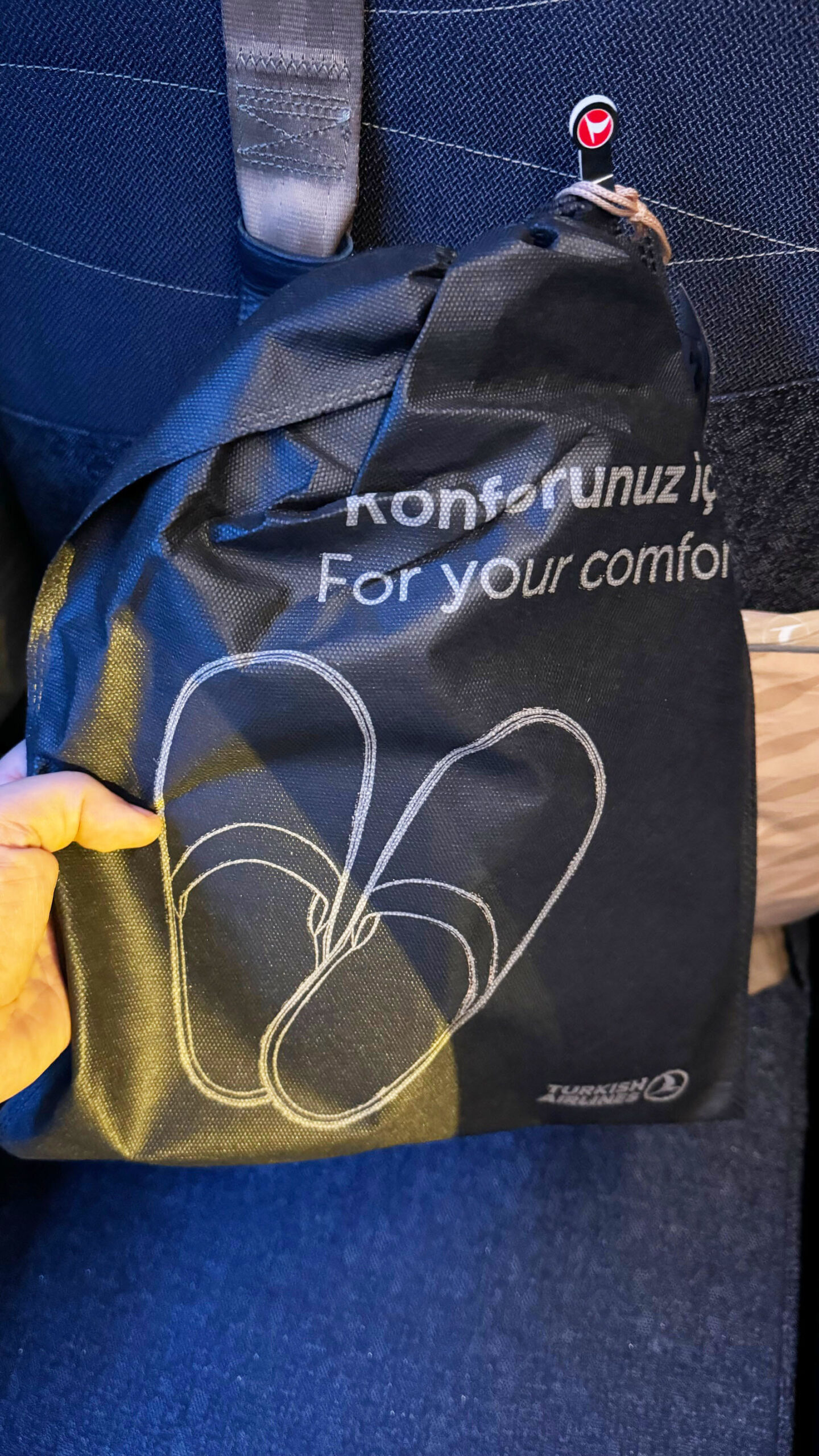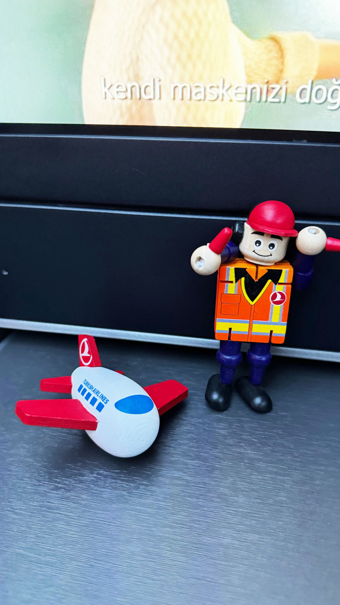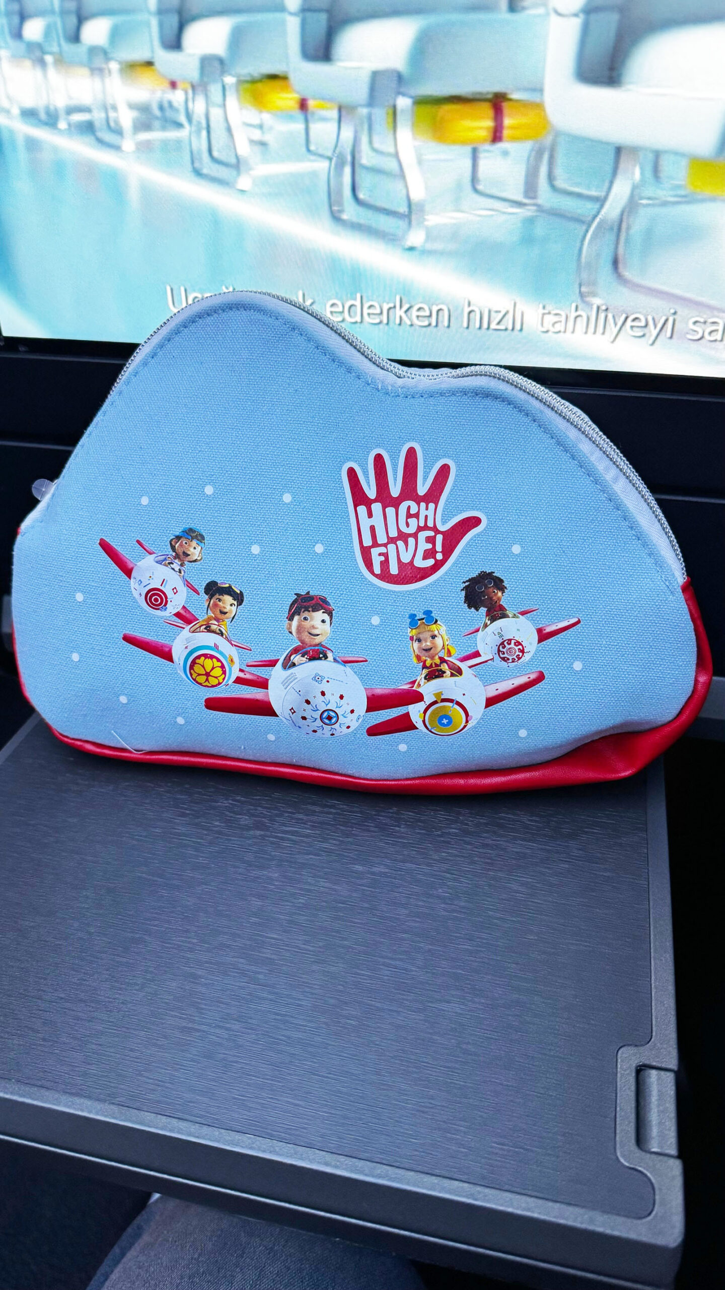 Para os pequenos viajantes, há um mimo à parte: uma charmosa bolsinha com tema infantil recheada de brinquedos em madeira com o branding da Turkish, mostrando a atenção da companhia até nos mínimos detalhes.