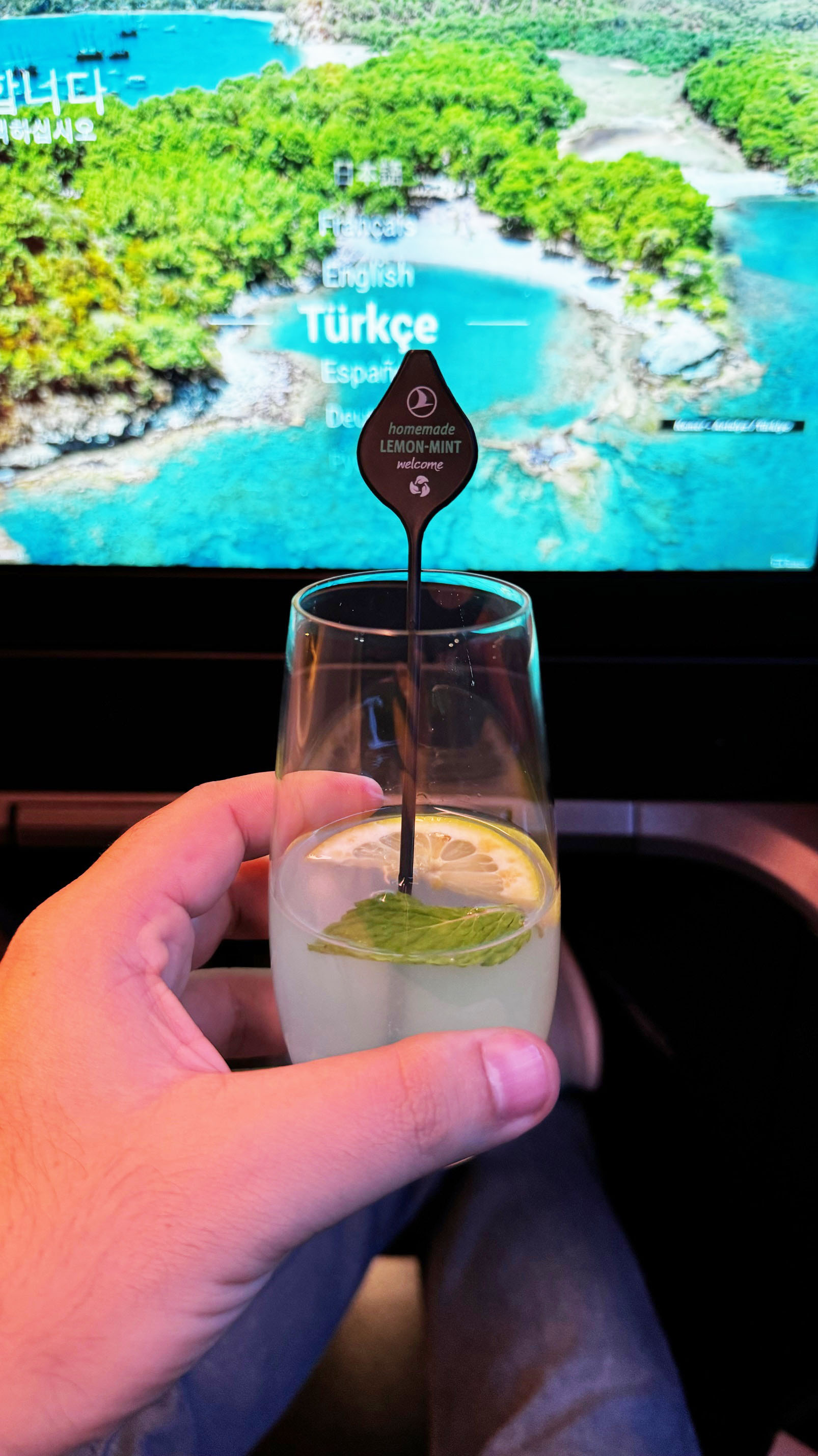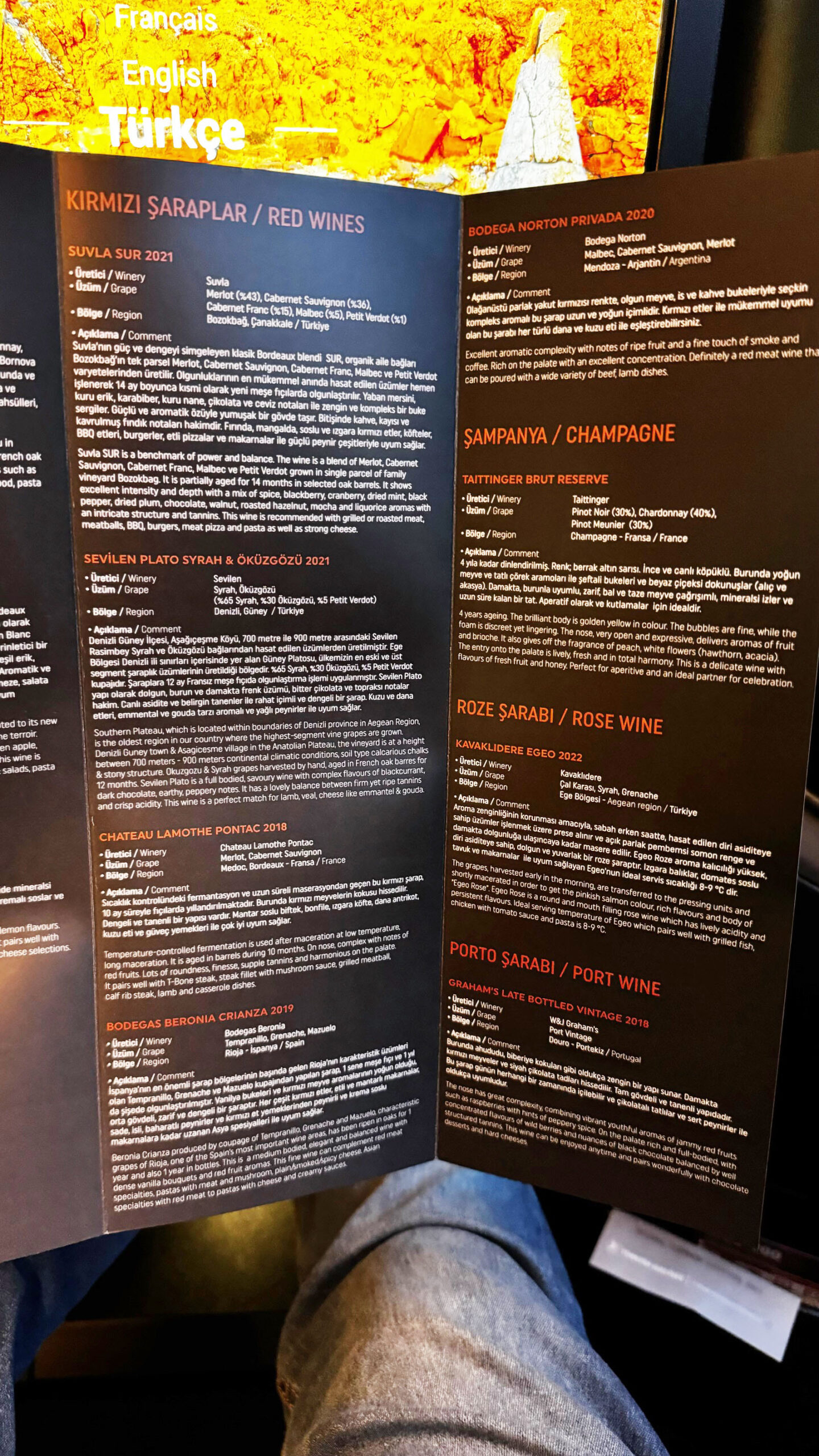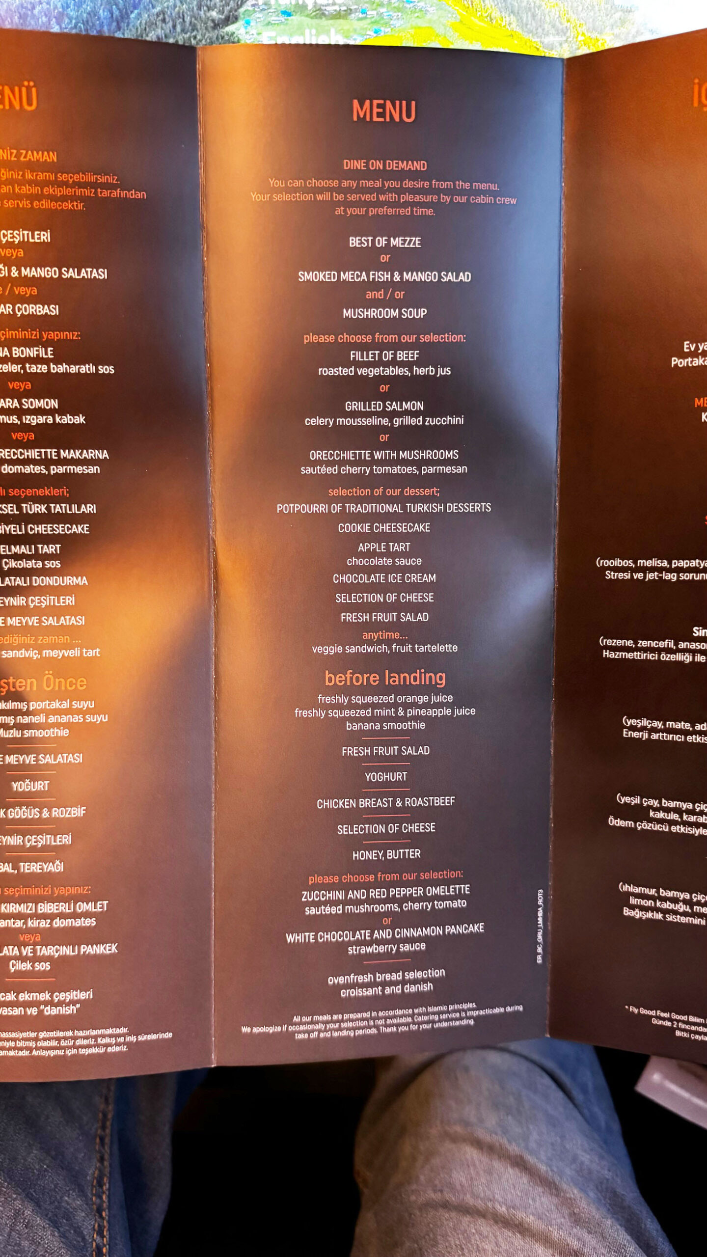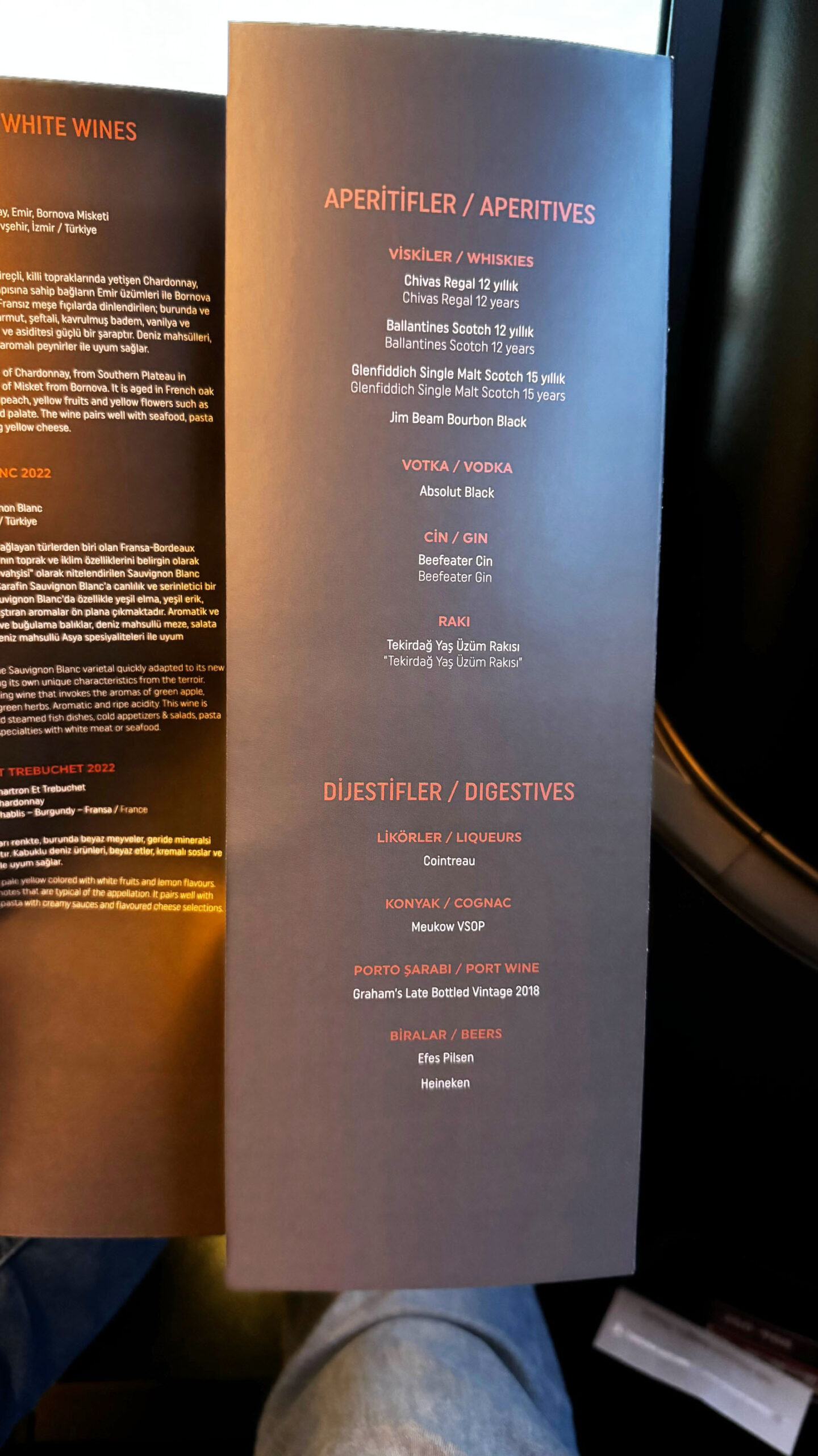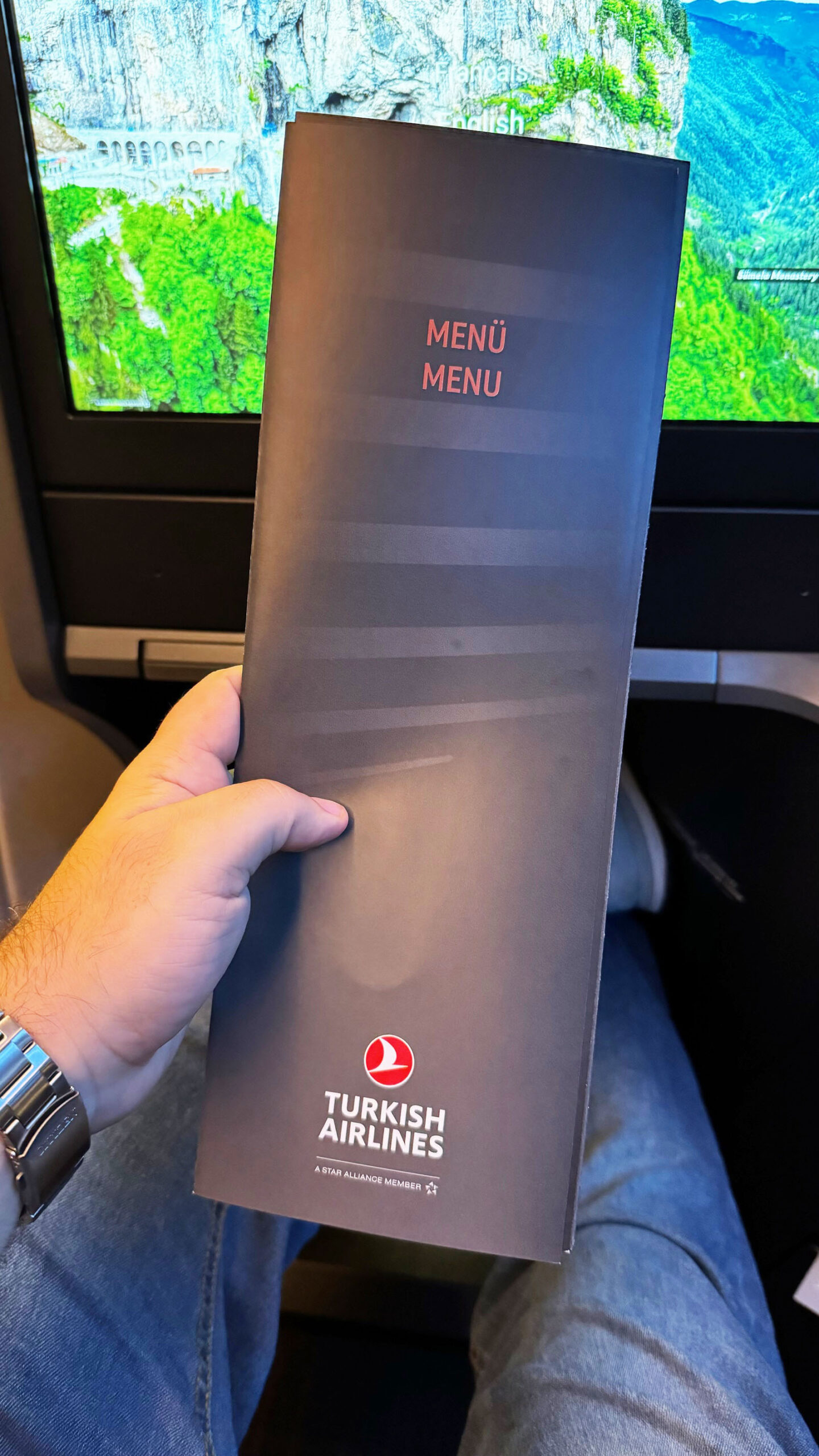 Logo depois de me acomodar me ofereceram um welcome drink, com bebidas variadas. A Turkish nunca oferece bebidas alcoólicas no seu drink de boas-vindas. Enquanto isso, aproveitei para dar uma olhada nas opções do cardápio, que está em português, espanhol e inglês.