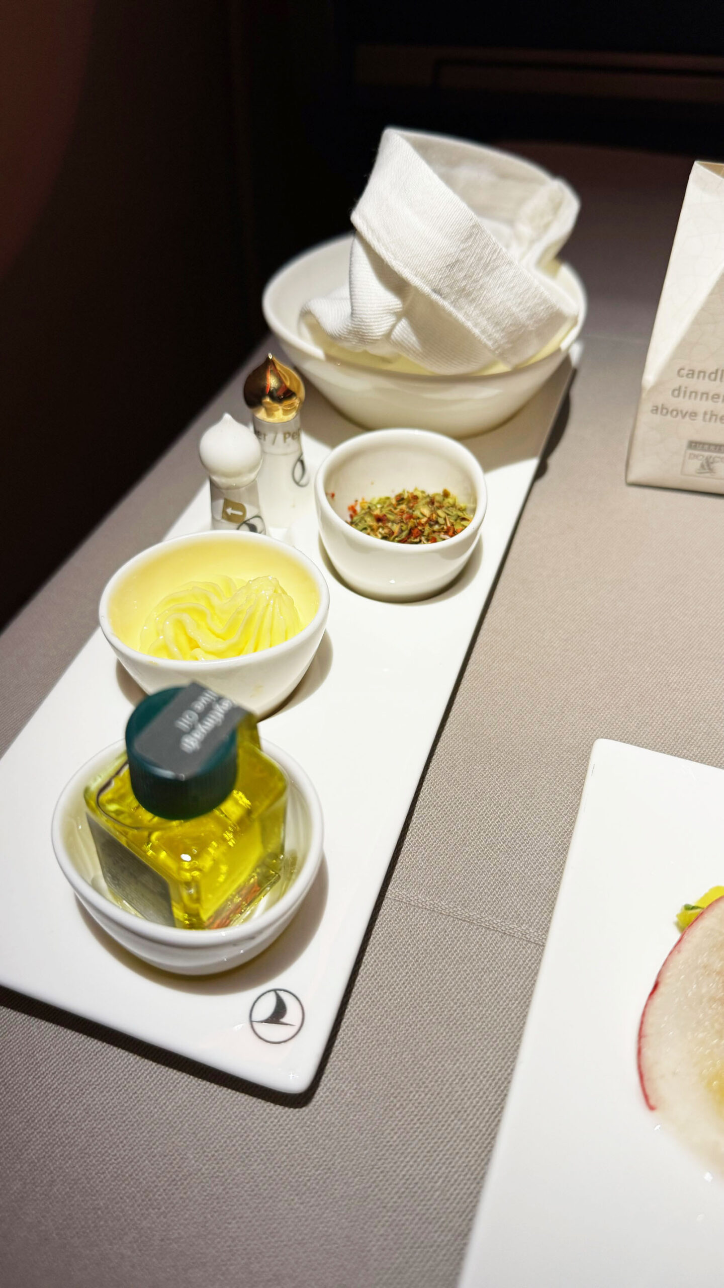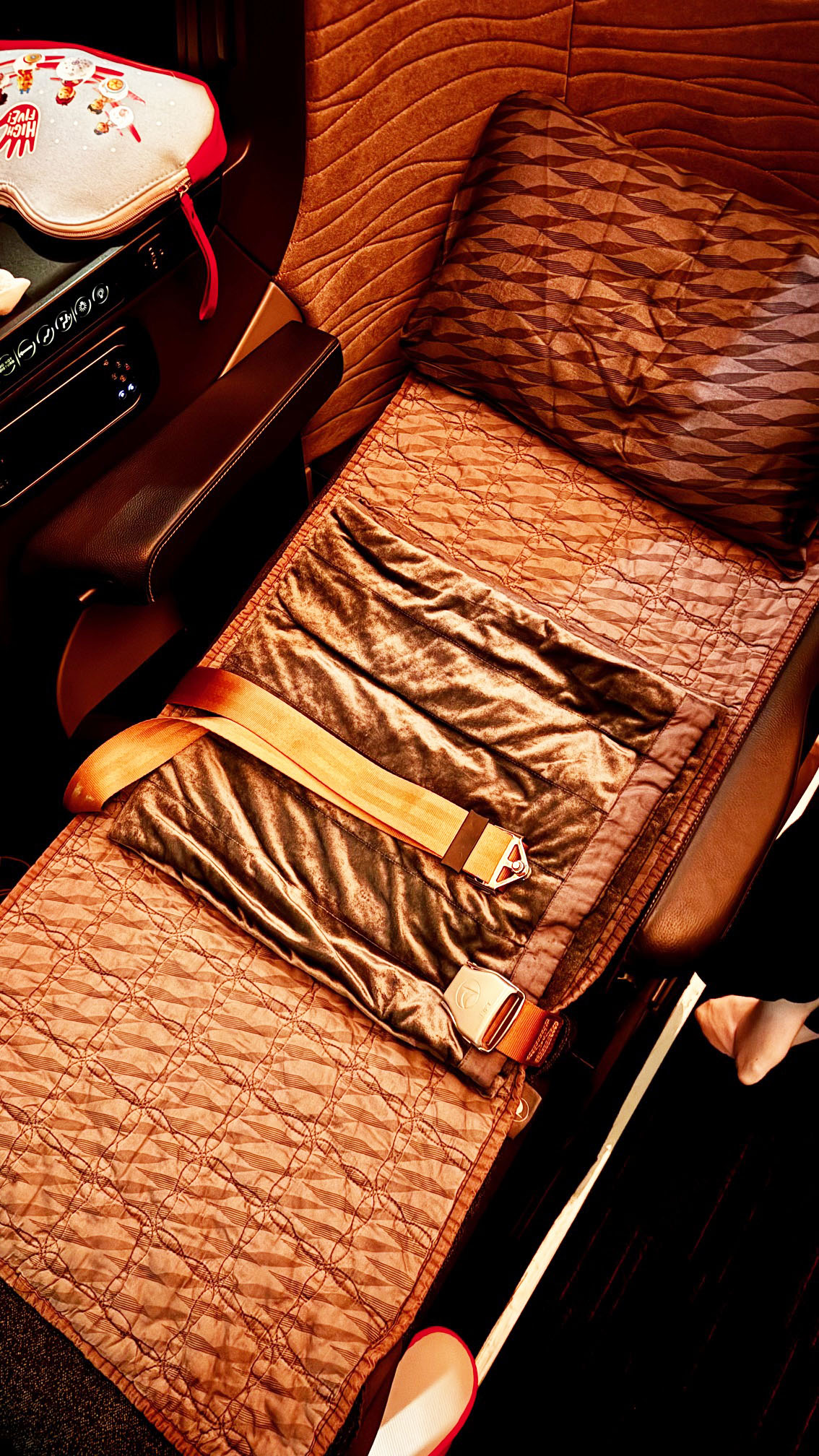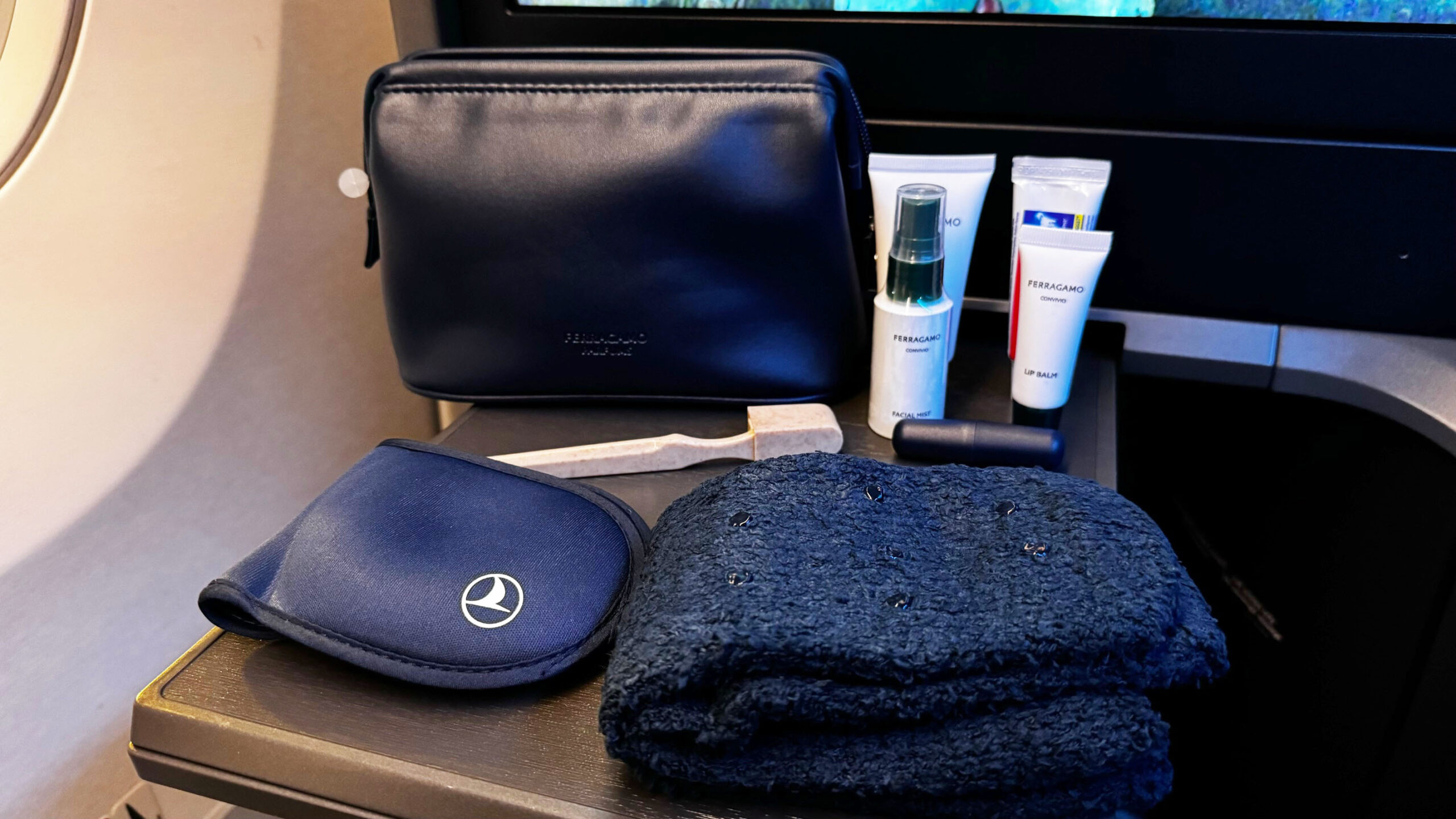 O amenity kit impressiona pelo requinte e praticidade. A nécessaire, assinada pela Ferragamo, tem acabamento elegante e vem equipada com itens de cuidado pessoal como hidratante facial, balm labial, spray refrescante e creme para as mãos, todos da mesma marca. O kit ainda inclui tapa-olhos com o logo da companhia, meias grossas para maior conforto durante o voo, escova de dentes e pasta.