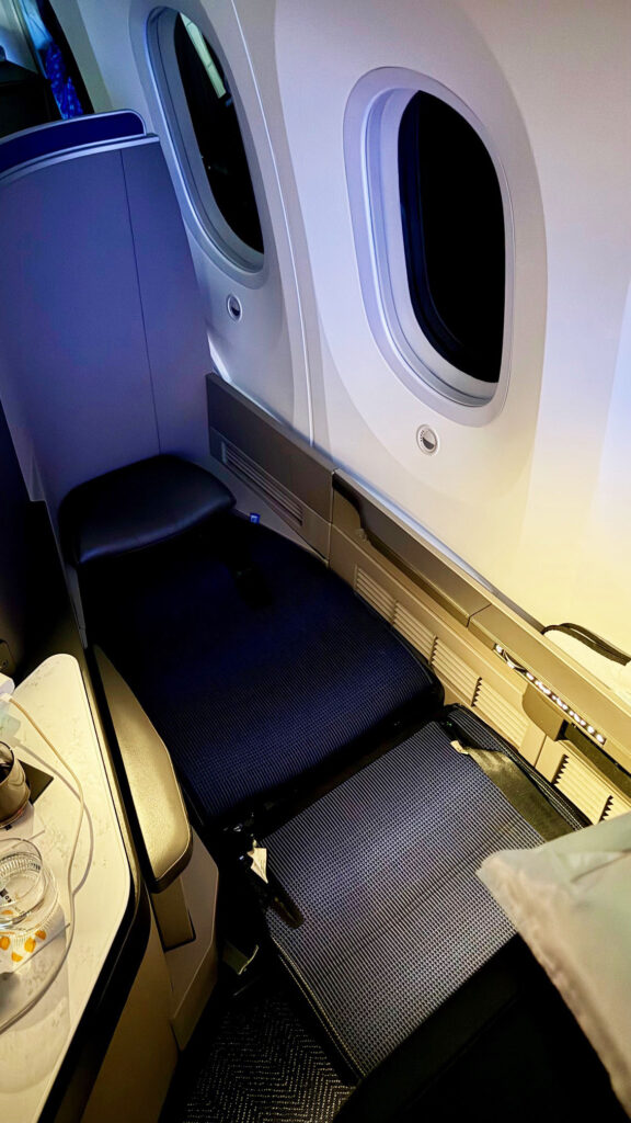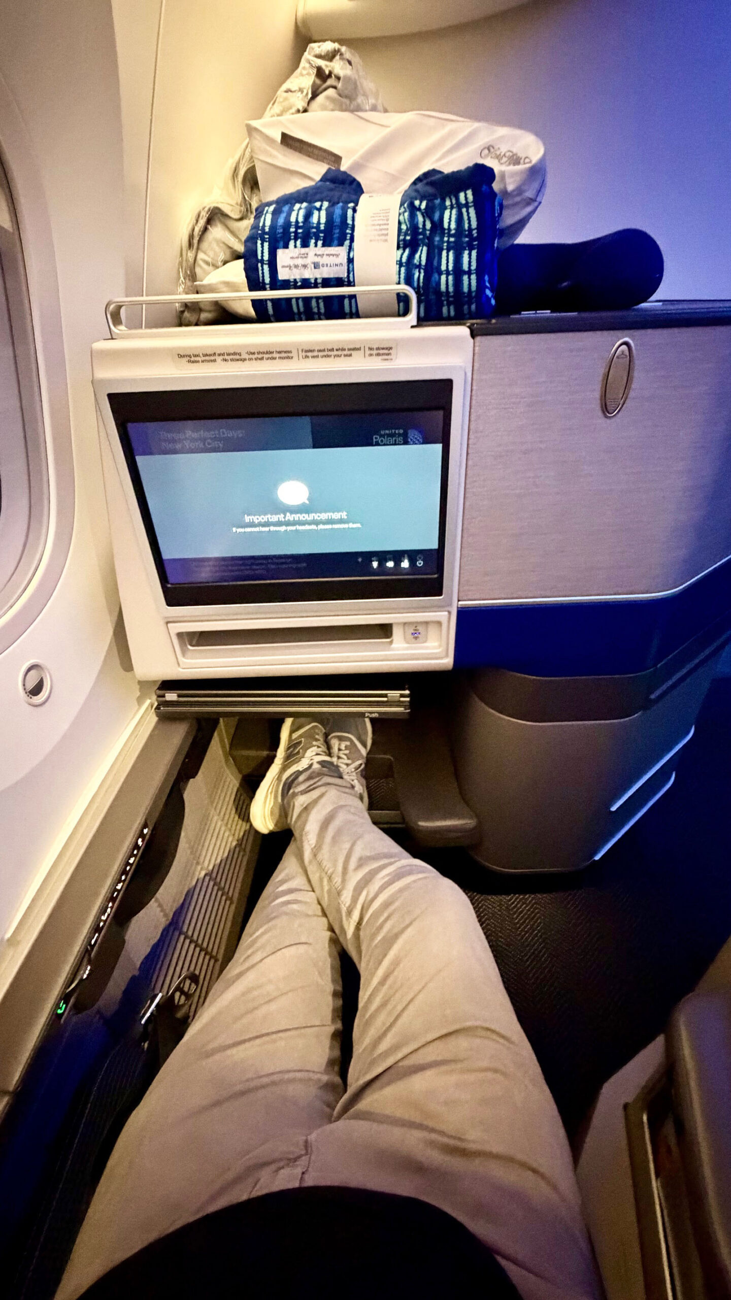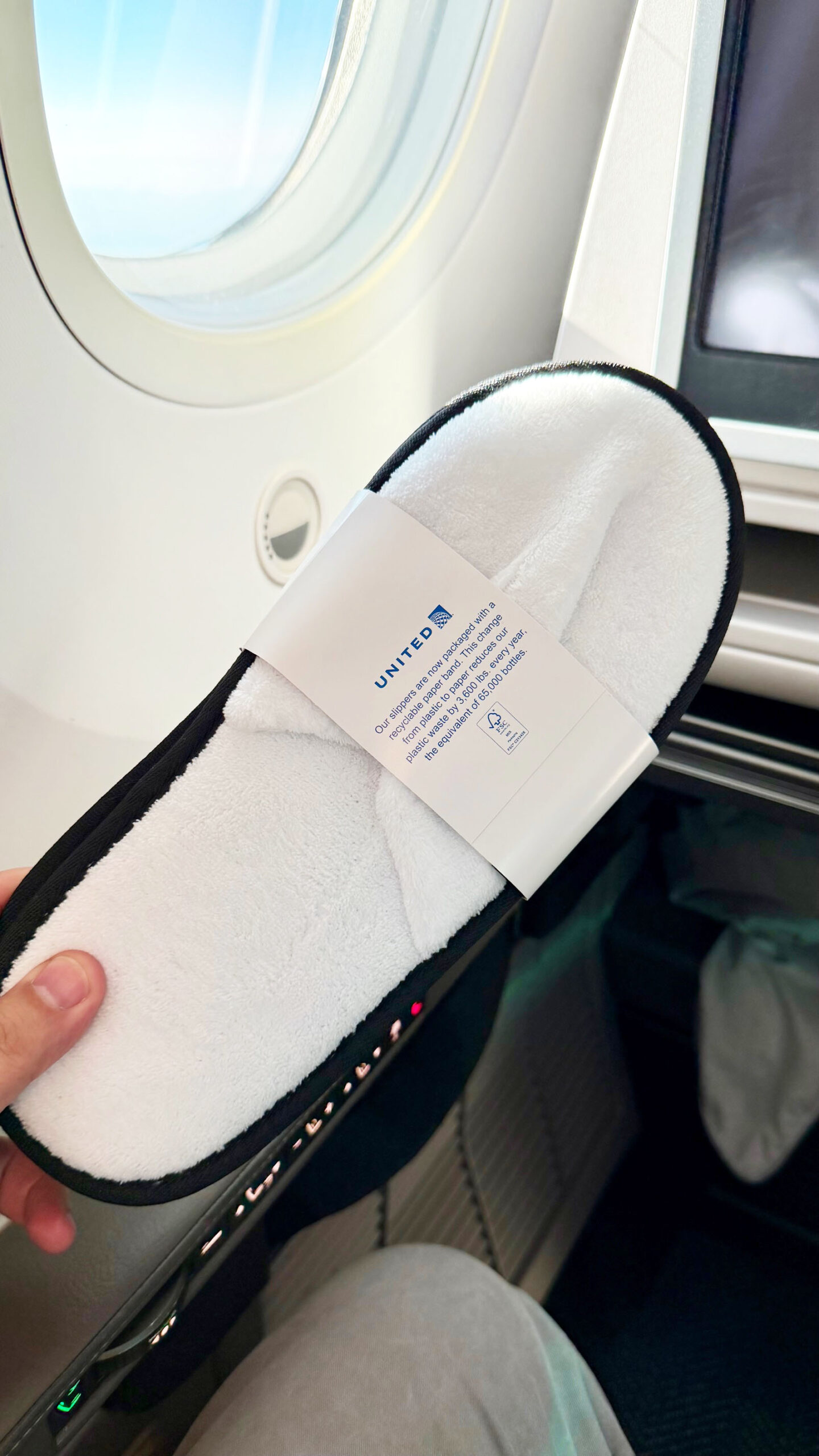 O assento é realmente espaçoso, especialmente na primeira fileira, onde o conforto faz diferença logo de cara. Os amenities têm boa qualidade, o atendimento segue aquele padrão direto e eficiente das companhias americanas (exceto para me entregar a pantufa). A internet funcionou muito bem durante todo o voo, algo que nem sempre acontece.