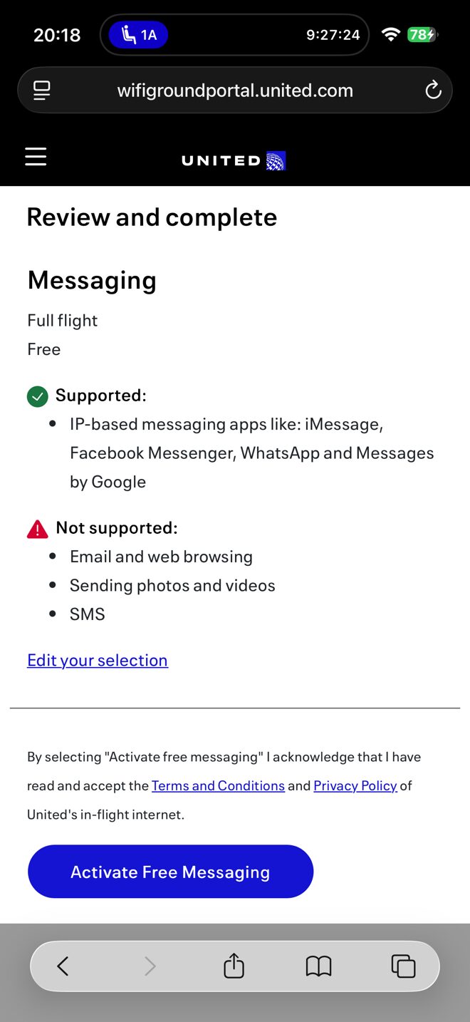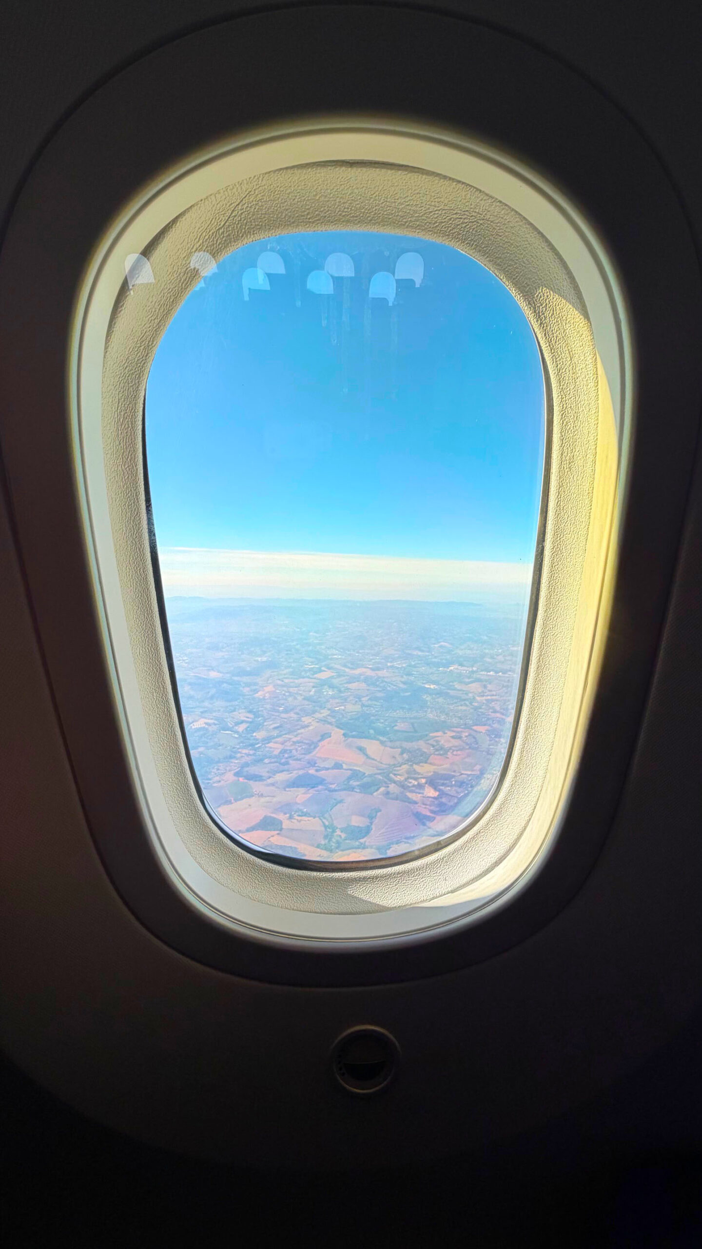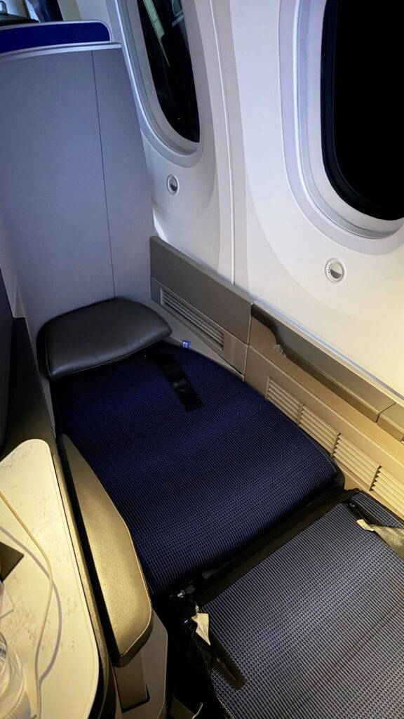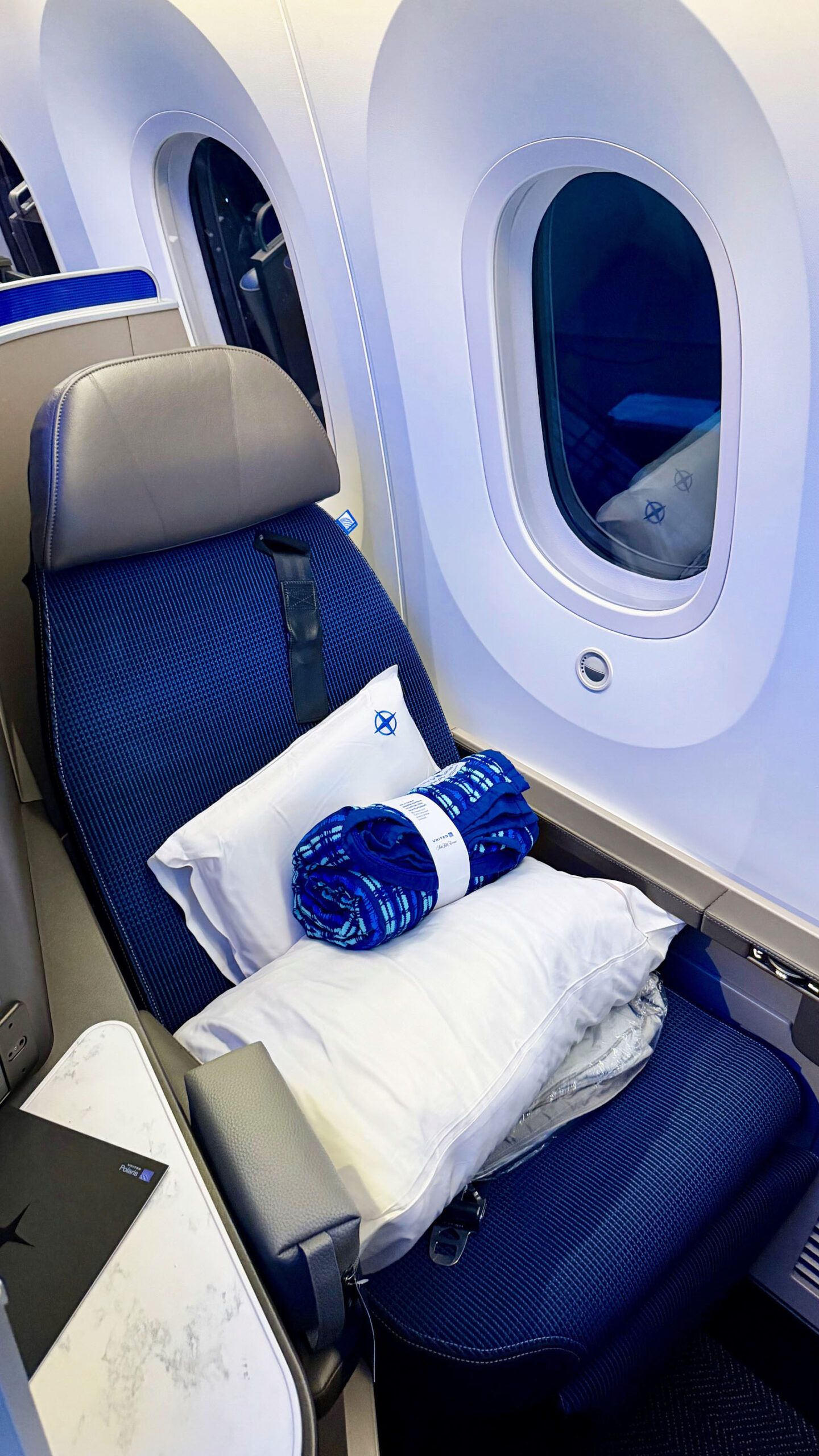 O assento é realmente espaçoso, especialmente na primeira fileira, onde o conforto faz diferença logo de cara. Os amenities têm boa qualidade, o atendimento segue aquele padrão direto e eficiente das companhias americanas (exceto para me entregar a pantufa). A internet funcionou muito bem durante todo o voo, algo que nem sempre acontece.