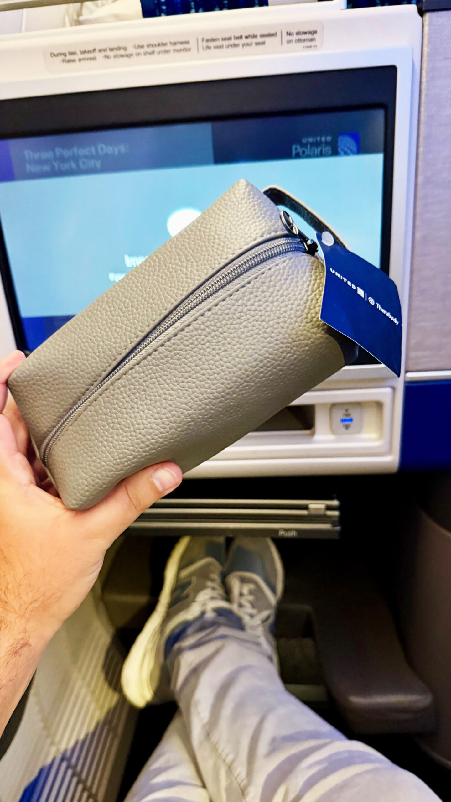 A United Airlines distribui em seus voos internacionais de Classe Executiva Polaris um amenity kit com design simples, mas material de boa qualidade e tudo organizado do jeito certo para um voo longo.