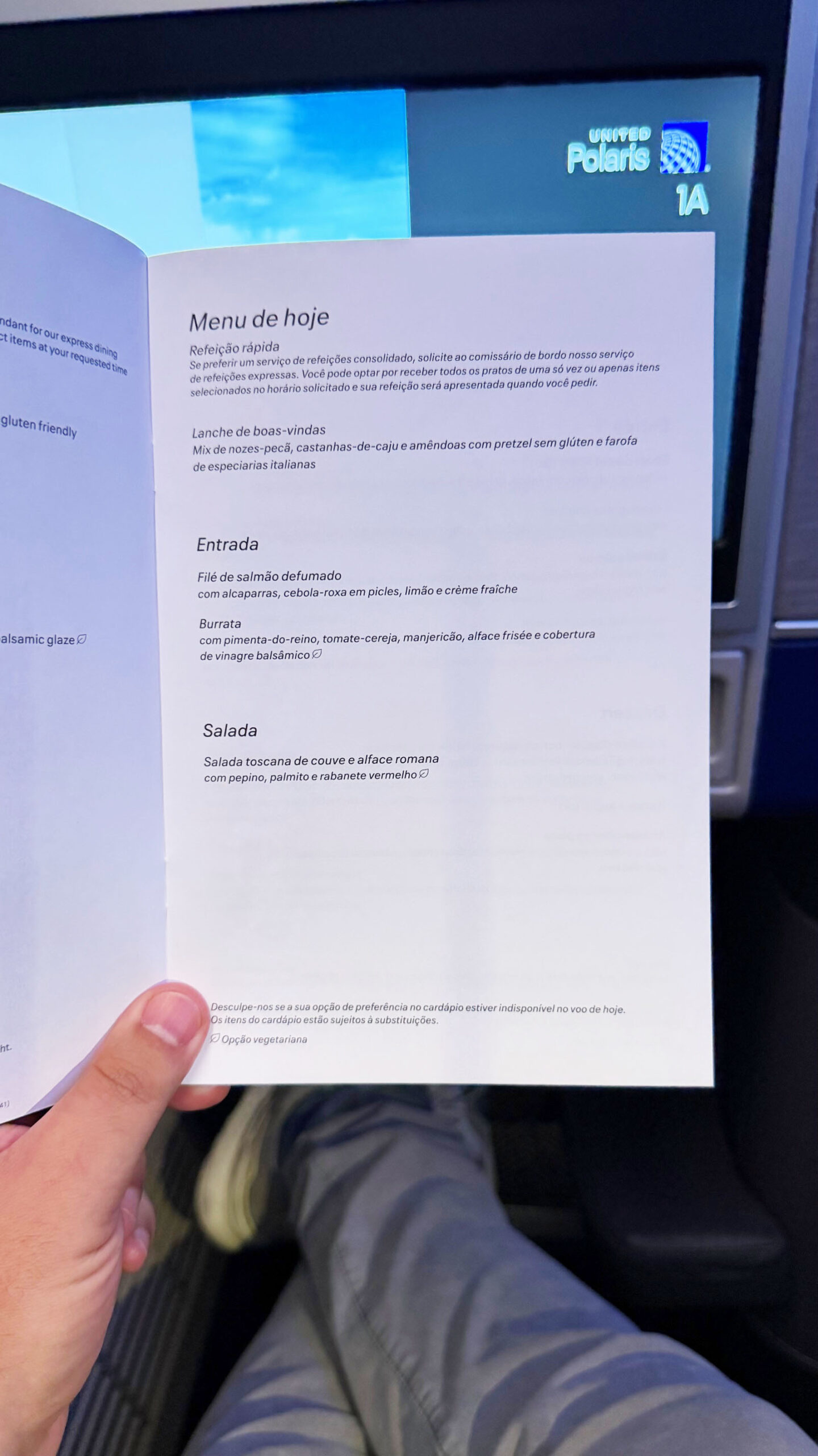 Esse voo foi noturno, então serviram jantar e café da manhã. O serviço de jantar da United Airlines na classe executiva Polaris segue o padrão de refeição completa em várias etapas. O atendimento começa com toalha quente, bebidas e castanhas servidas em louça. Em seguida, são oferecidas entradas com salada fresca e um prato frio, acompanhadas de pão e azeite.