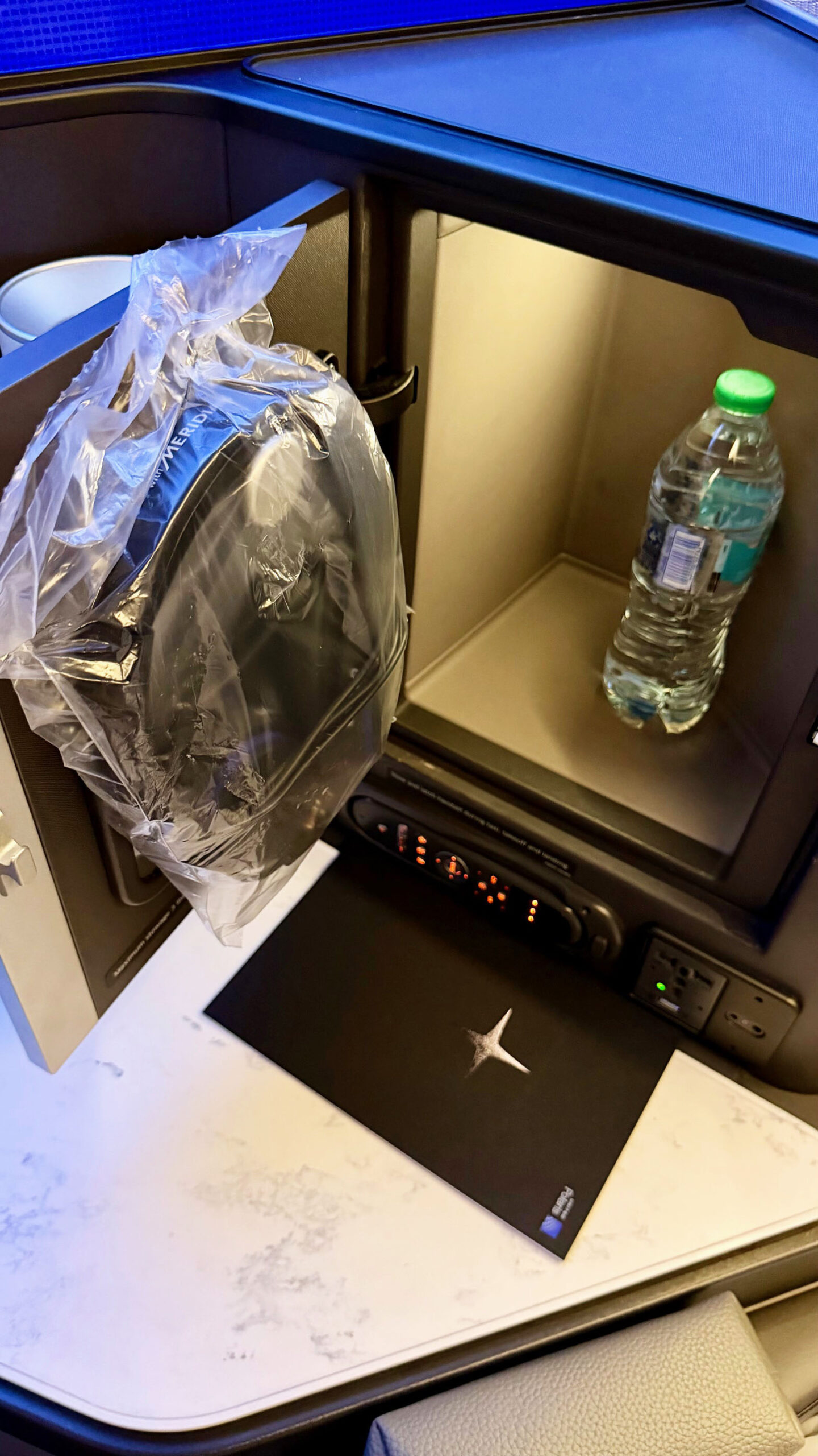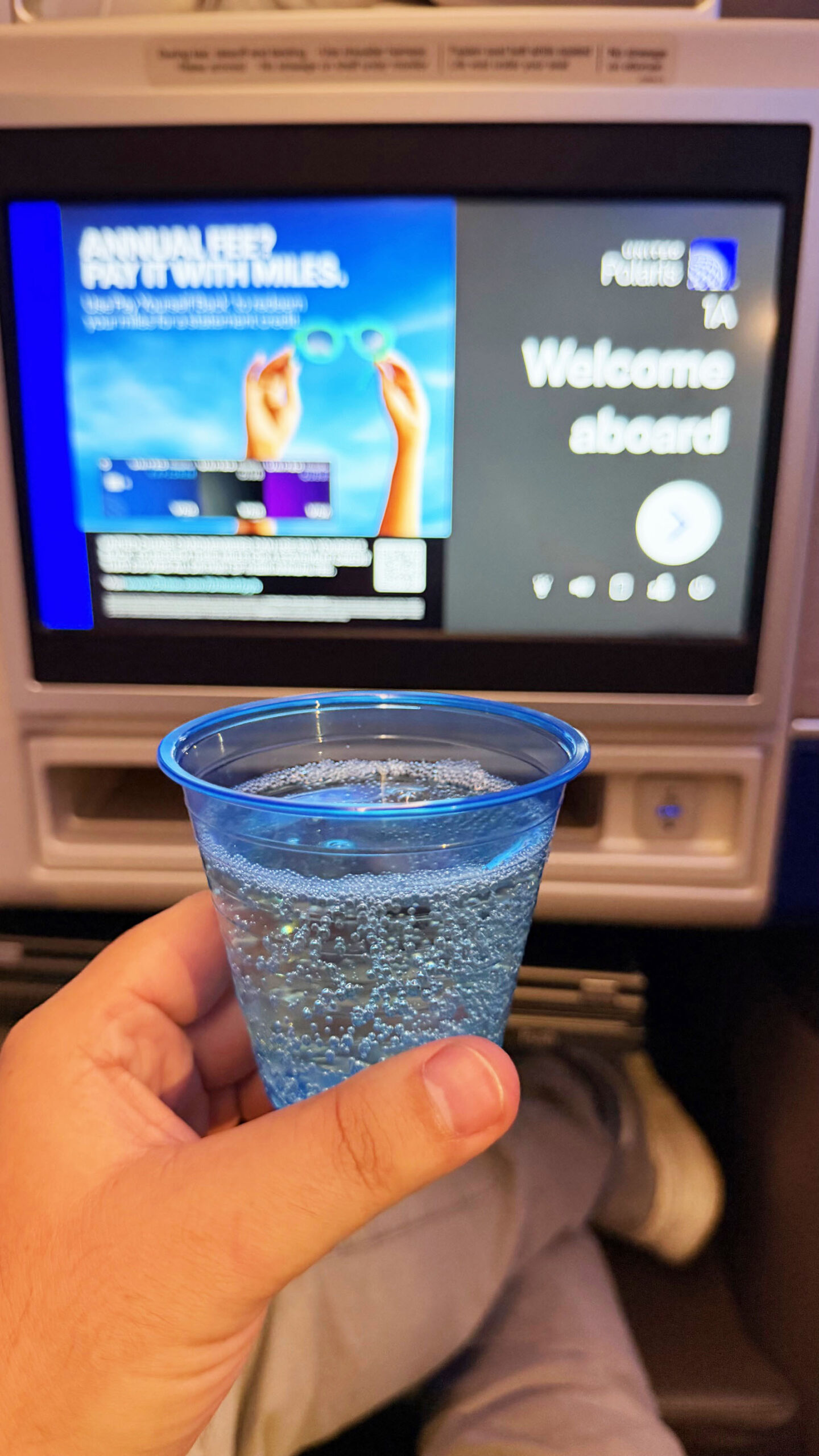 Logo depois de me acomodar, ofereceram o welcome drink com várias opções. Pedi um champanhe. O único ponto negativo ficou por conta do copo: era de plástico. Para uma cabine premium, onde o padrão costuma ser vidro, isso realmente causa uma primeira impressão abaixo do esperado.