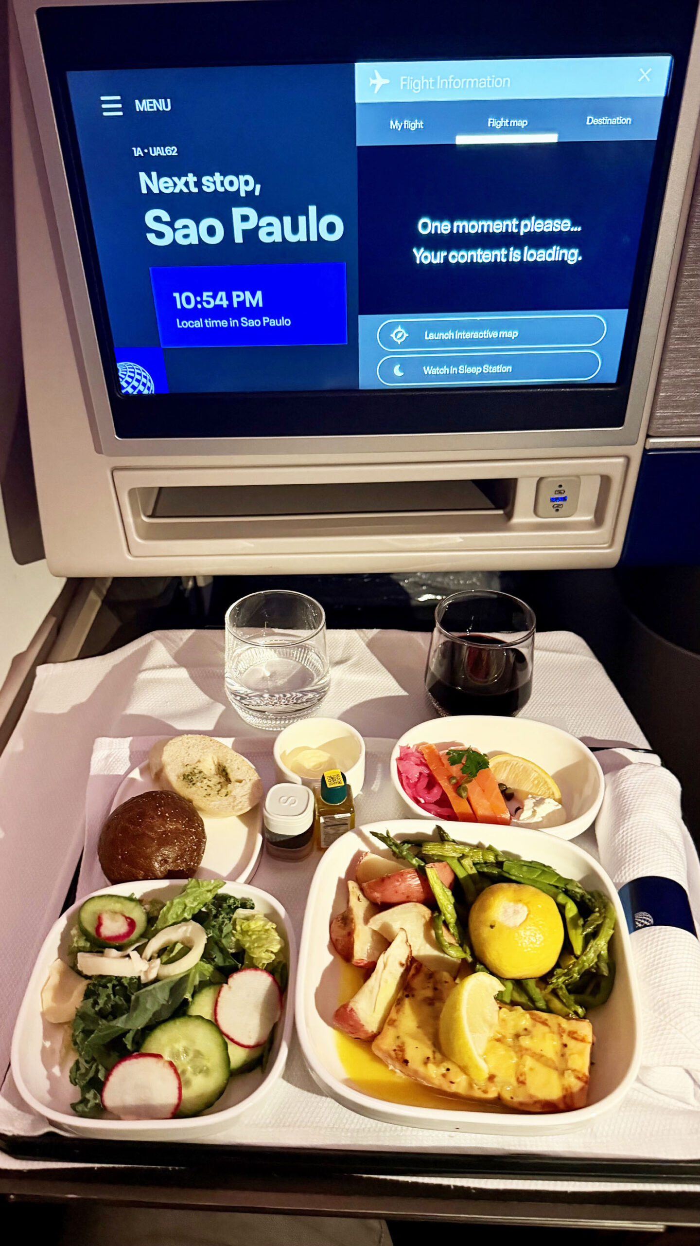 O serviço de jantar da United Polaris segue aquele padrão consistente que eu sempre comento nos reviews. Nada extravagante, mas tudo muito correto. A apresentação é boa, os pratos chegam bem montados e a sequência funciona. A salada é simples, mas fresca, e o salmão vem com molho leve e os acompanhamentos chegam na temperatura certa.