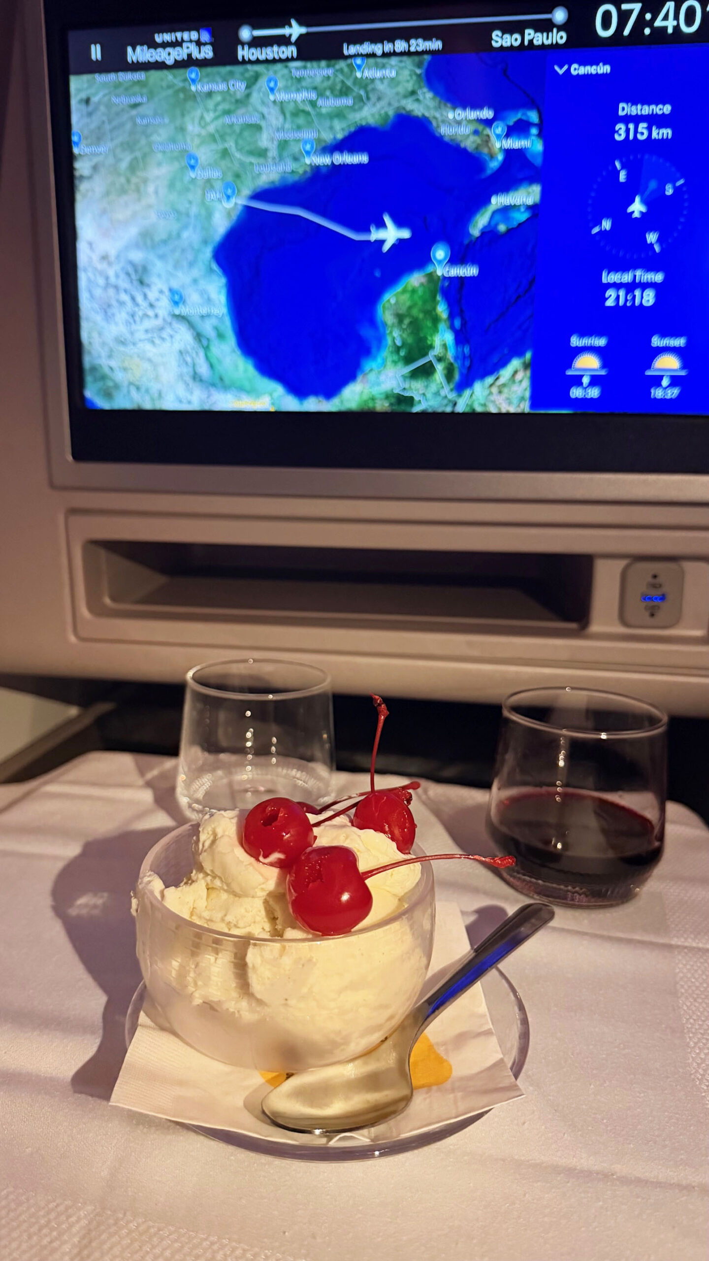 O destaque como sempre fica para a sobremesa. O sorvete com cerejas é um clássico da United e continua sendo um dos pontos mais confiáveis do serviço. É simples, mas entrega exatamente o que você quer no fim do jantar.