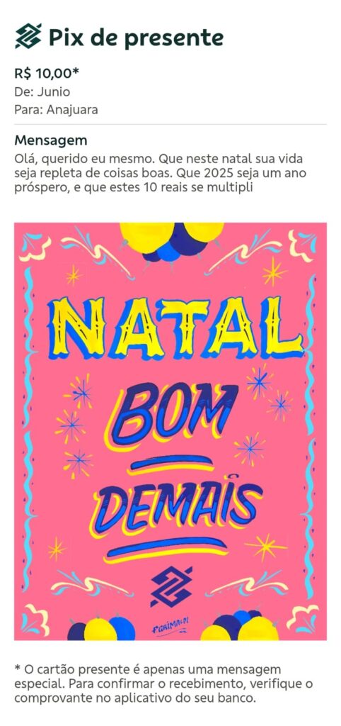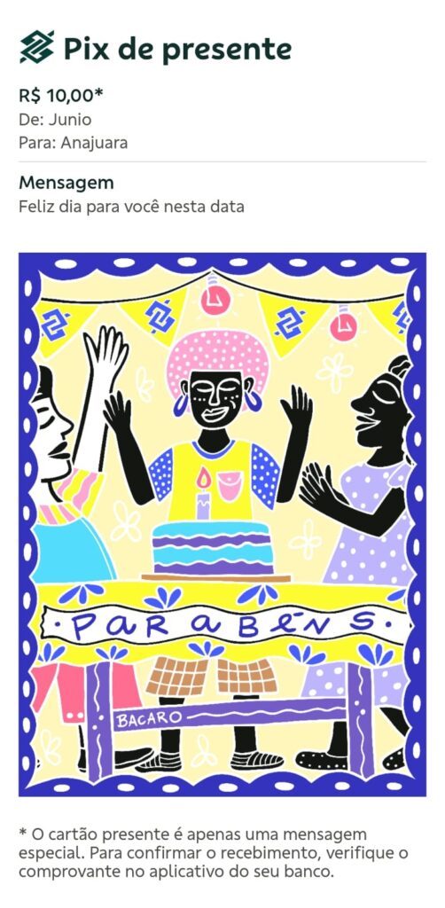 O Banco do Brasil anunciou o lançamento da funcionalidade Pix de presente. A função não é nada diferente do Pix tradicional que usamos todos os dias, a não ser pelo comprovante gerado. Ele deixa de ser mais formal, com códigos e autenticações, e passa a contar com um leiaute mais simples, informando o nome do remetente, do destinatário e uma mensagem de texto, acrescidos de um desenho pré-definido por você.
