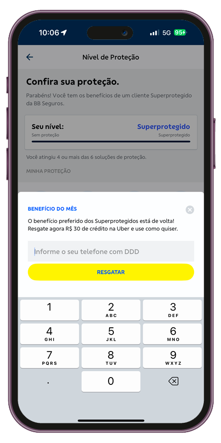 - Para resgatar, clique em “Benefício de setembro (R$ 30 na Uber)” e informe seu número de celular