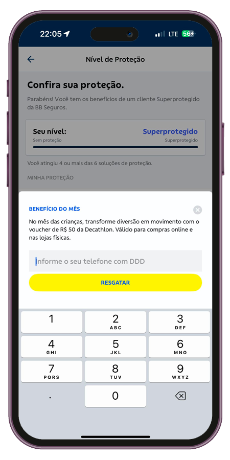 - Para resgatar, clique em “Benefício de outubro (R$ 50 na Decathlon)” e informe seu número de celular
