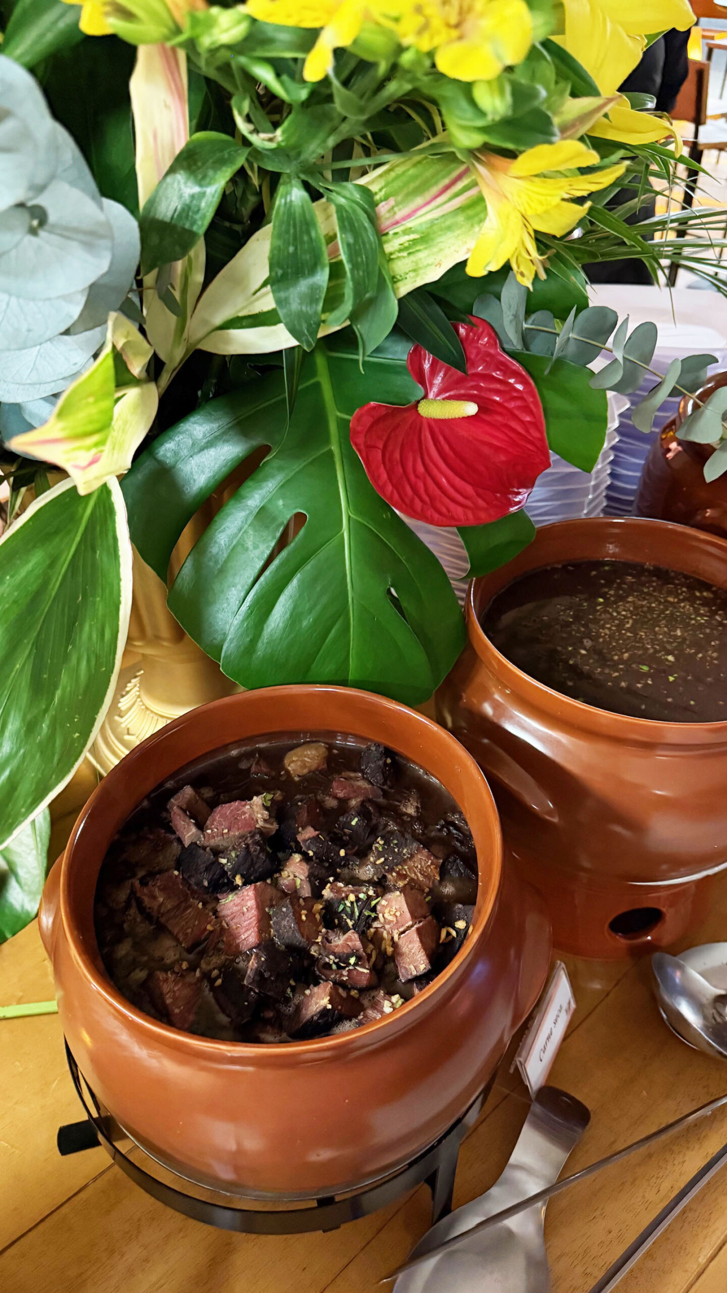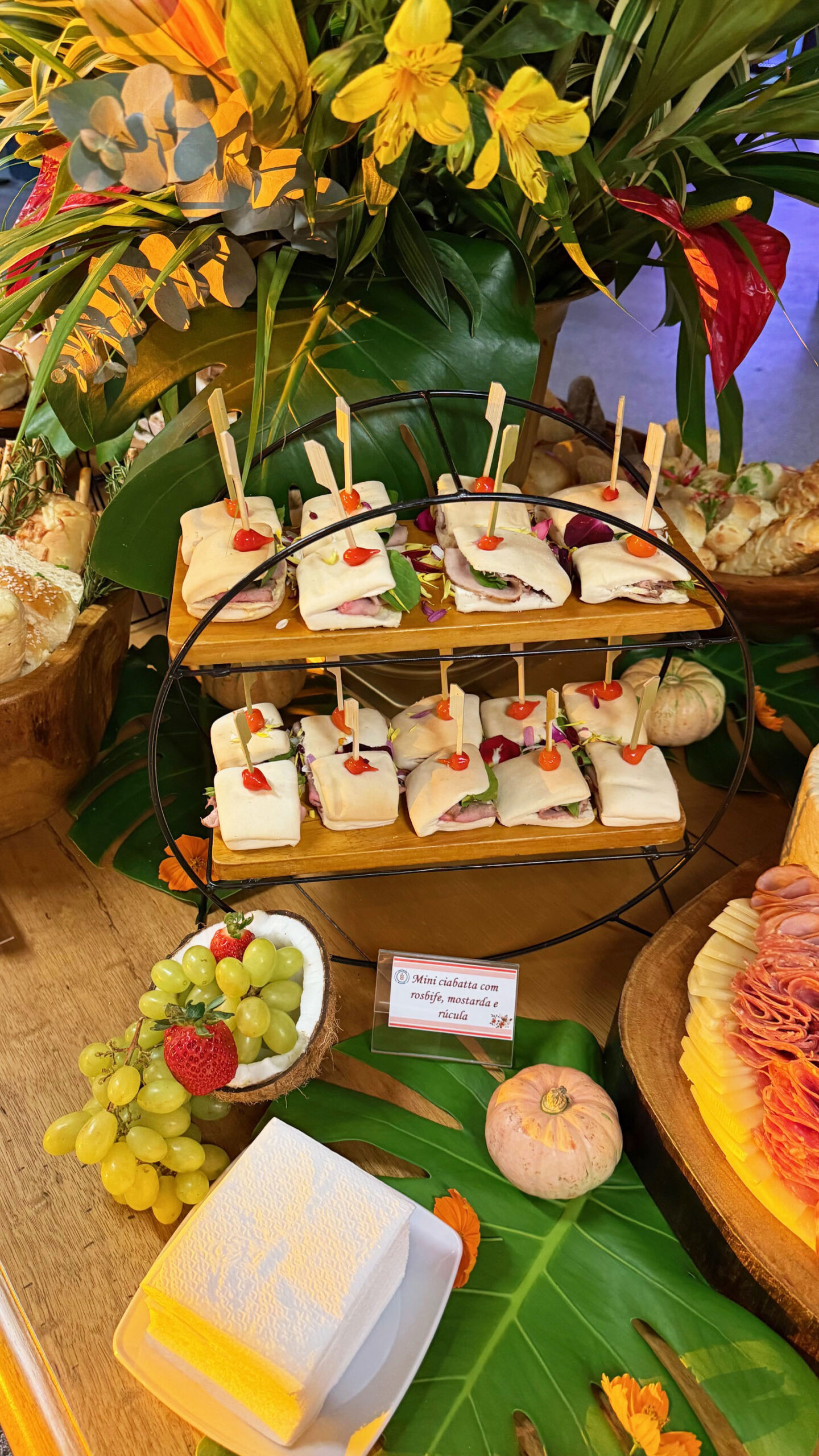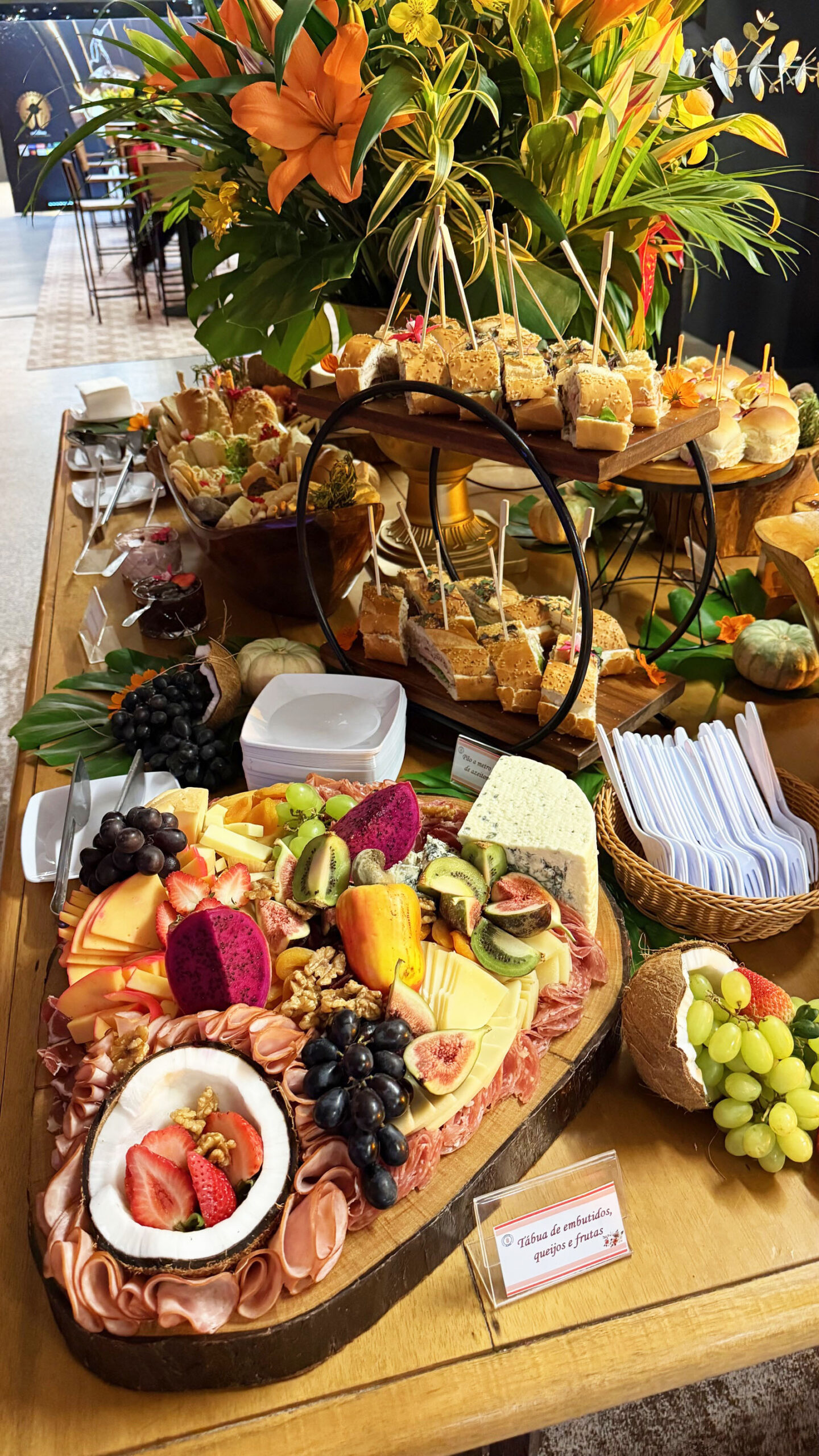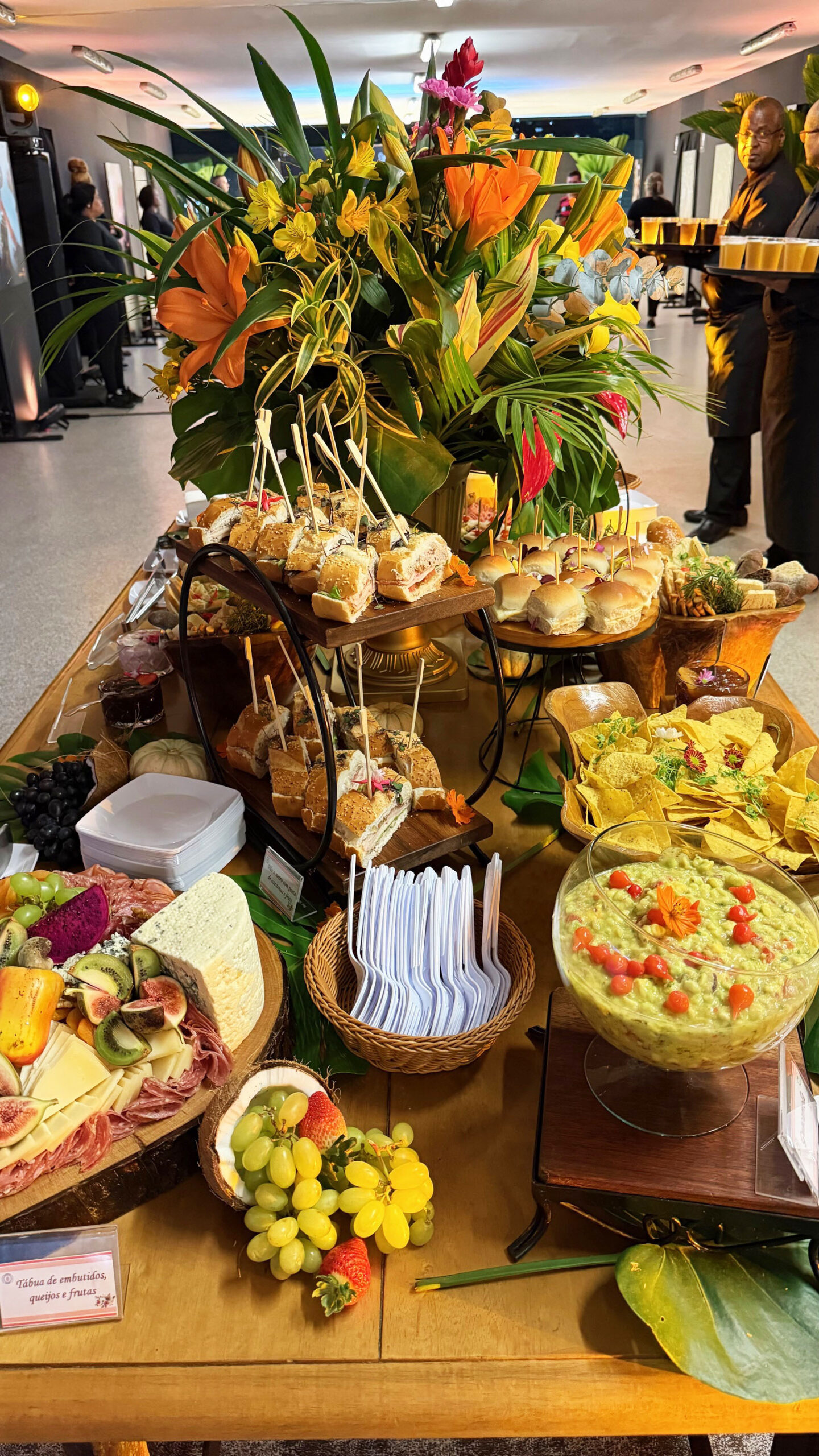 Para comer, você tem várias opções à disposição, incluindo pratos quentes. Uma mesa de frios com sanduíches, além de outra mesa com feijoada completa, eram as opções. Além disso, o serviço volante servia canapés e salgadinhos.