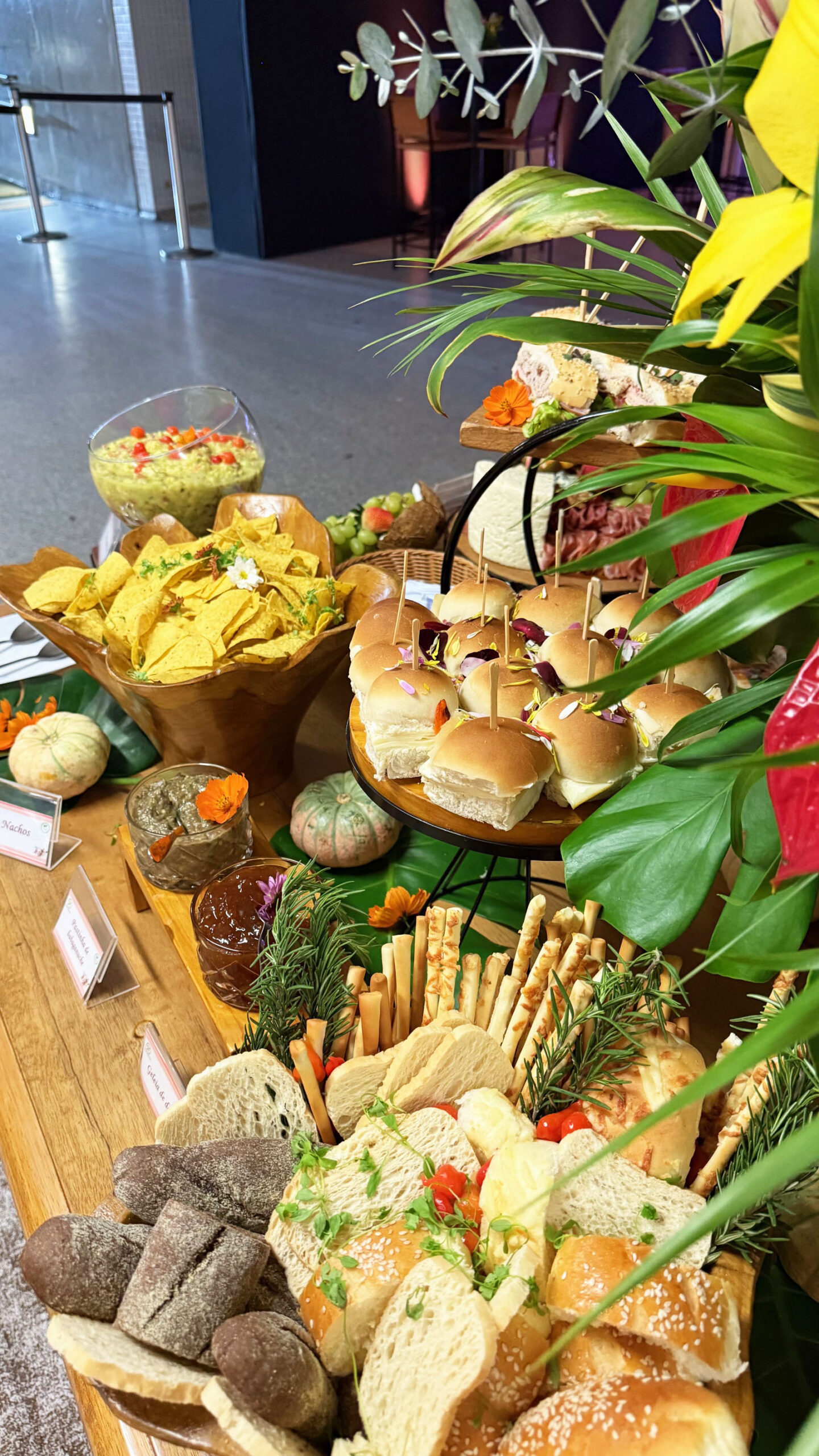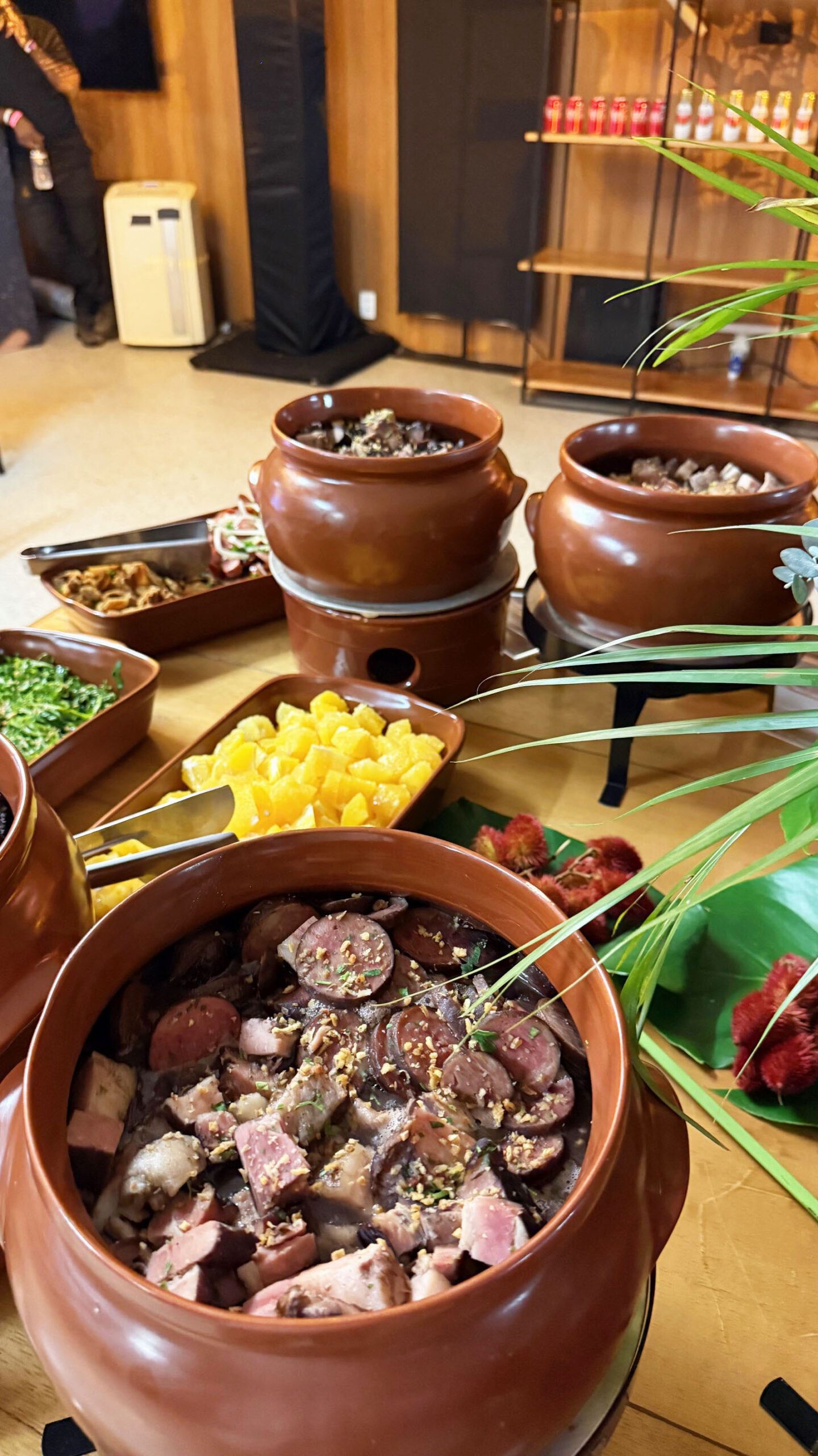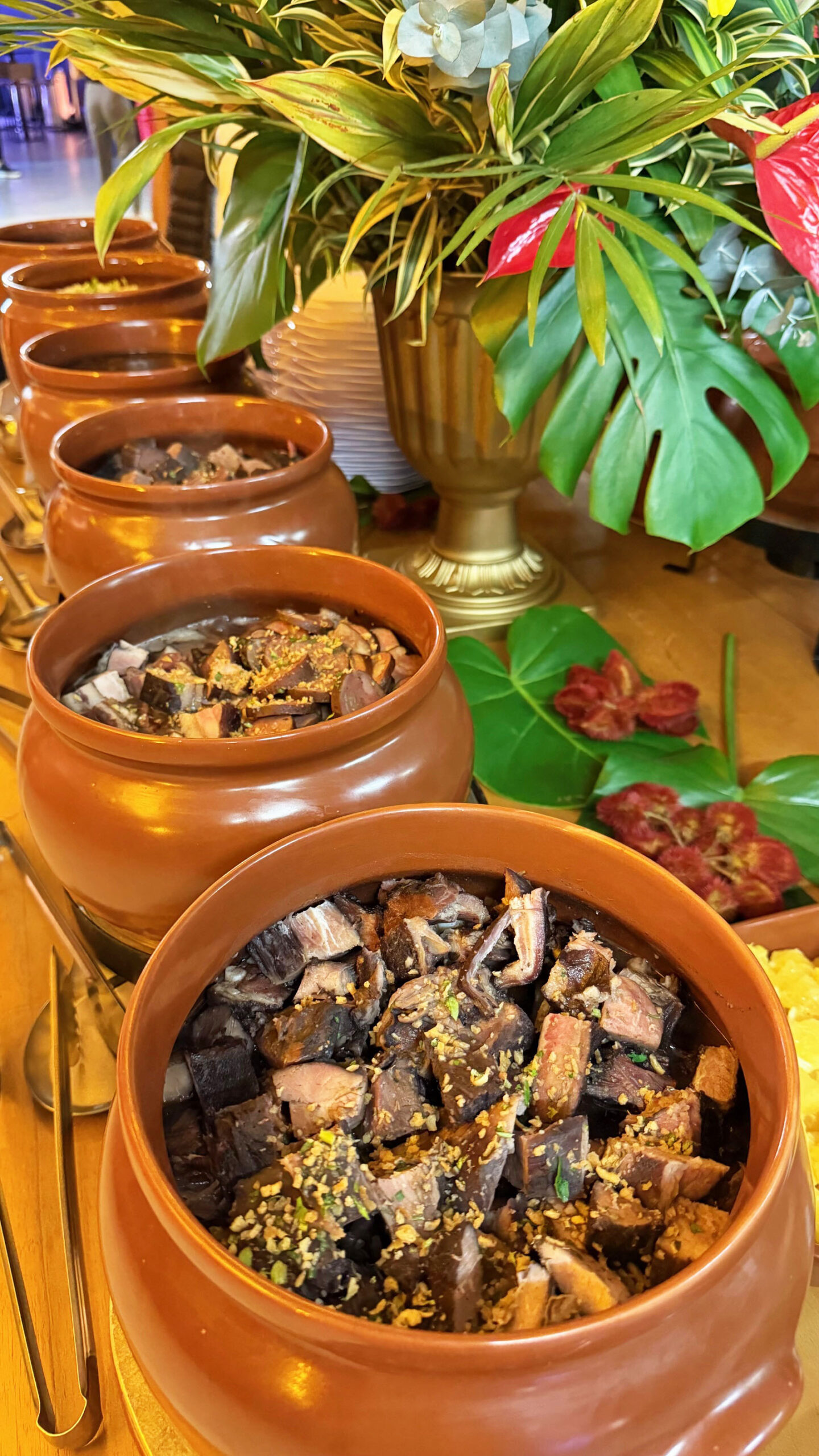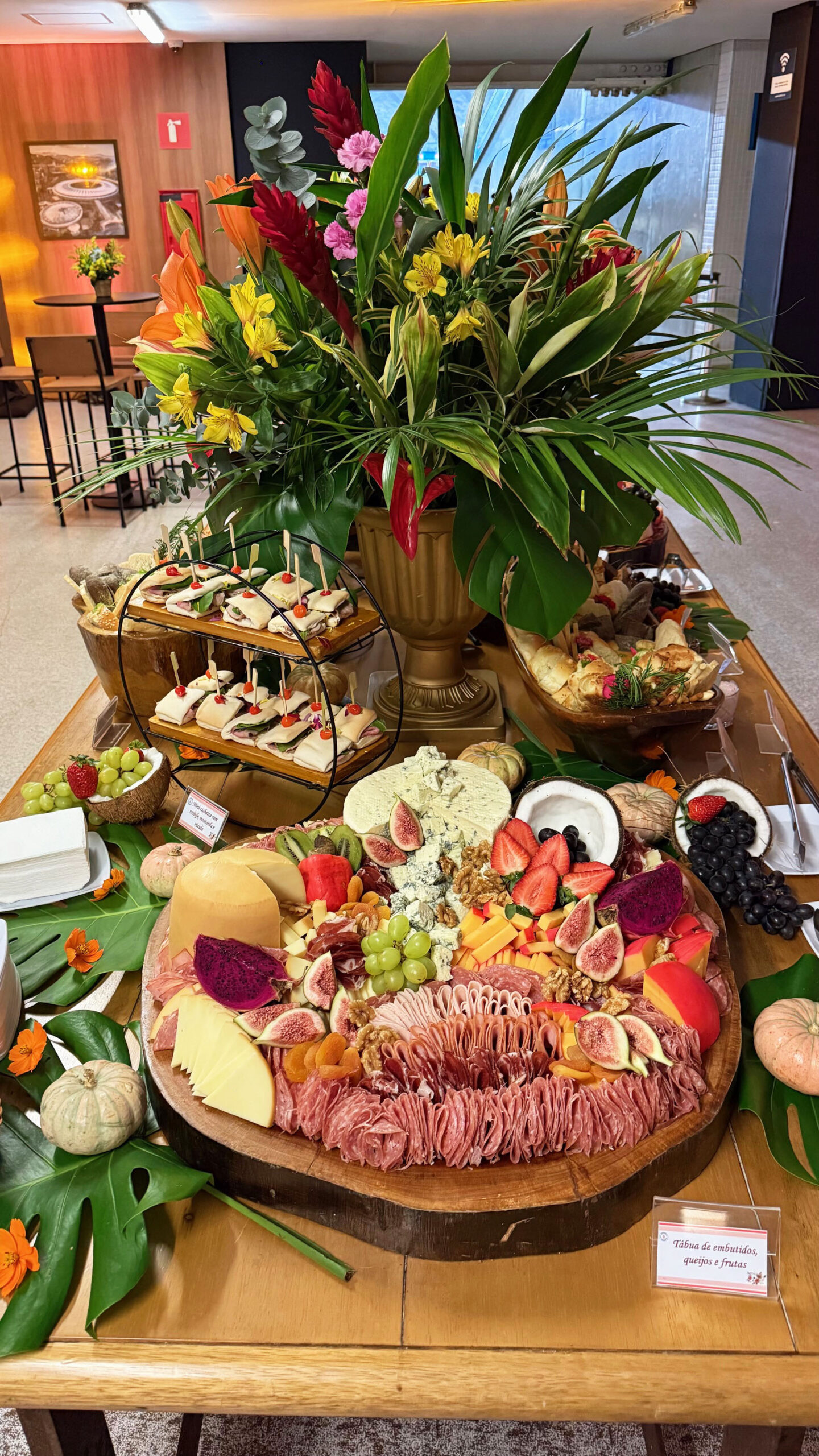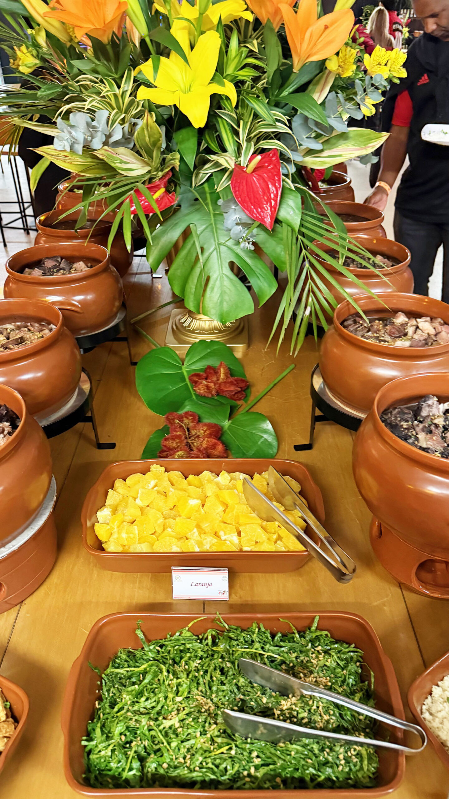 Para comer, você tem várias opções à disposição, incluindo pratos quentes. Uma mesa de frios com sanduíches, além de outra mesa com feijoada completa, eram as opções. Além disso, o serviço volante servia canapés e salgadinhos.