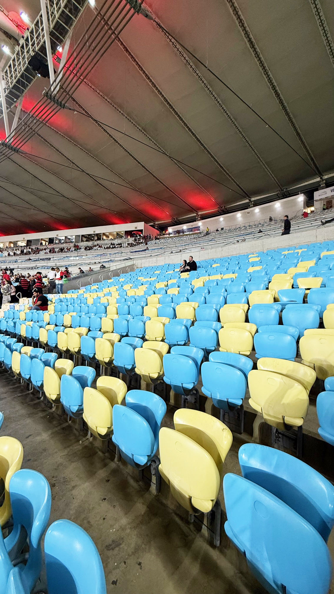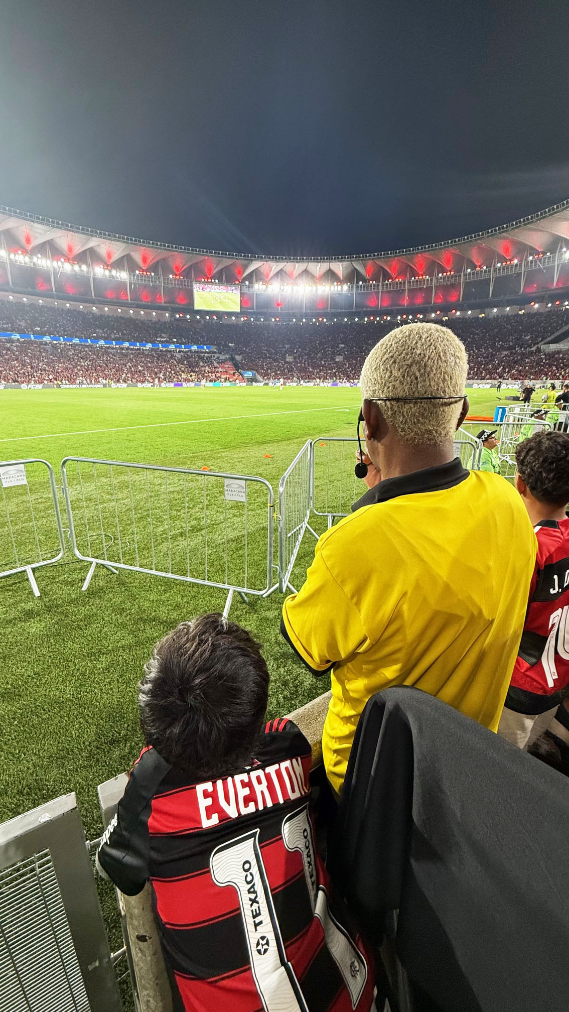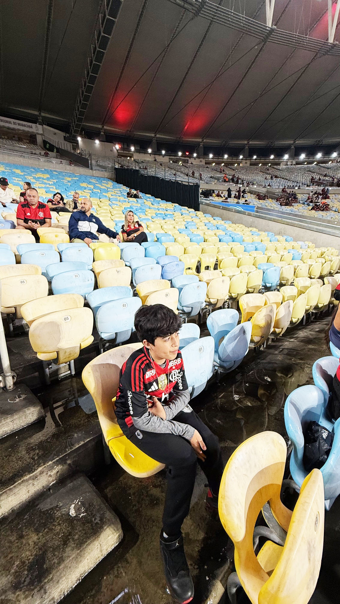 Aqui vale uma informação importante: nessa área você consegue ficar o mais próximo possível do gramado. O Lipe quis ficar na mureta, assistindo ao jogo o tempo inteiro em pé. Aliás, ninguém assiste ao jogo sentado nessa área. Já no Maracanã Mais, é obrigatório assistir sentado.