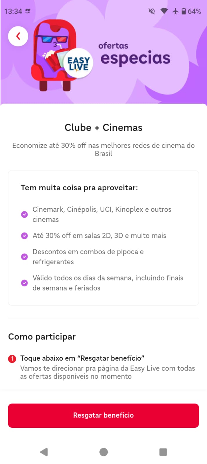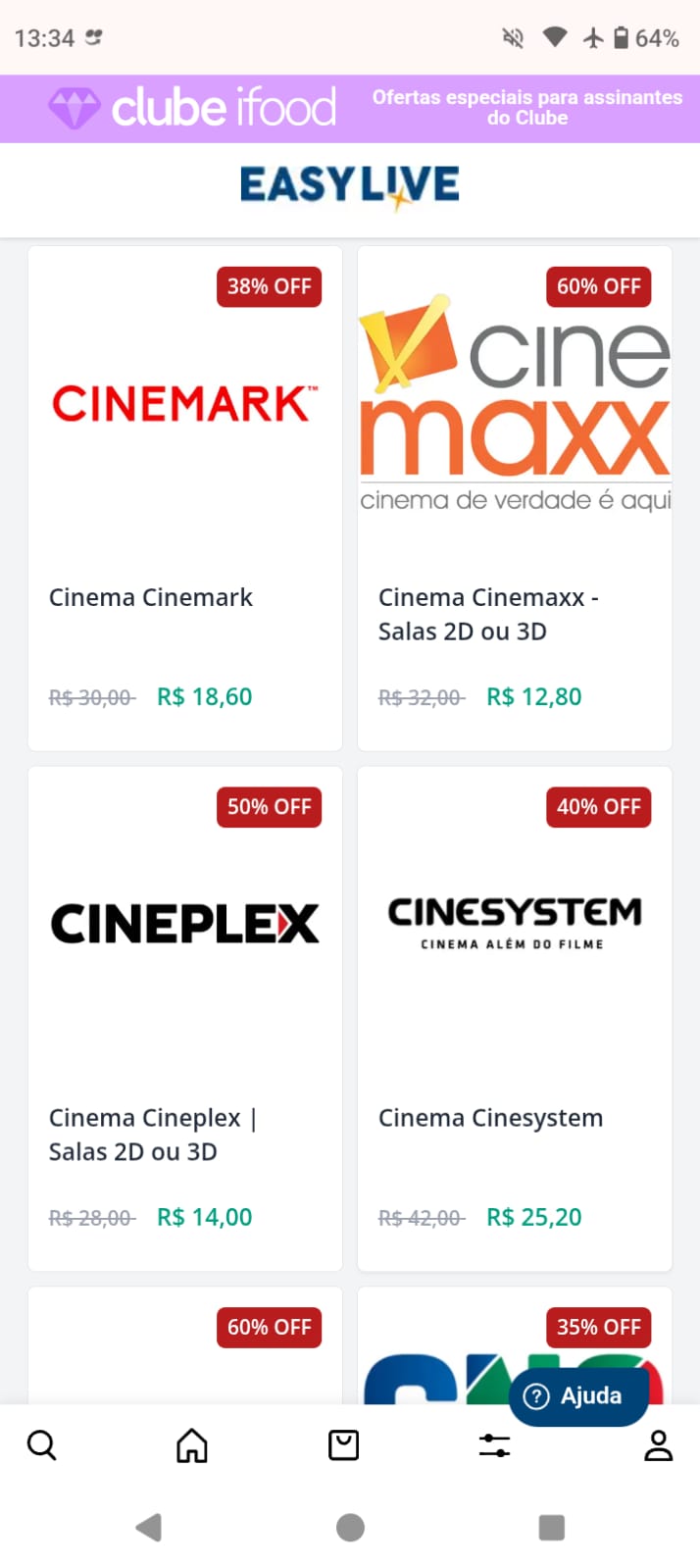 Uma novidade recente no aplicativo pode ser interessante para garantir ingressos para cinema mais baratos. Em parceria com a Easylive, assinantes do Clube iFood podem garantir até 30% de desconto em entradas e combos.