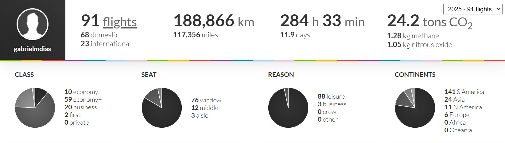 Nos voos nacionais, a GOL acabou sendo minha principal escolha, com 50 voos no ano. Gosto muito da Azul, mas quem viaja com frequência sabe: ou é excelente no preço ou completamente fora da realidade. Já a LATAM… sigo evitando. A postura da empresa, especialmente o discurso do CEO, vai na contramão de tudo o que acredito sobre relacionamento com cliente e respeito ao passageiro.