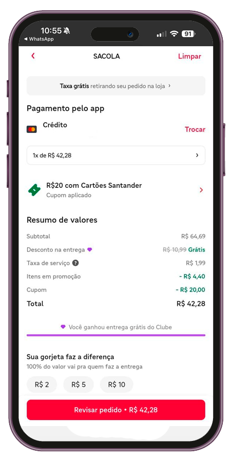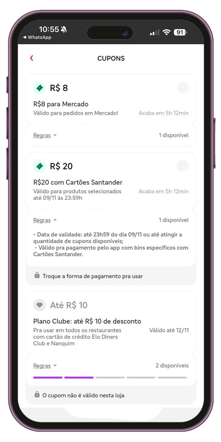 Adicione o seu cartão como forma de pagamento no iFood e ao realizar o pedido, selecione o cupom de R$ 20,00 com cartão Santander. A opção vai aparecer caso sua compra seja elegível ao desconto. Você precisará pagar a compra com o cartão de crédito do banco para que a oferta valide.