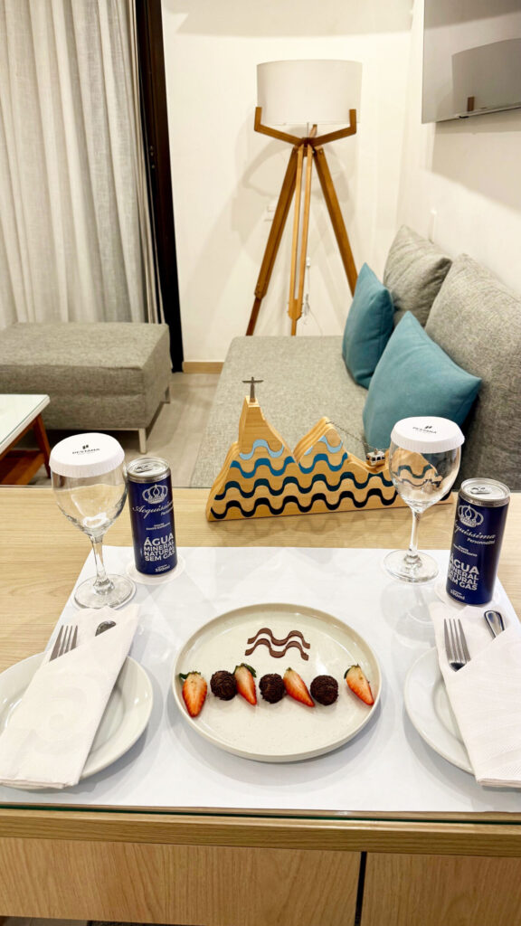 A suíte é ampla e bem distribuída, o que transmite sensação de conforto e liberdade. Cada detalhe do ambiente foi pensado para tornar a estadia prática e aconchegante: cama espaçosa, sala de estar integrada e decoração clean que valoriza ainda mais a vista privilegiada.