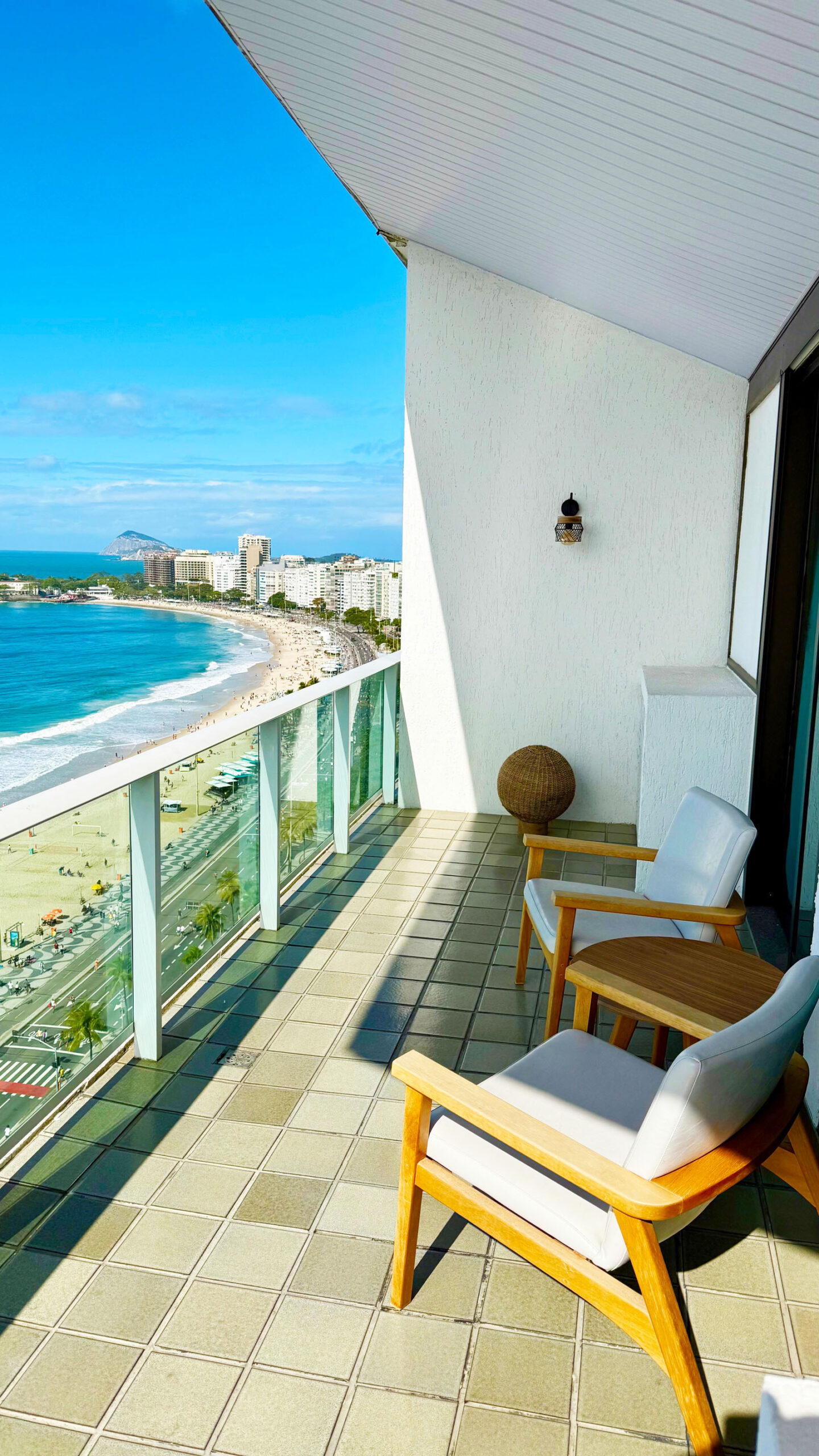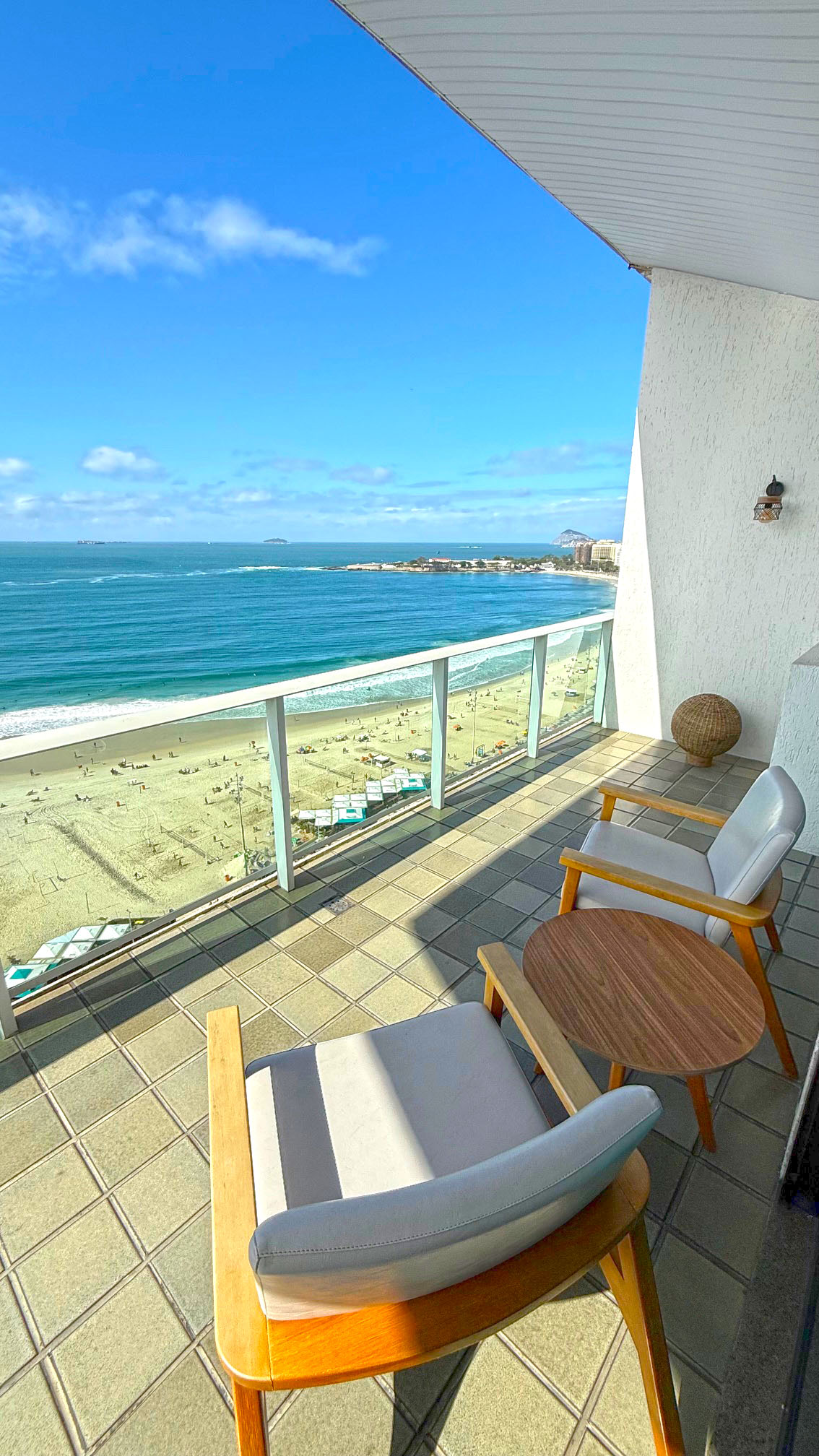 Eu fiquei hospedado na Suíte Oceânica e a experiência foi realmente especial. Logo ao entrar, a vista para o mar de Copacabana chama a atenção e transforma o ambiente em um verdadeiro cartão-postal. As amplas varandas permitem contemplar o horizonte a qualquer hora do dia, seja para apreciar o nascer do sol ou relaxar ao fim da tarde. A abundância de luz natural deixa o espaço ainda mais agradável, criando uma atmosfera leve e acolhedora.
