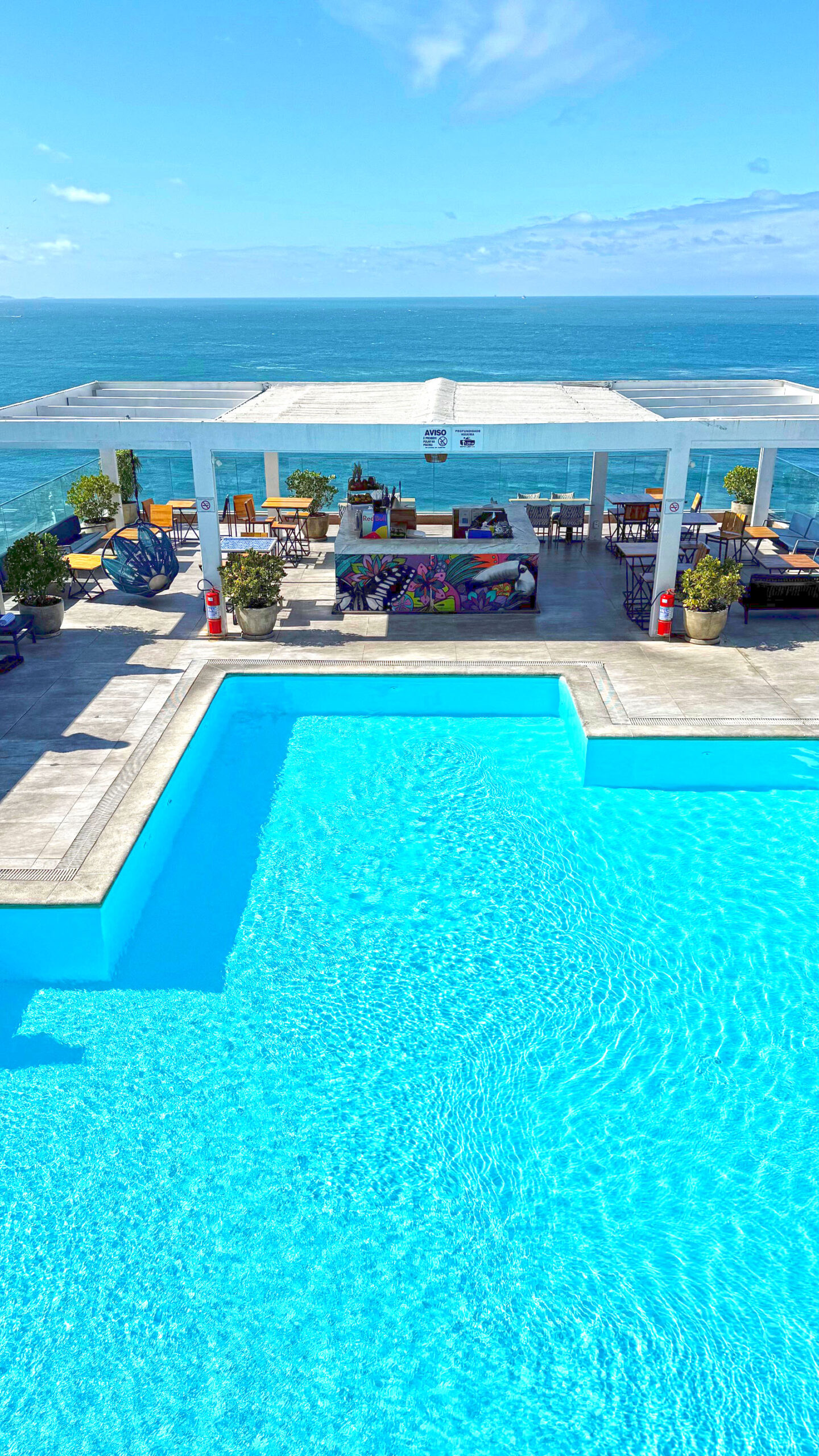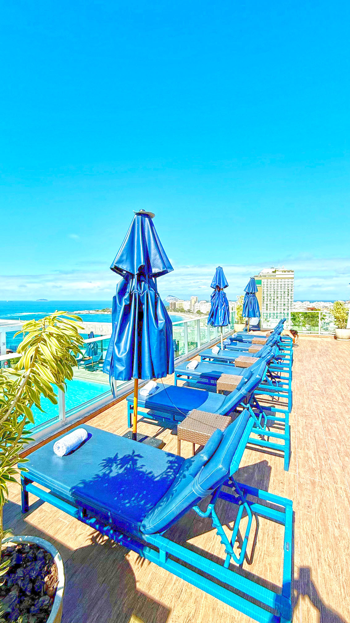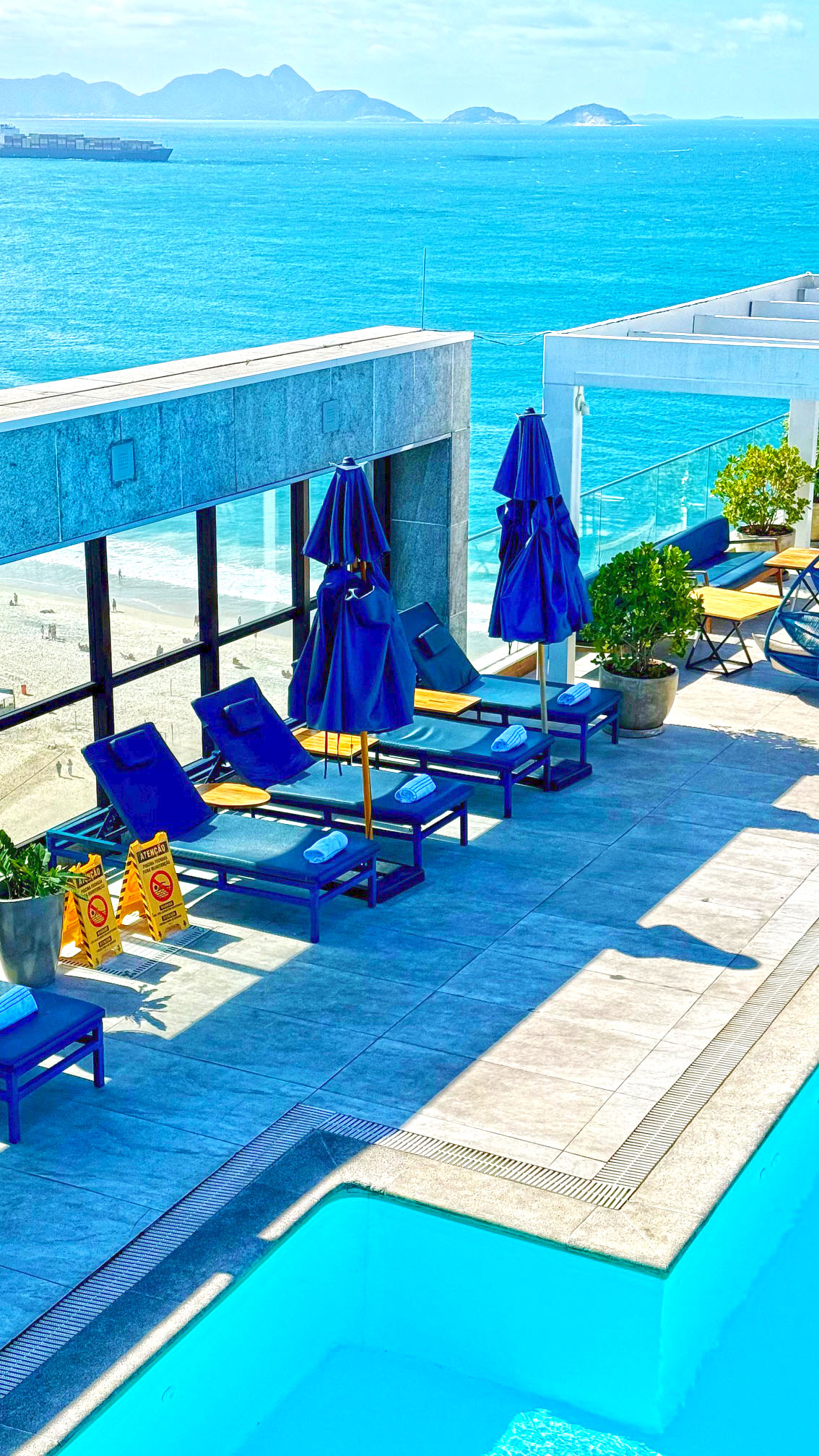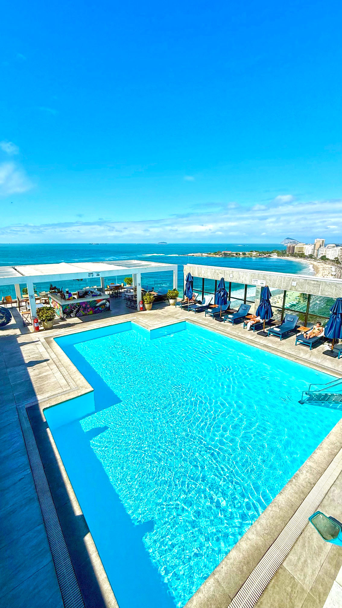 A área de lazer do Pestana Rio Atlântica é um dos pontos altos da hospedagem. O destaque vai para a piscina localizada na cobertura, que oferece uma vista panorâmica incrível da Praia de Copacabana e do mar carioca. É o lugar perfeito para relaxar durante o dia, aproveitar o sol e ainda registrar fotos que traduzem bem a experiência única de estar no Rio.