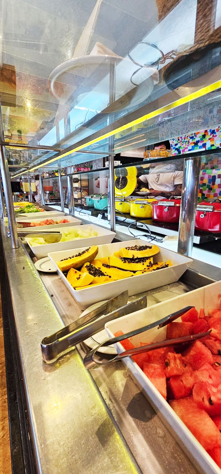 Um dos destaques é a possibilidade de pedir tapiocas feitas na hora, além de pequenas surpresas, como água de coco, que dão um charme especial à refeição e deixam o início do dia mais prazeroso.