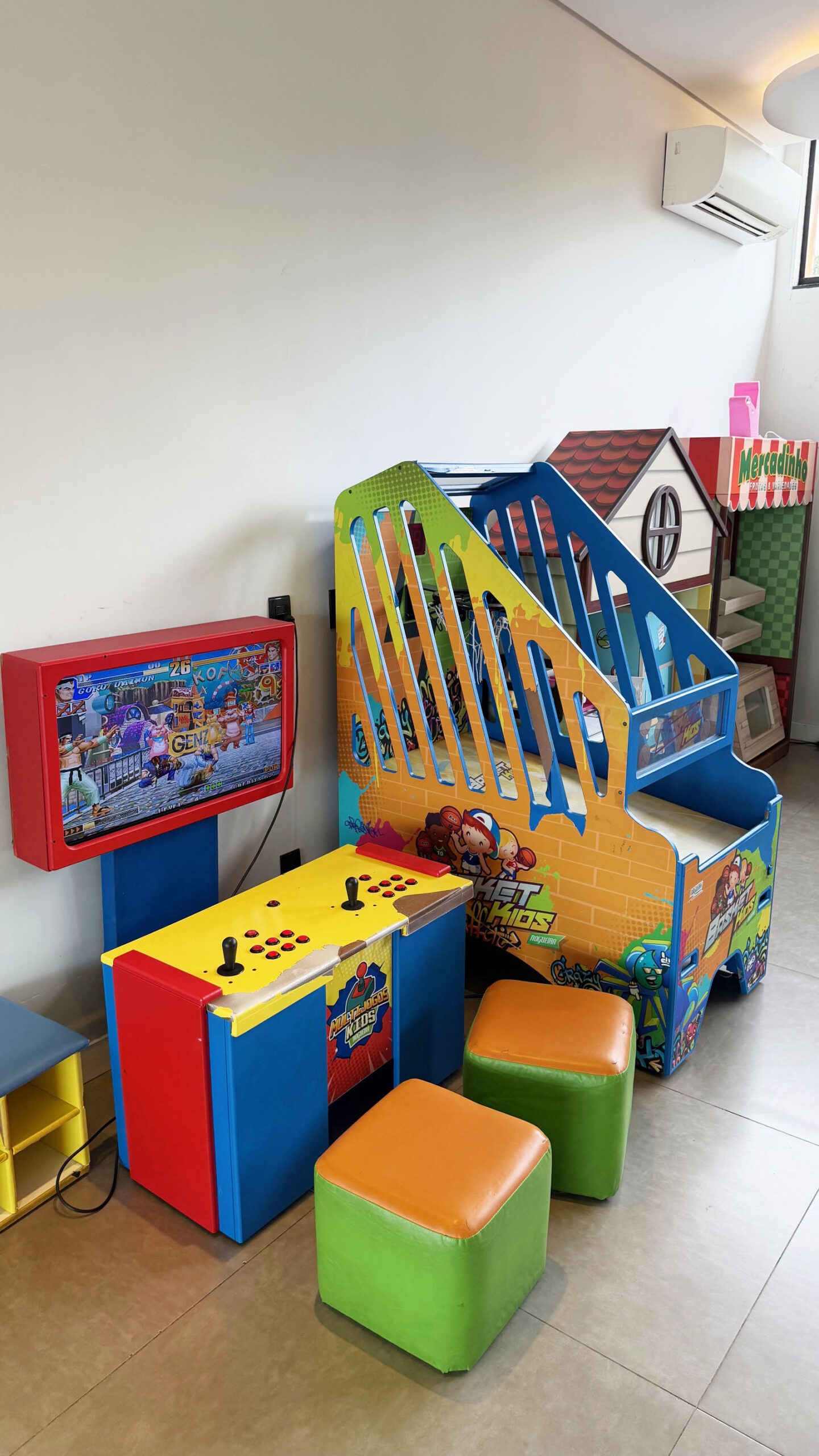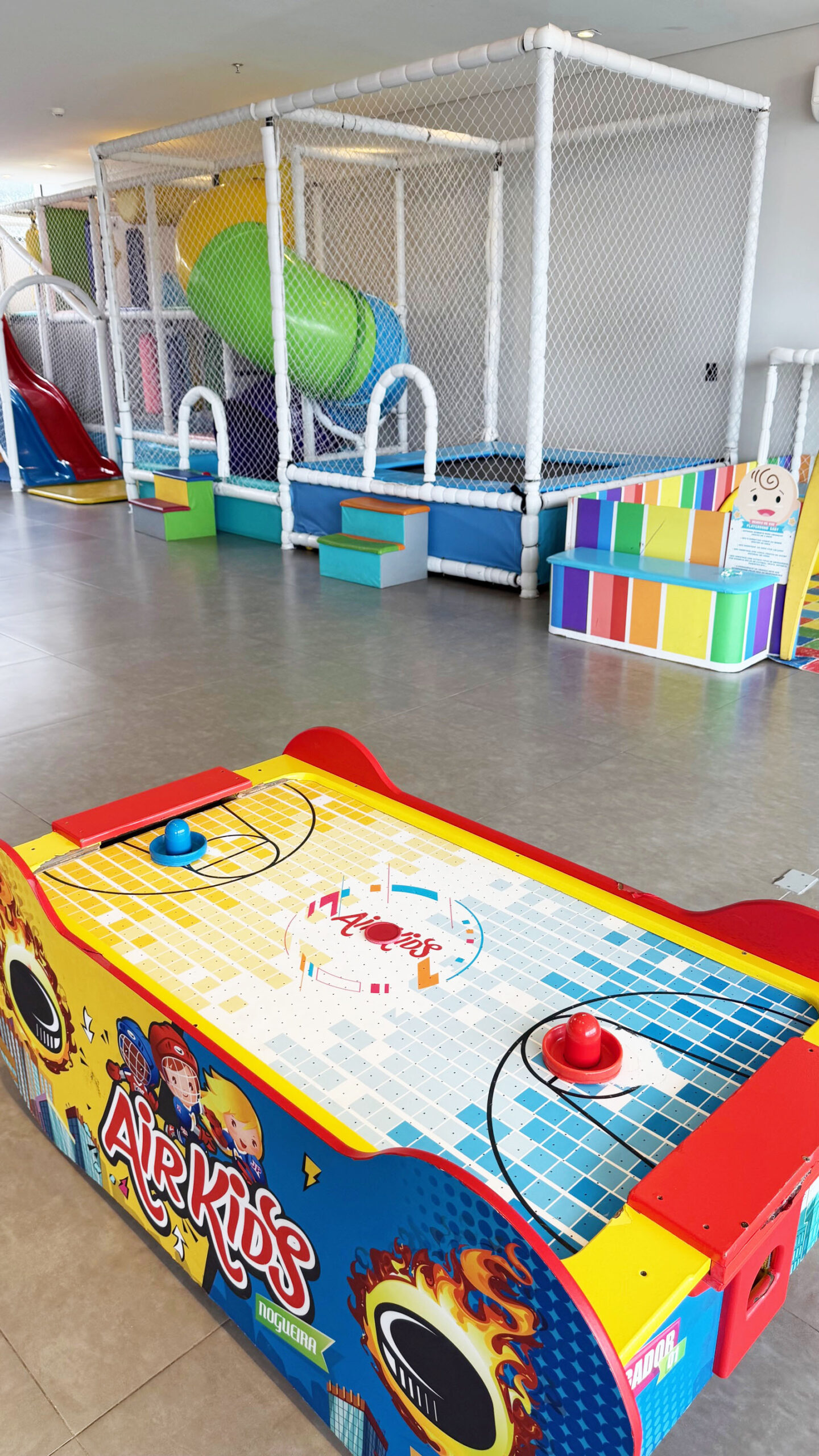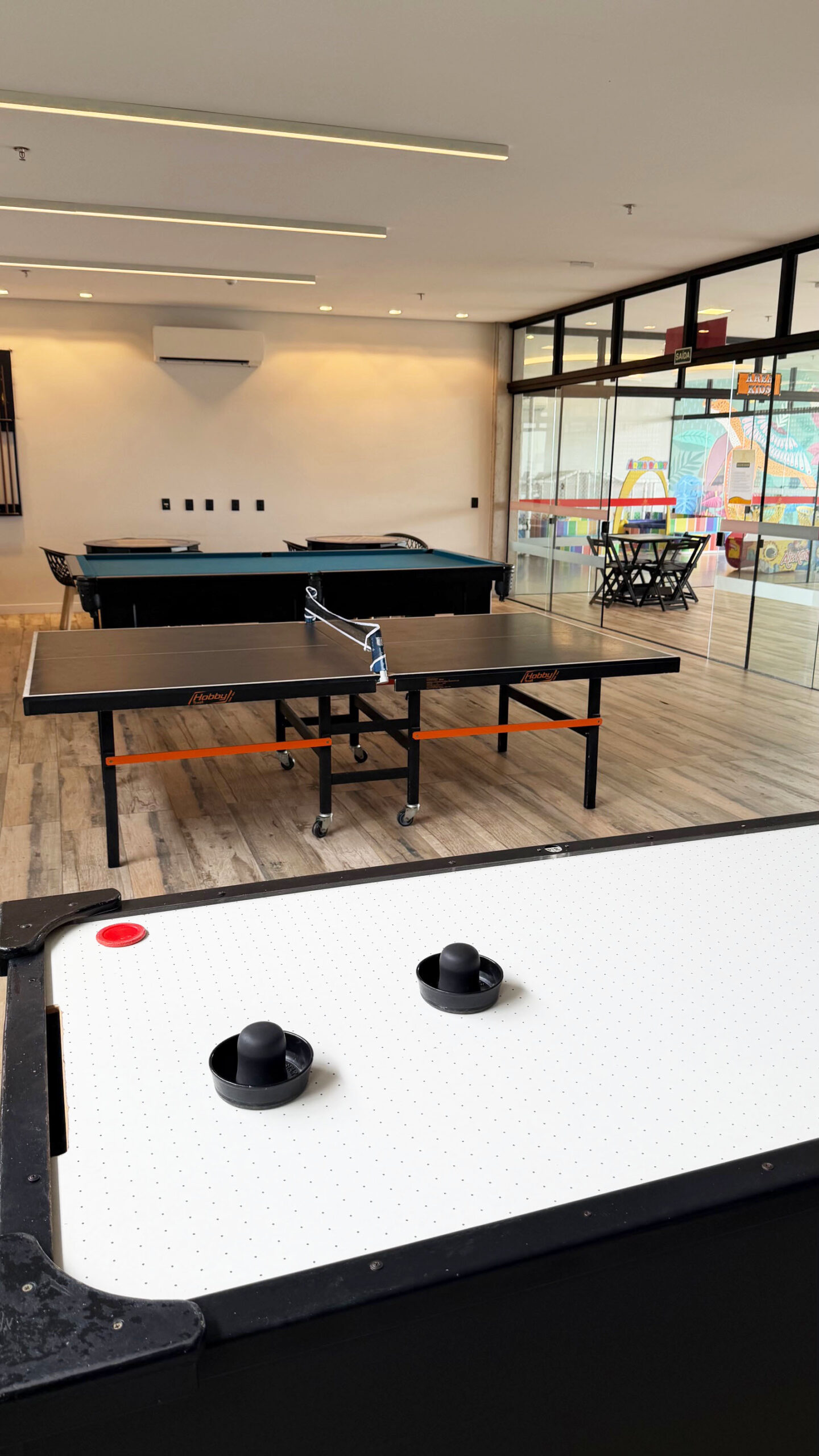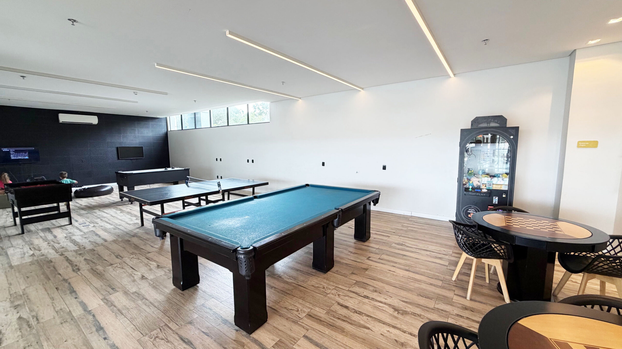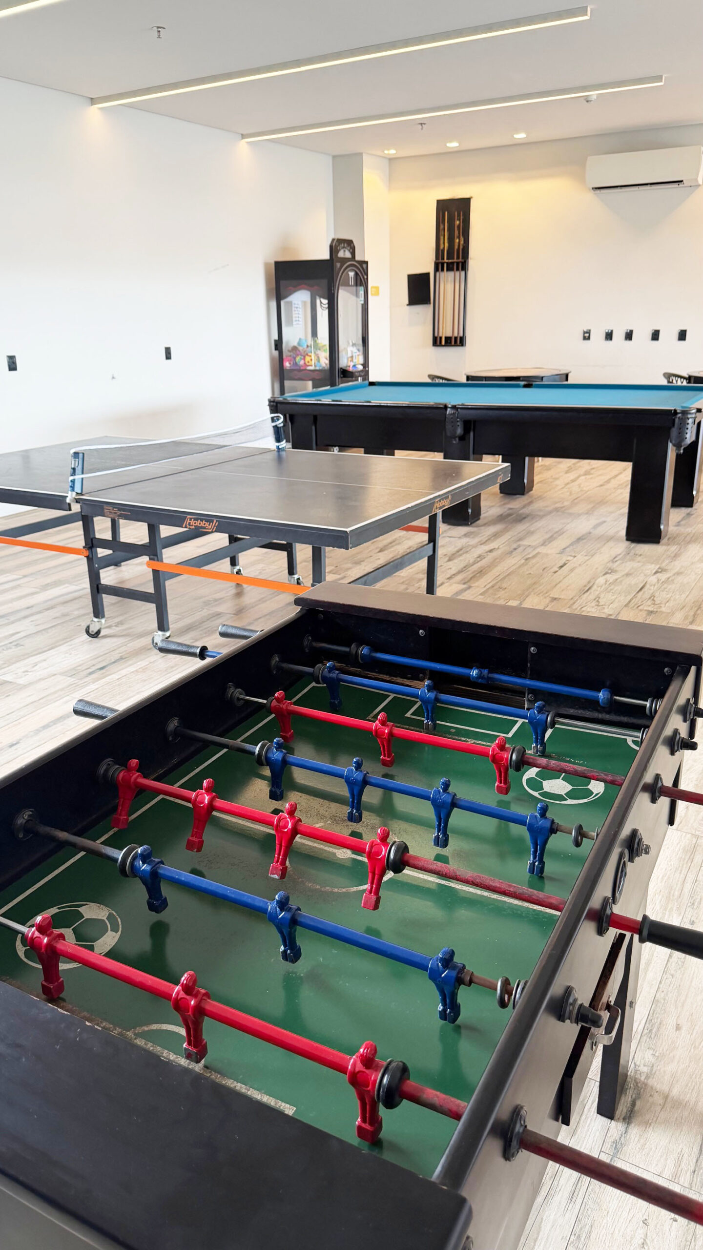 O entretenimento continua nos espaços internos, com um salão de jogos completo e um moderno game center que reúnem opções como sinuca, tênis de mesa, fliperamas e jogos eletrônicos. A estrutura também conta com academia equipada, proporcionando equilíbrio entre lazer e bem-estar durante a estadia. Todos os ambientes foram pensados para promover convivência, conforto e diversão.