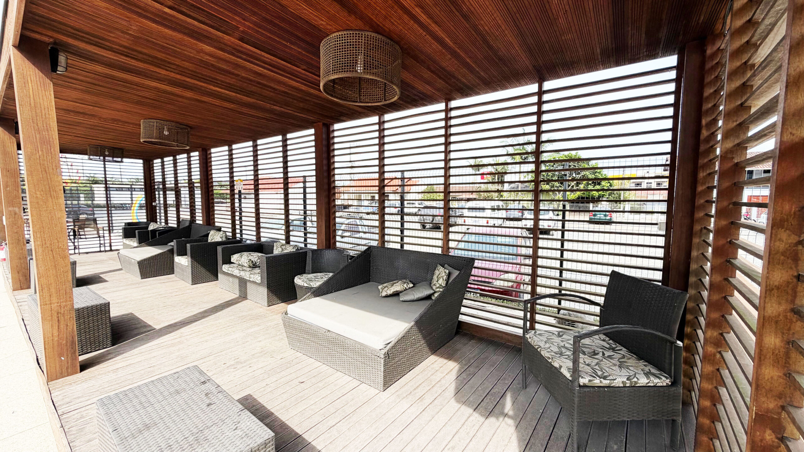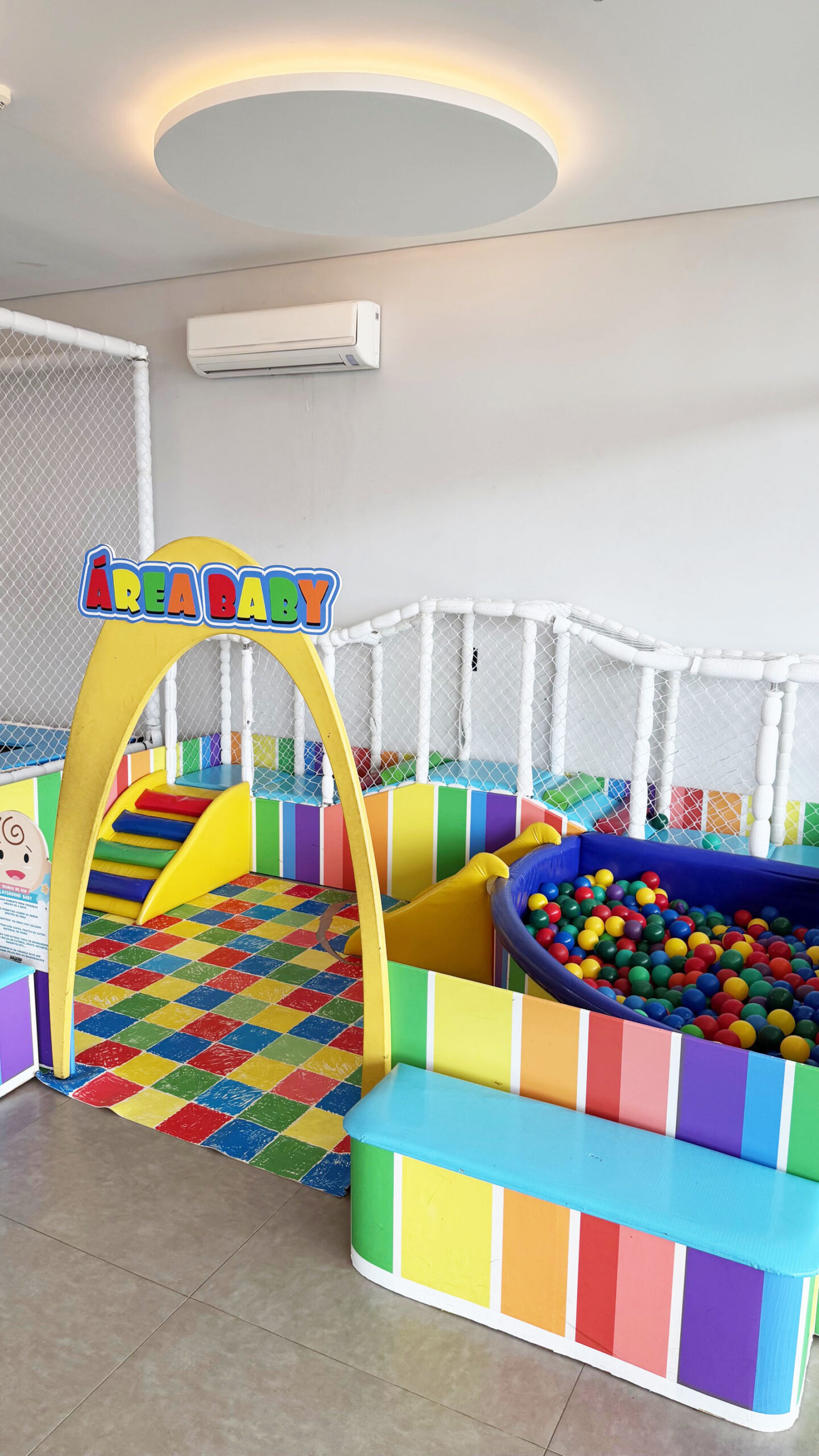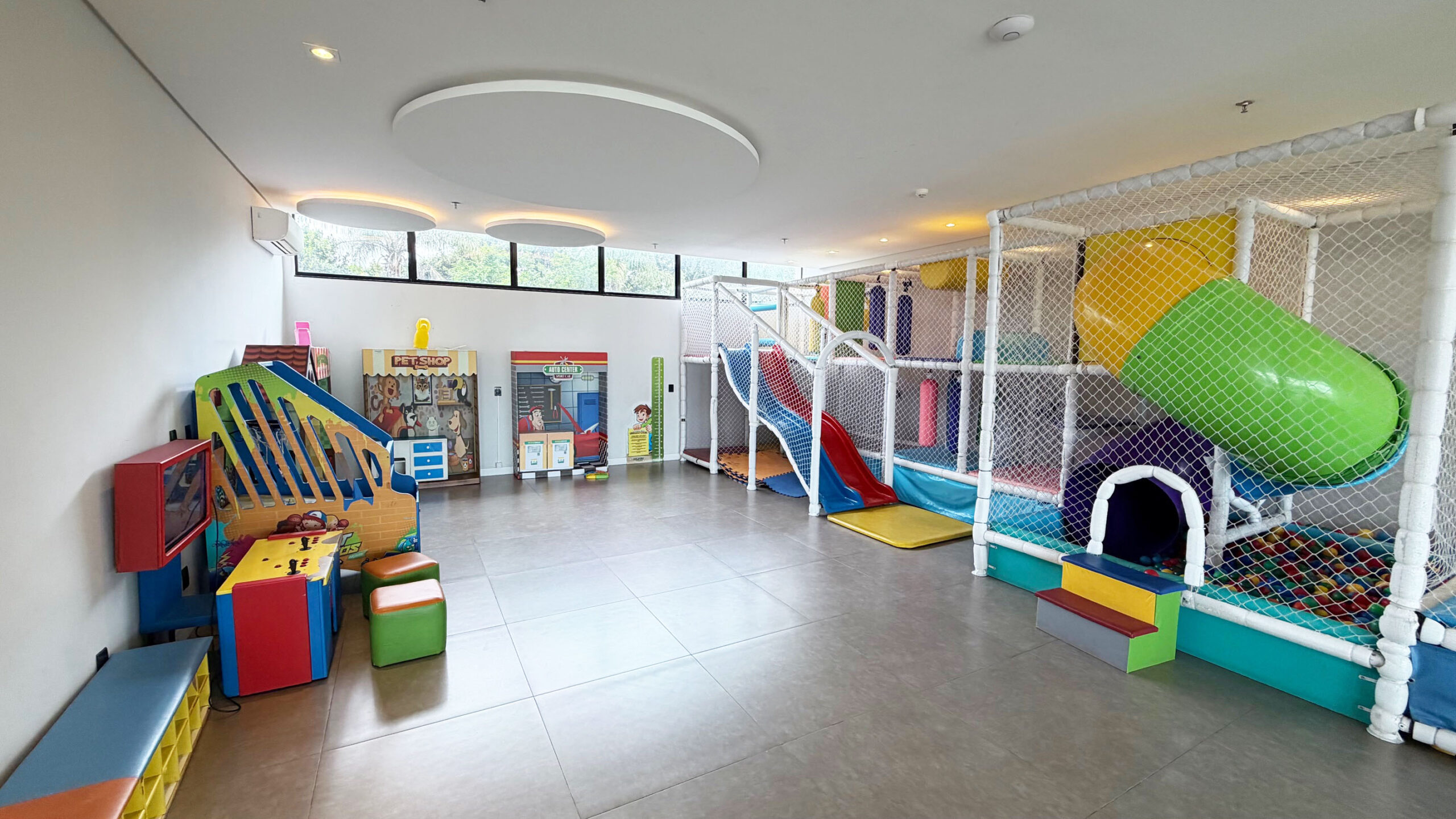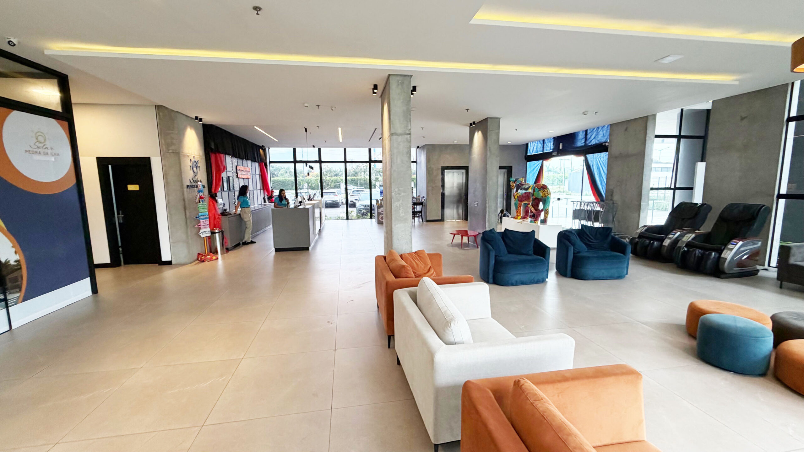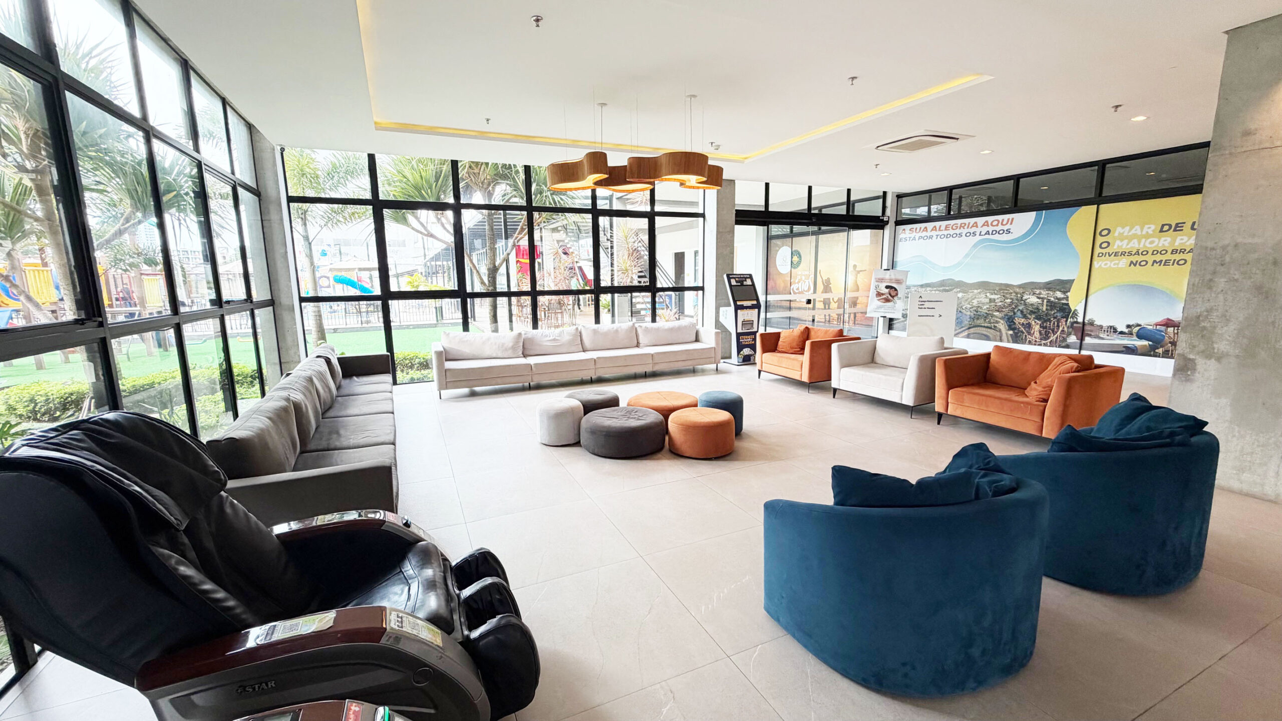 O lobby apresenta um ambiente amplo, moderno e acolhedor, com decoração contemporânea que combina conforto e estética. O espaço é iluminado por grandes janelas de vidro, que permitem a entrada de luz natural e revelam a área externa com jardins e playground.