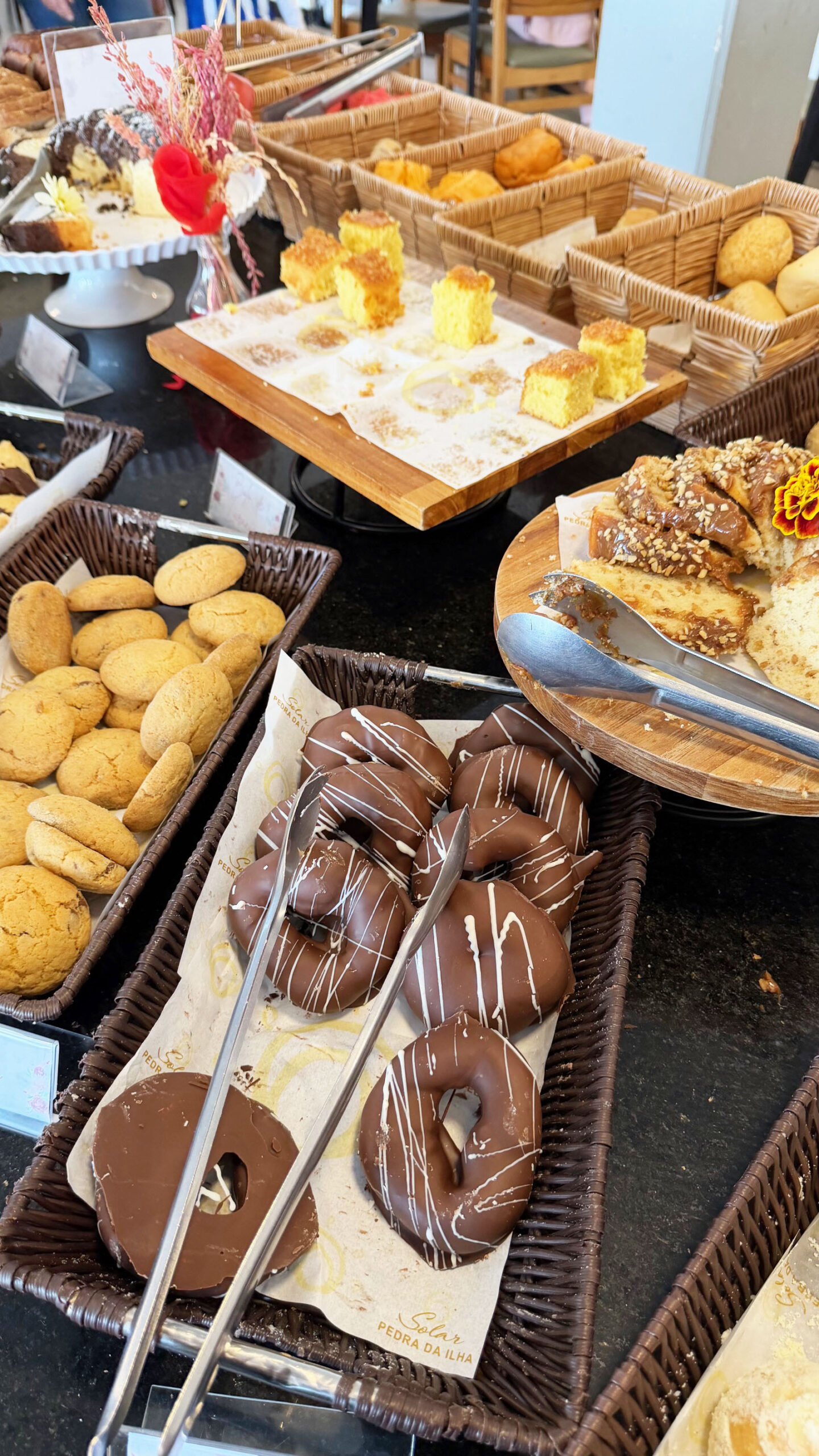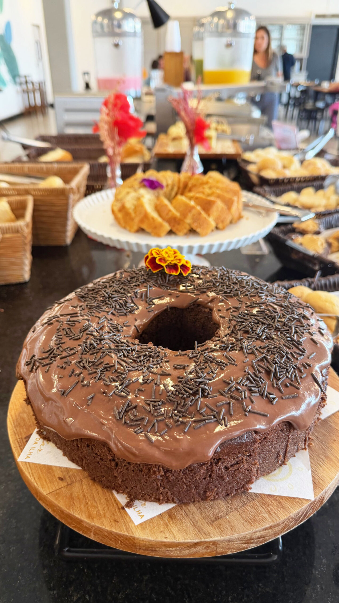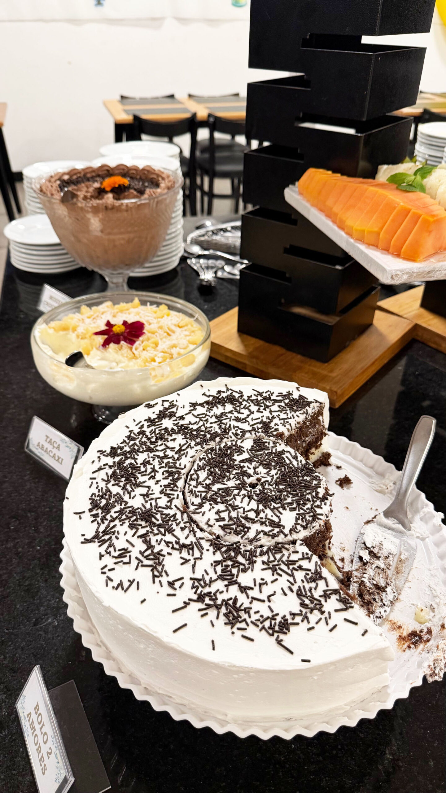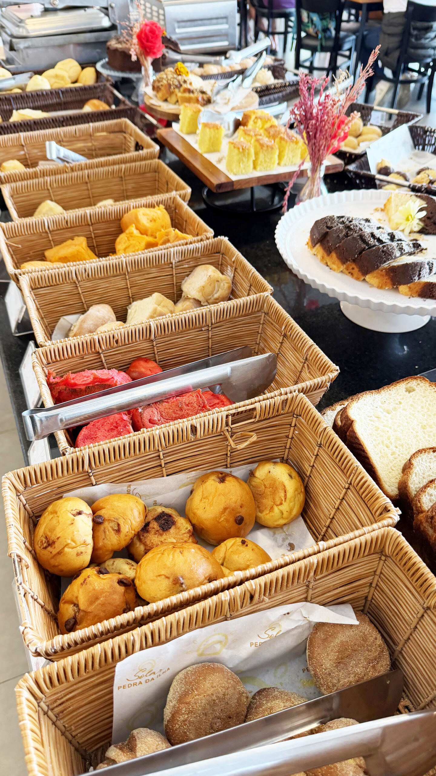 O café da manhã é completo e saboroso, com uma ampla variedade de opções: pratos quentes e frios, frutas frescas, pães, bolos, doces, sucos e diferentes tipos de café. Tudo é preparado com capricho para começar o dia da melhor forma possível.