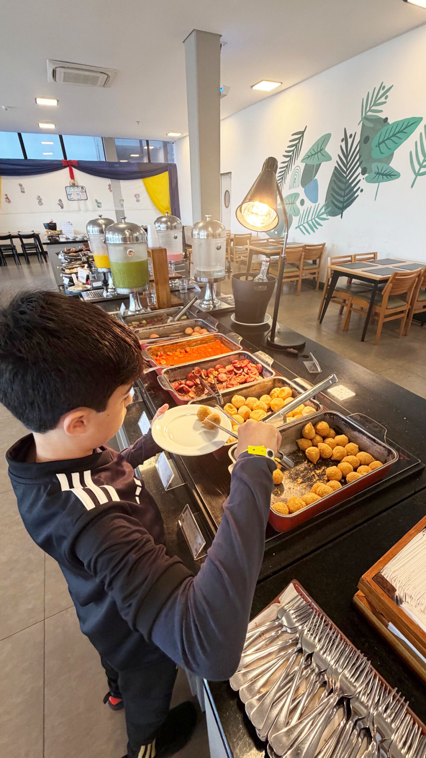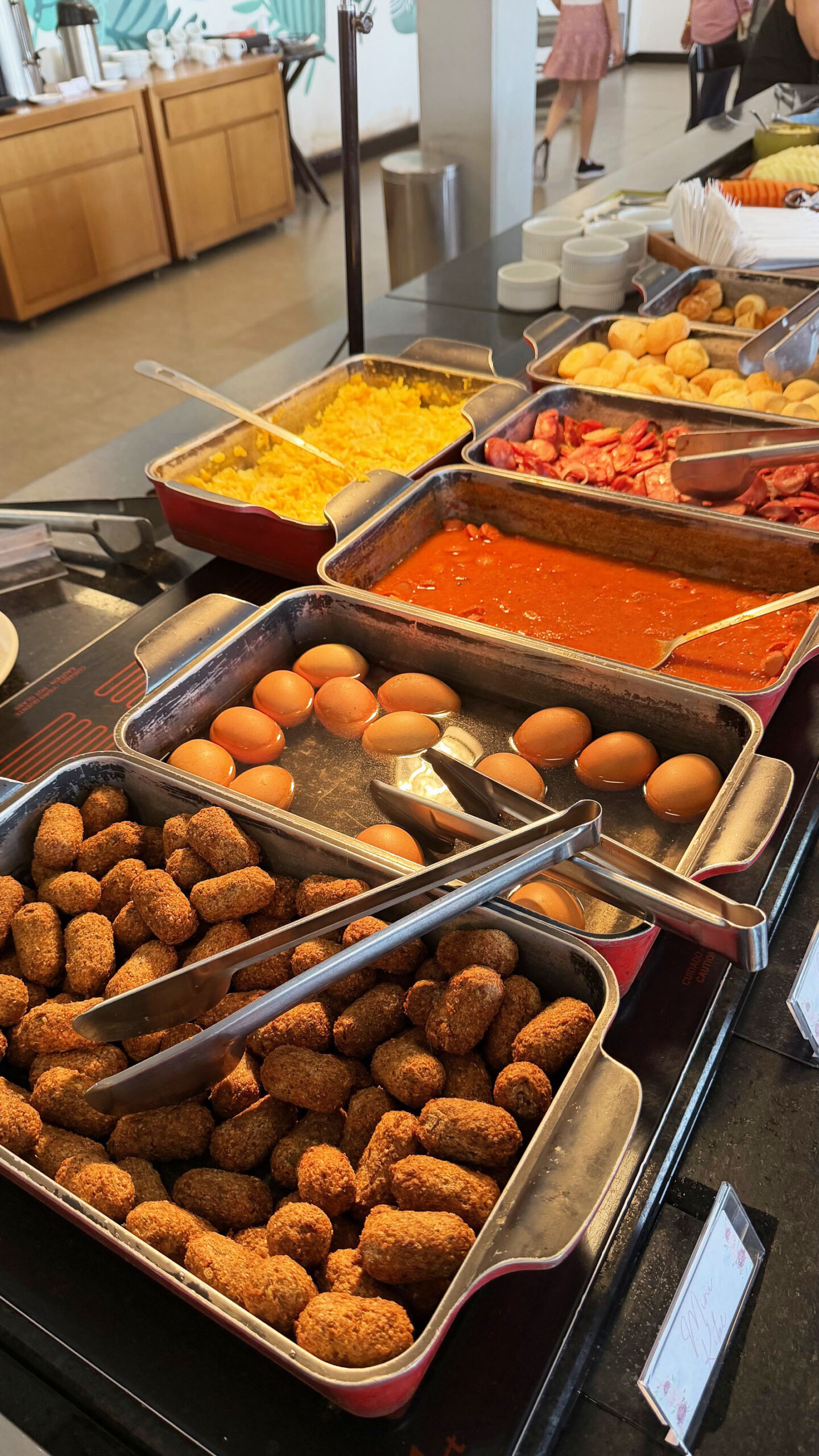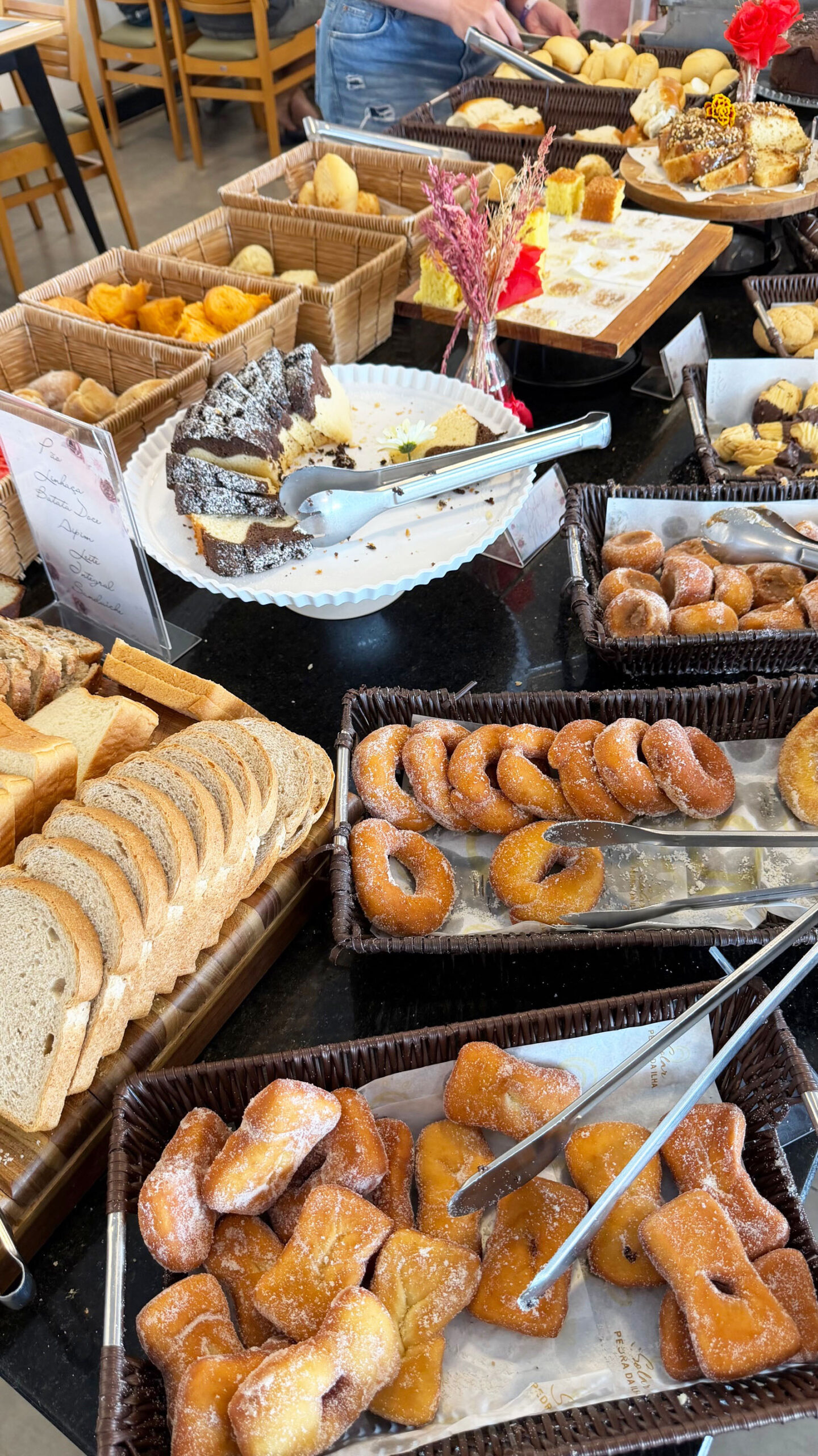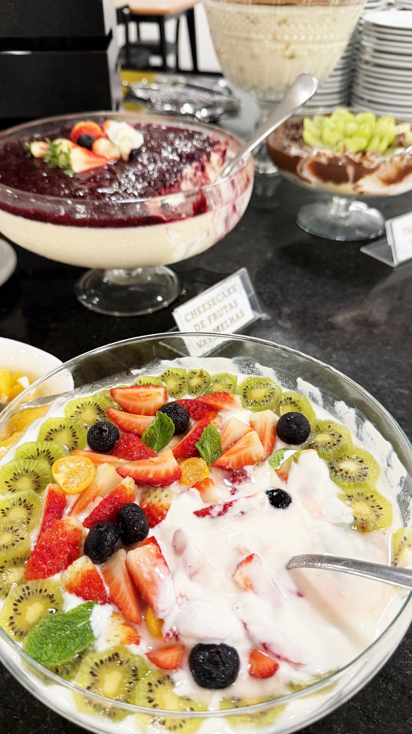 O café da manhã é completo e saboroso, com uma ampla variedade de opções: pratos quentes e frios, frutas frescas, pães, bolos, doces, sucos e diferentes tipos de café. Tudo é preparado com capricho para começar o dia da melhor forma possível.