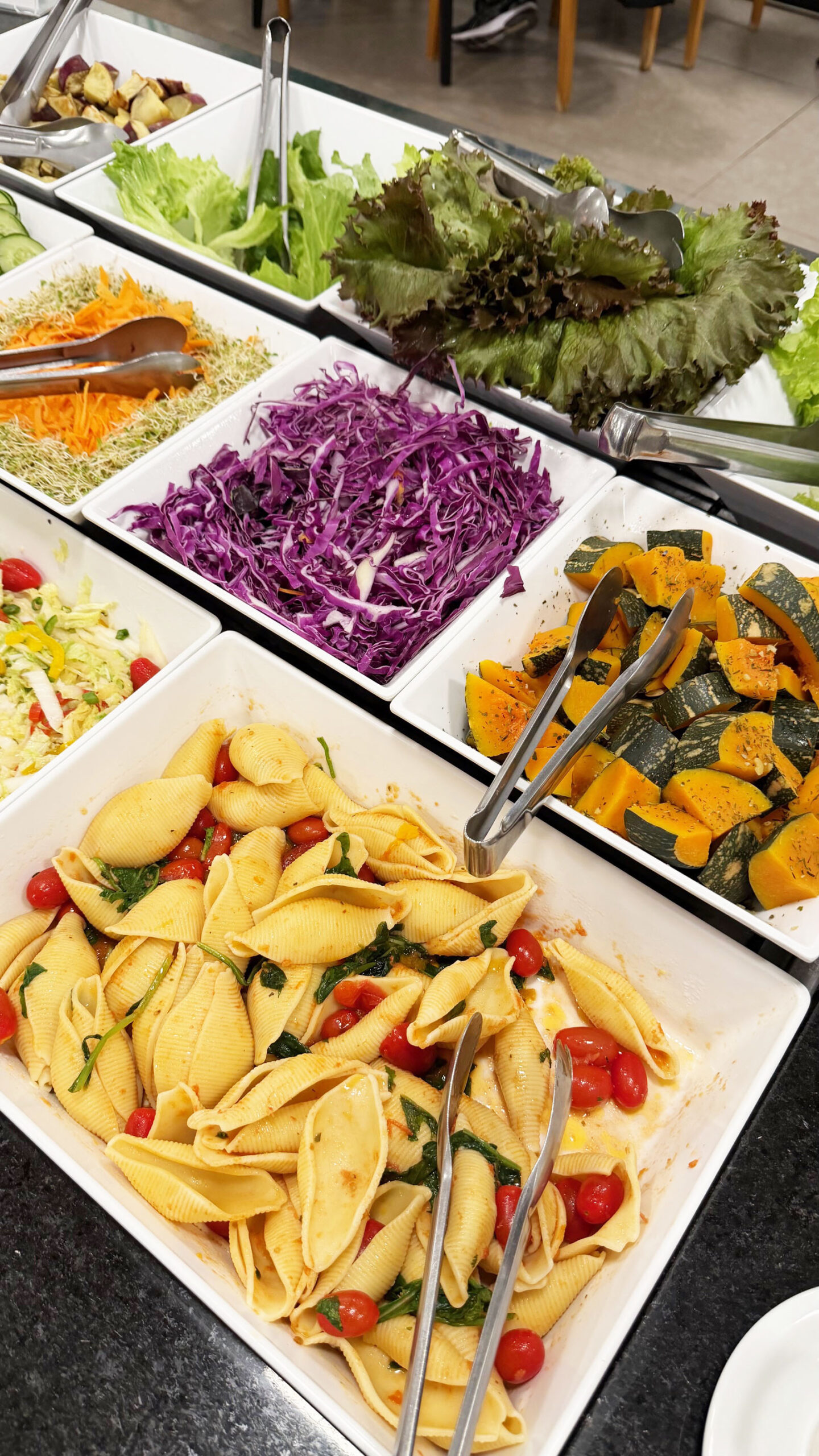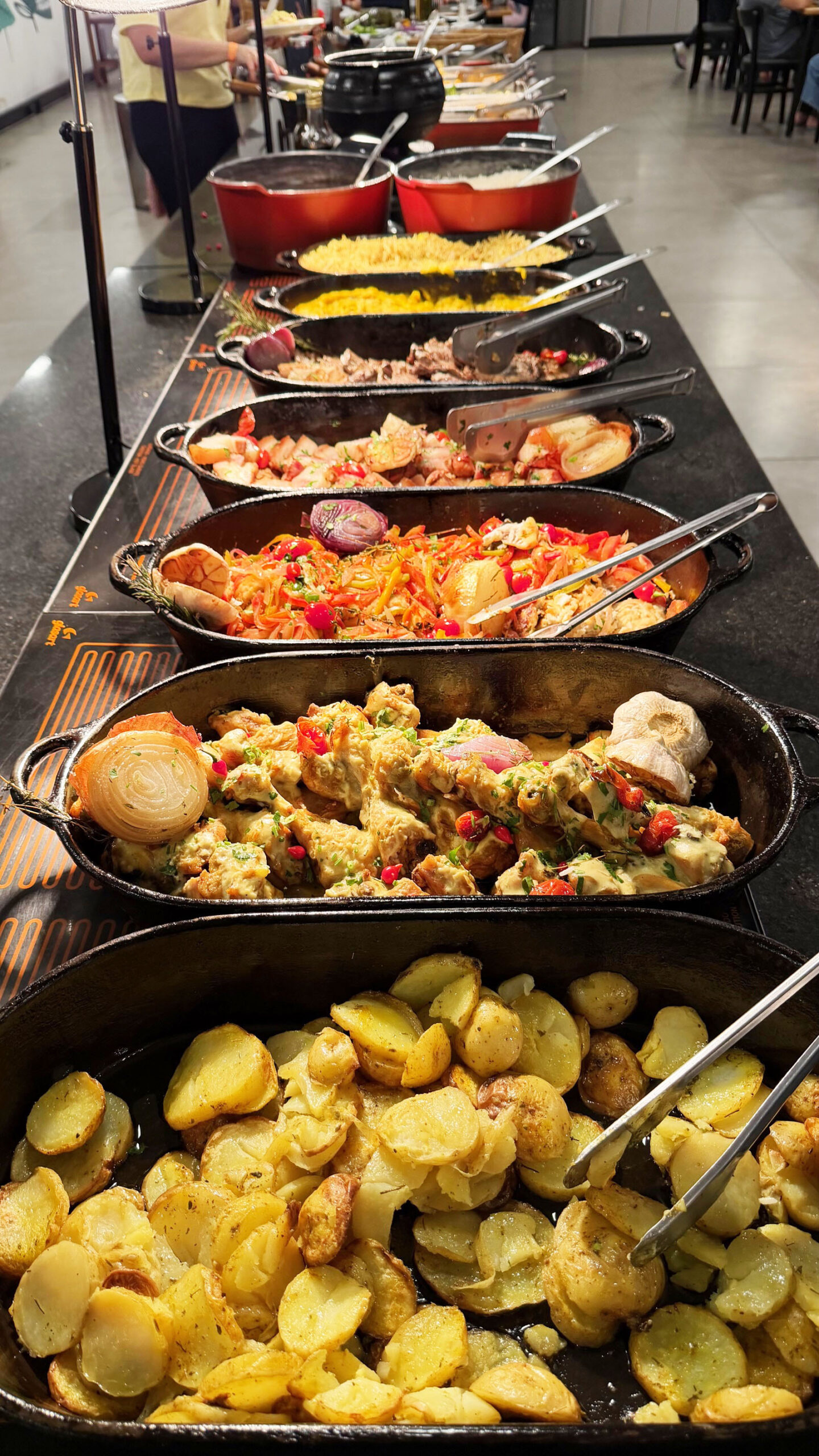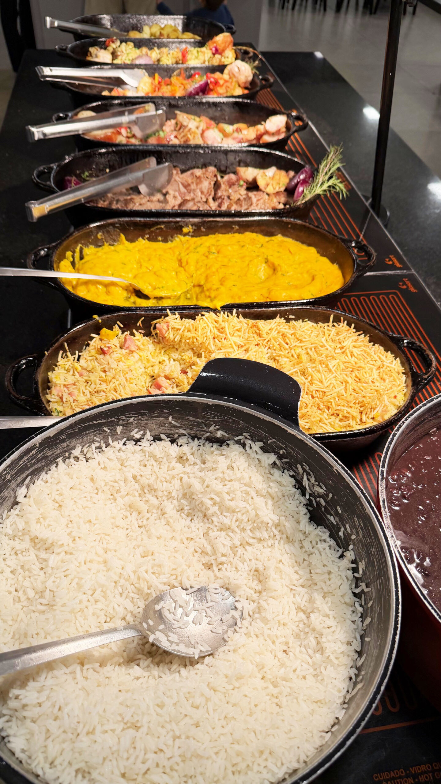 No jantar, o bufê mantém o mesmo padrão de qualidade e variedade, oferecendo saladas frescas, pratos quentes que mudam diariamente e até opções de sushi em algumas noites.