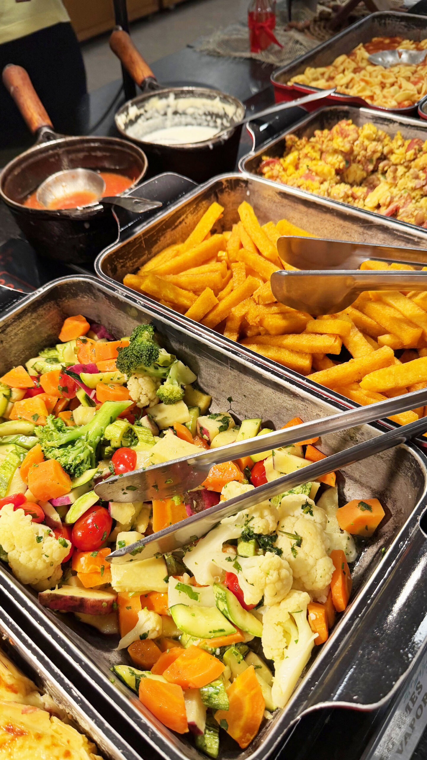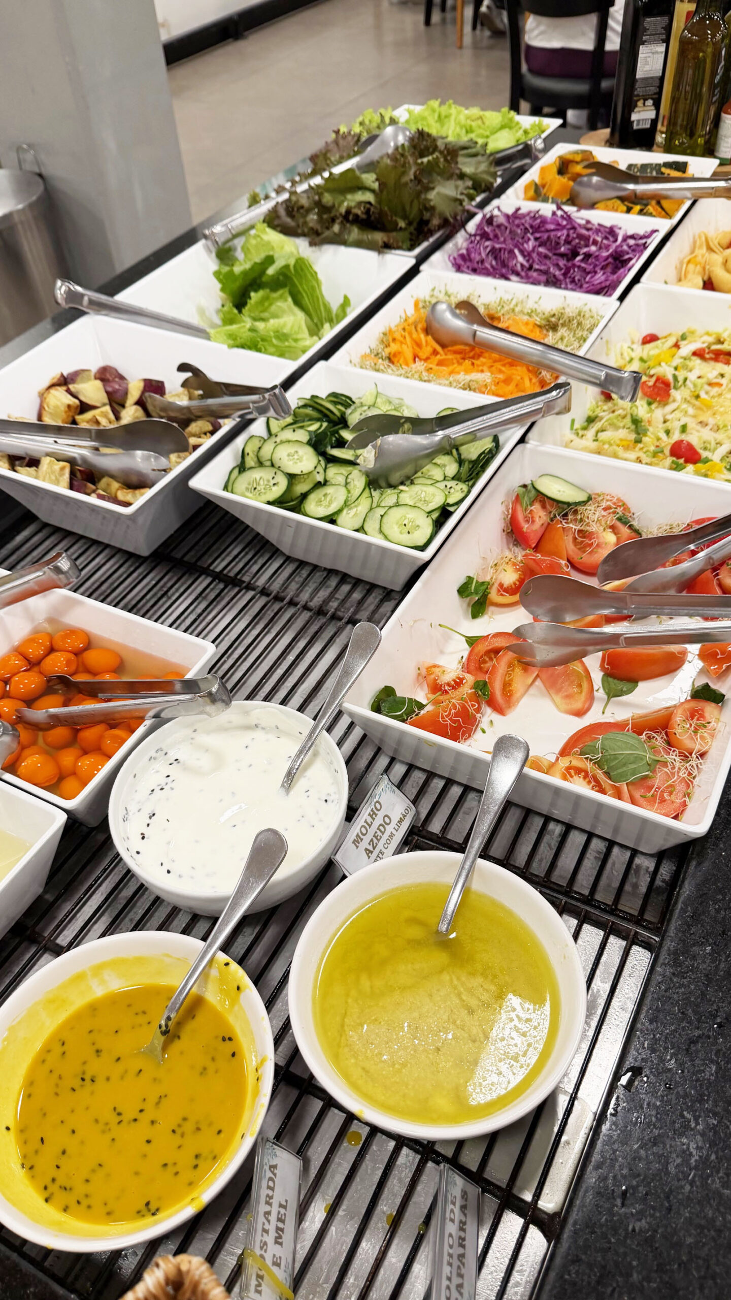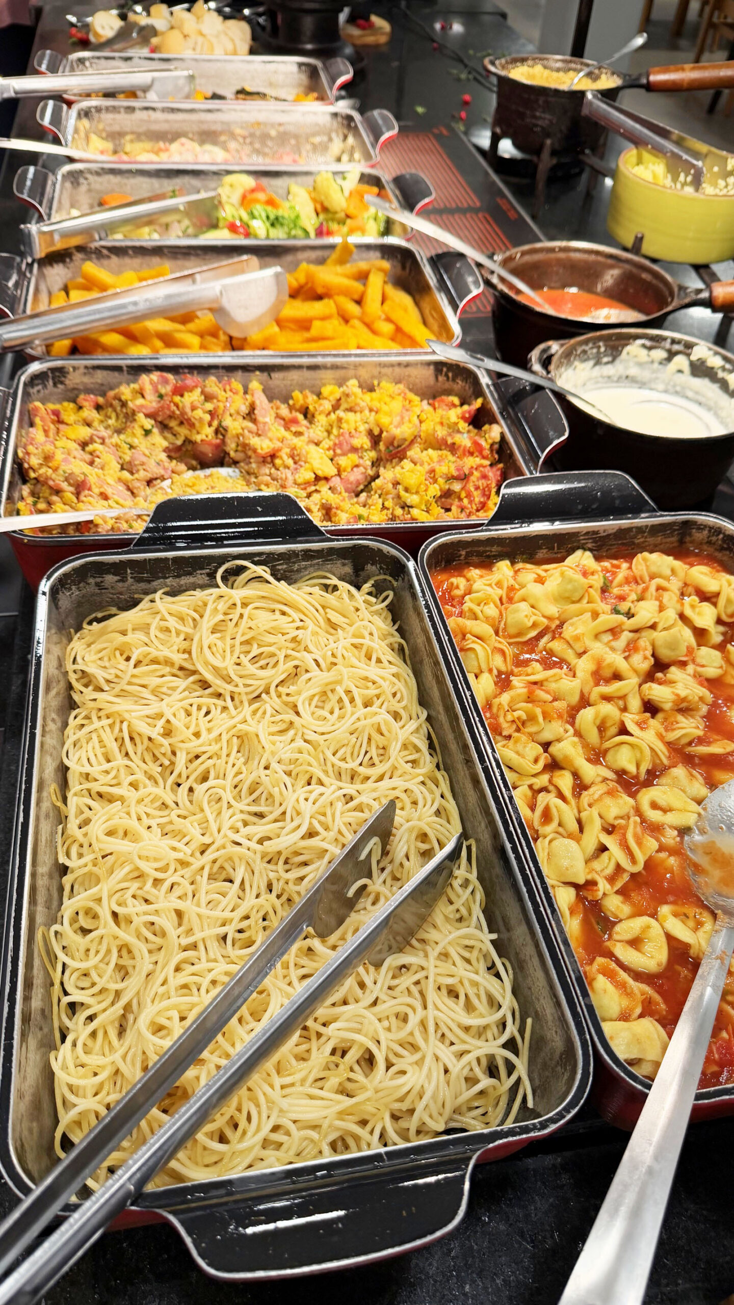 No jantar, o bufê mantém o mesmo padrão de qualidade e variedade, oferecendo saladas frescas, pratos quentes que mudam diariamente e até opções de sushi em algumas noites.